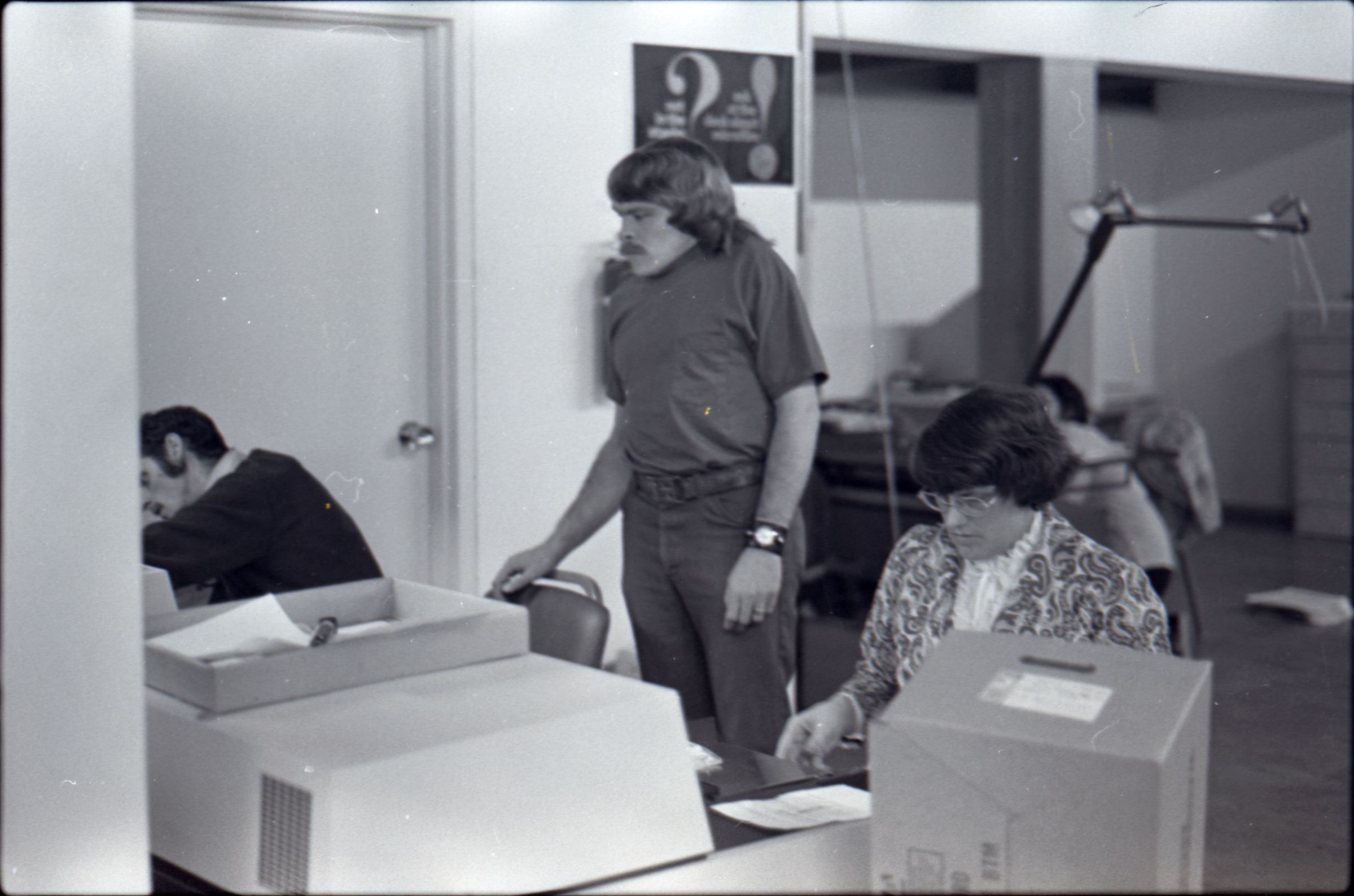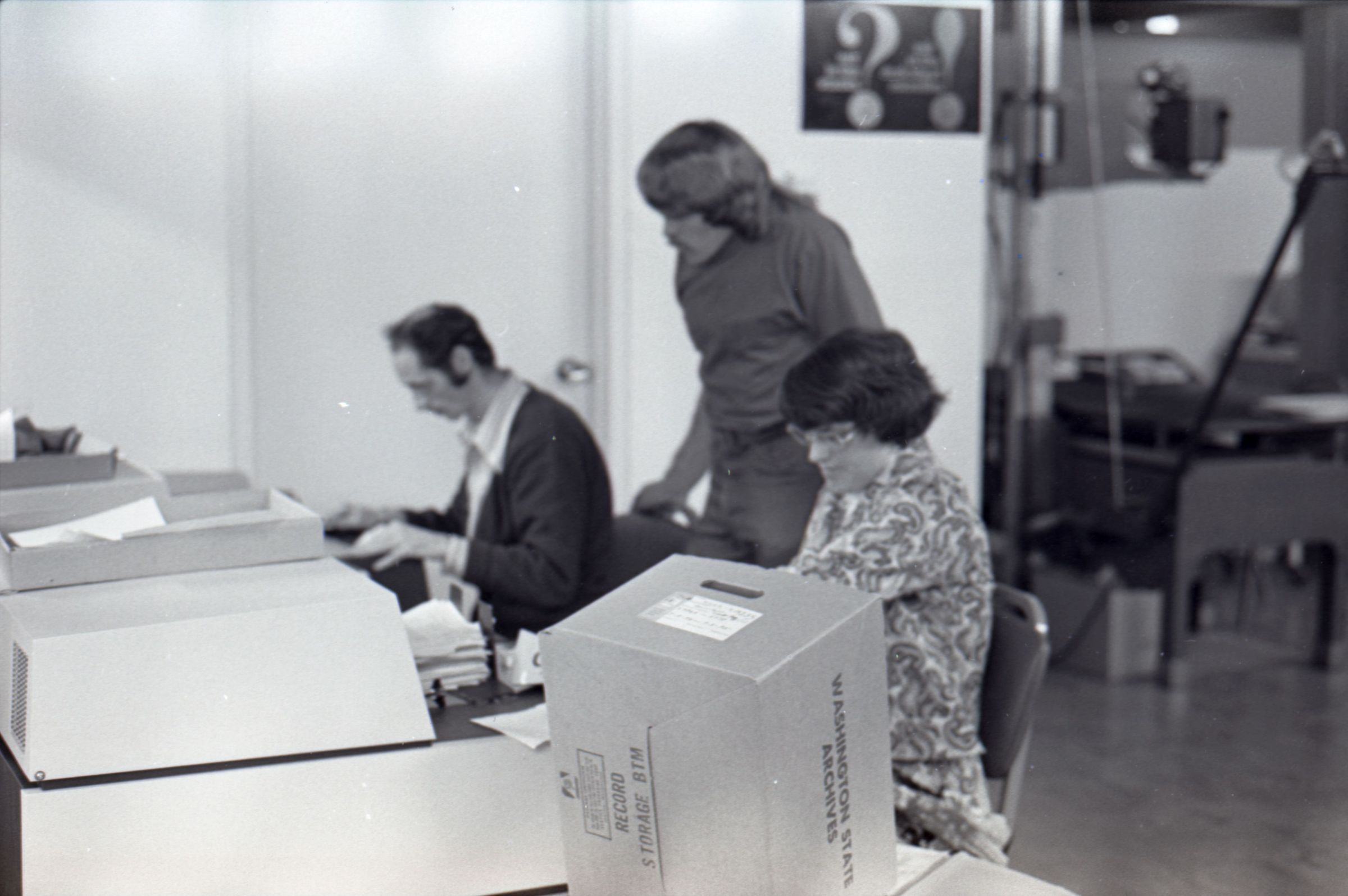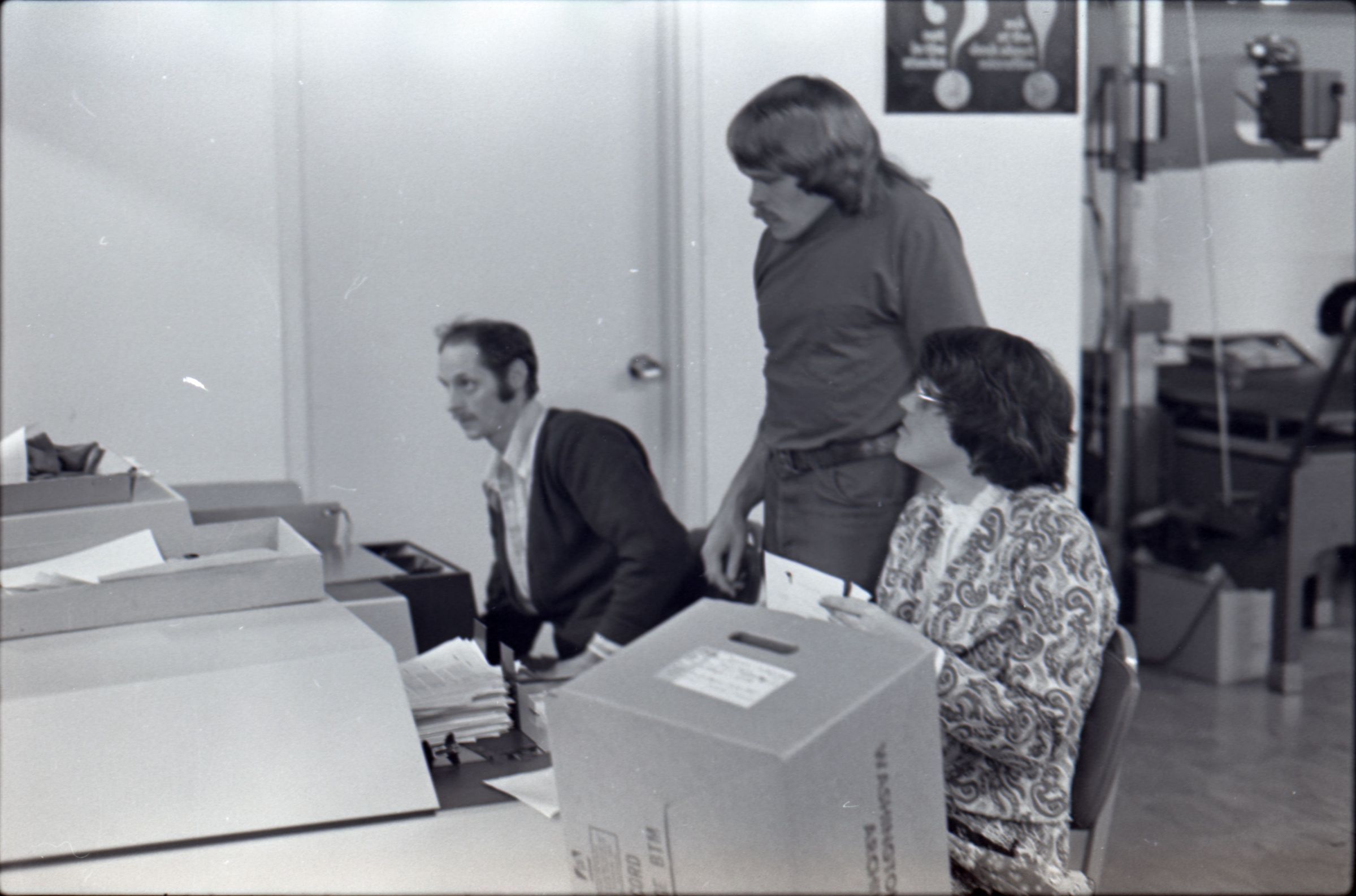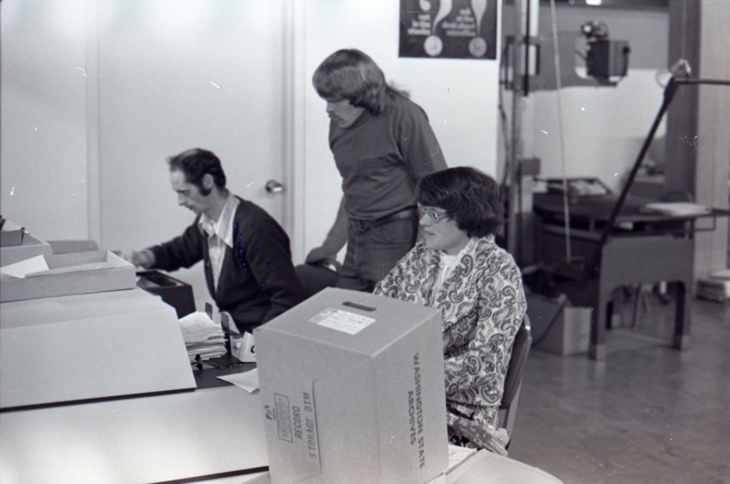 The images of the city council meeting were created for inclusion with an article concerning new Lacey City Council members. ("HARD AT WORK," Lacey Leader, 1/28/1976) The images of Beverly Hilts and Al Striggow (group "c") were created for inclusion with an article concerning a fundraiser for North Thurston High School. ("FUND RAISER," Lacey Leader, 1/21/1976)Made/Created