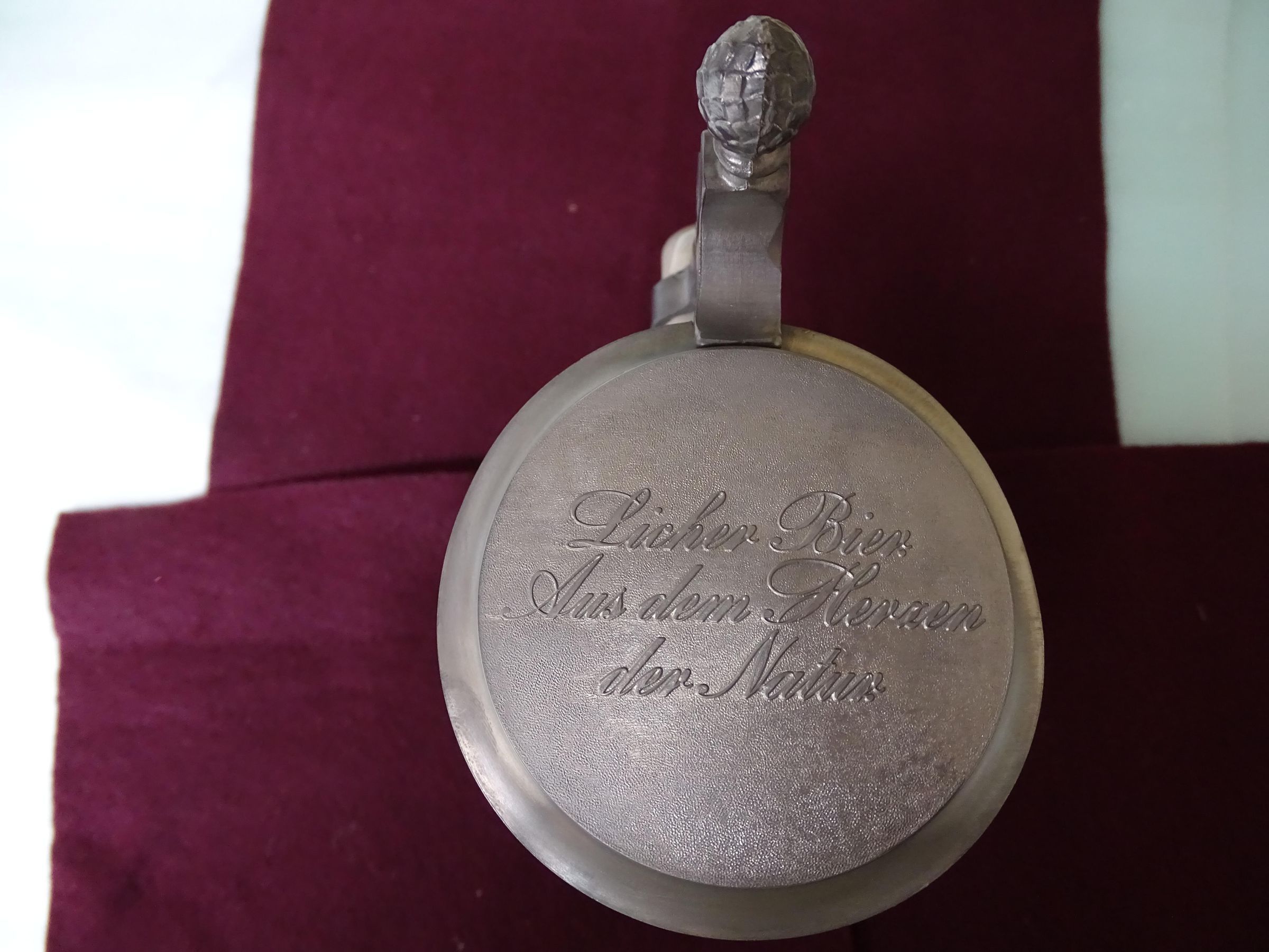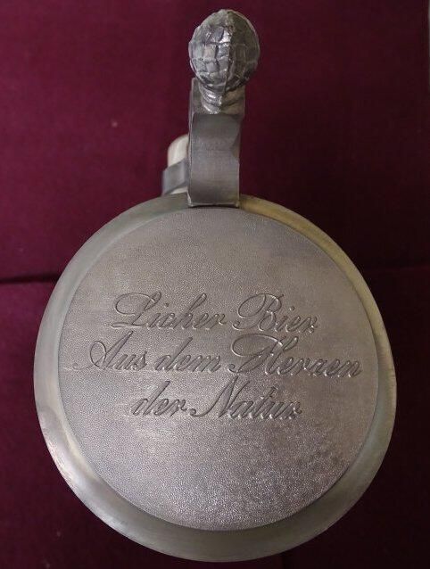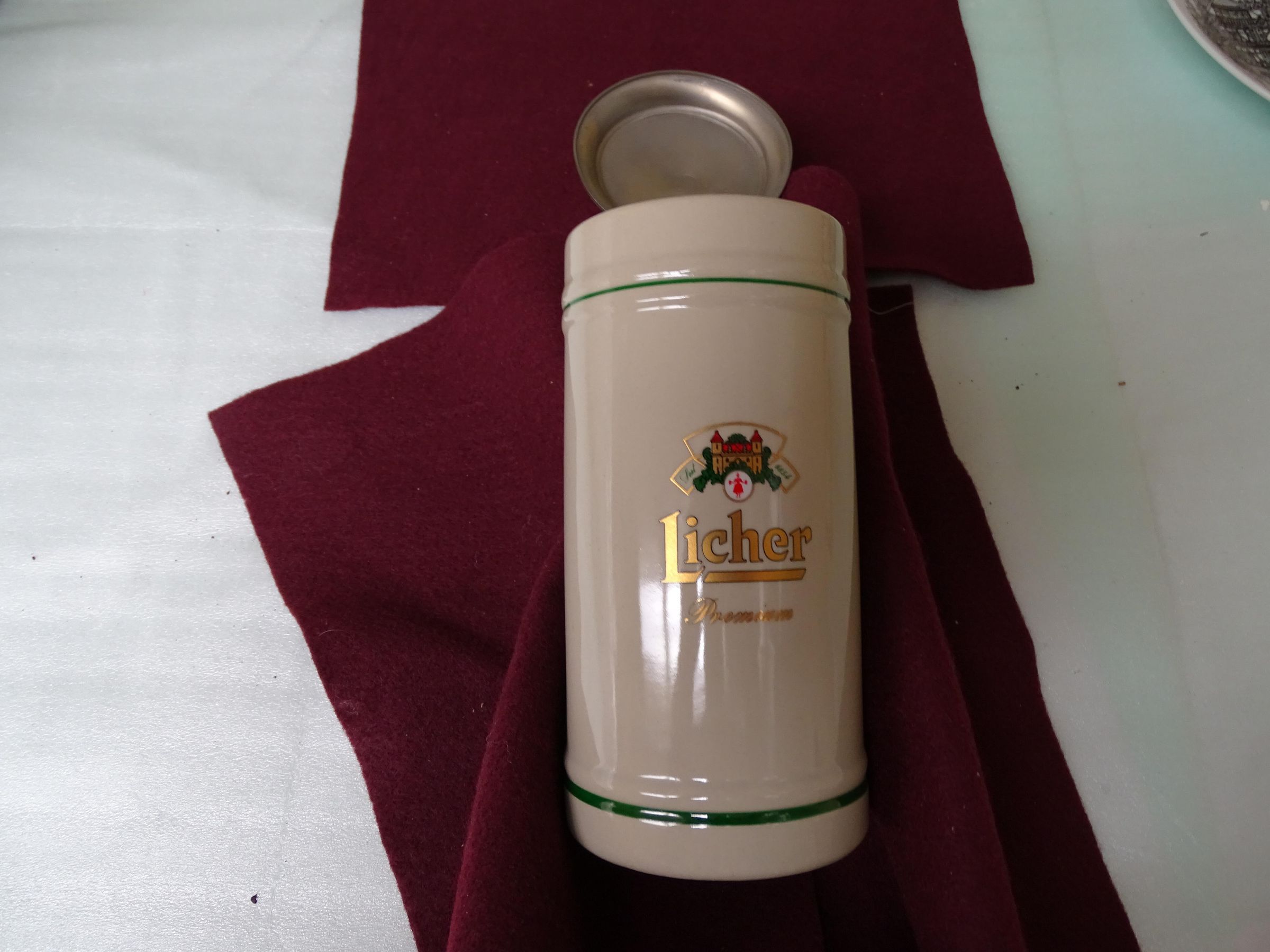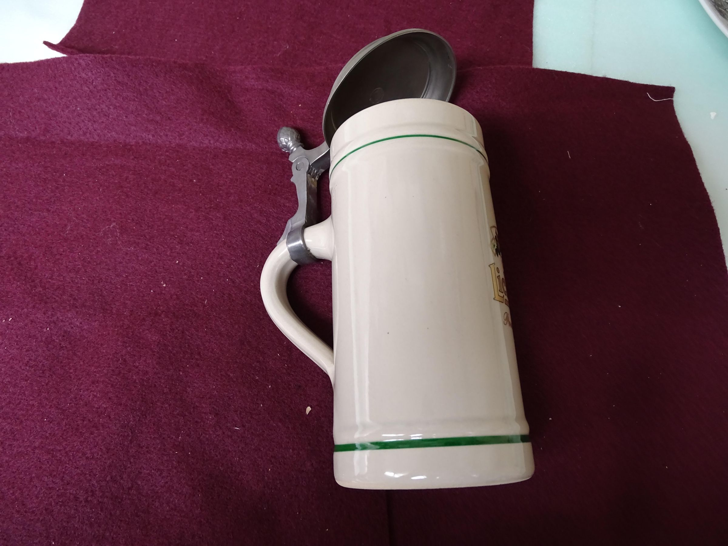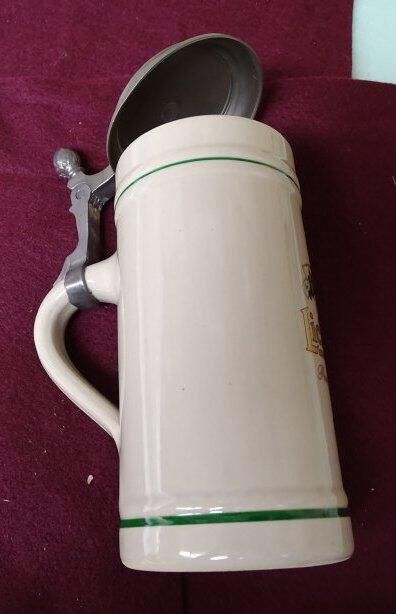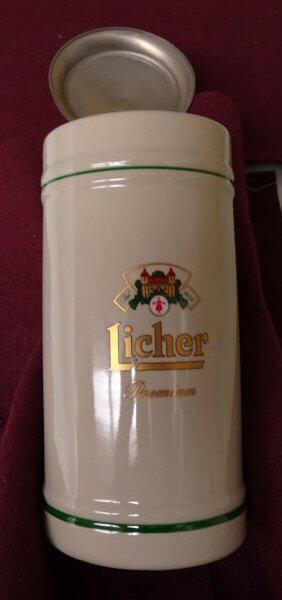 Porcelain and metal .5 liter beer stein. The stein is a porcelain cylindrical vessel with a handle and a metal arm clamped to the handle that supports a metal lid and permits the lid to swing open. The porcelain is light brown in color with a green painted ring near the top and at the bottom. Pressed into the side near the handle is "0.5 ?astal". The top of the arm holding the lid is shaped like a pine cone. The top of the lid is stippled and in raised letters is what appears to be "Licher Bier Aus dem Hevaen der Natur" On the side of the cylinder in red, green and gold paint is an image of a building (castle) with the silhouette of a woman with beer in her hands and the apparent words "Seit" and "1854". Also the words "Licher Premium".Made/Created