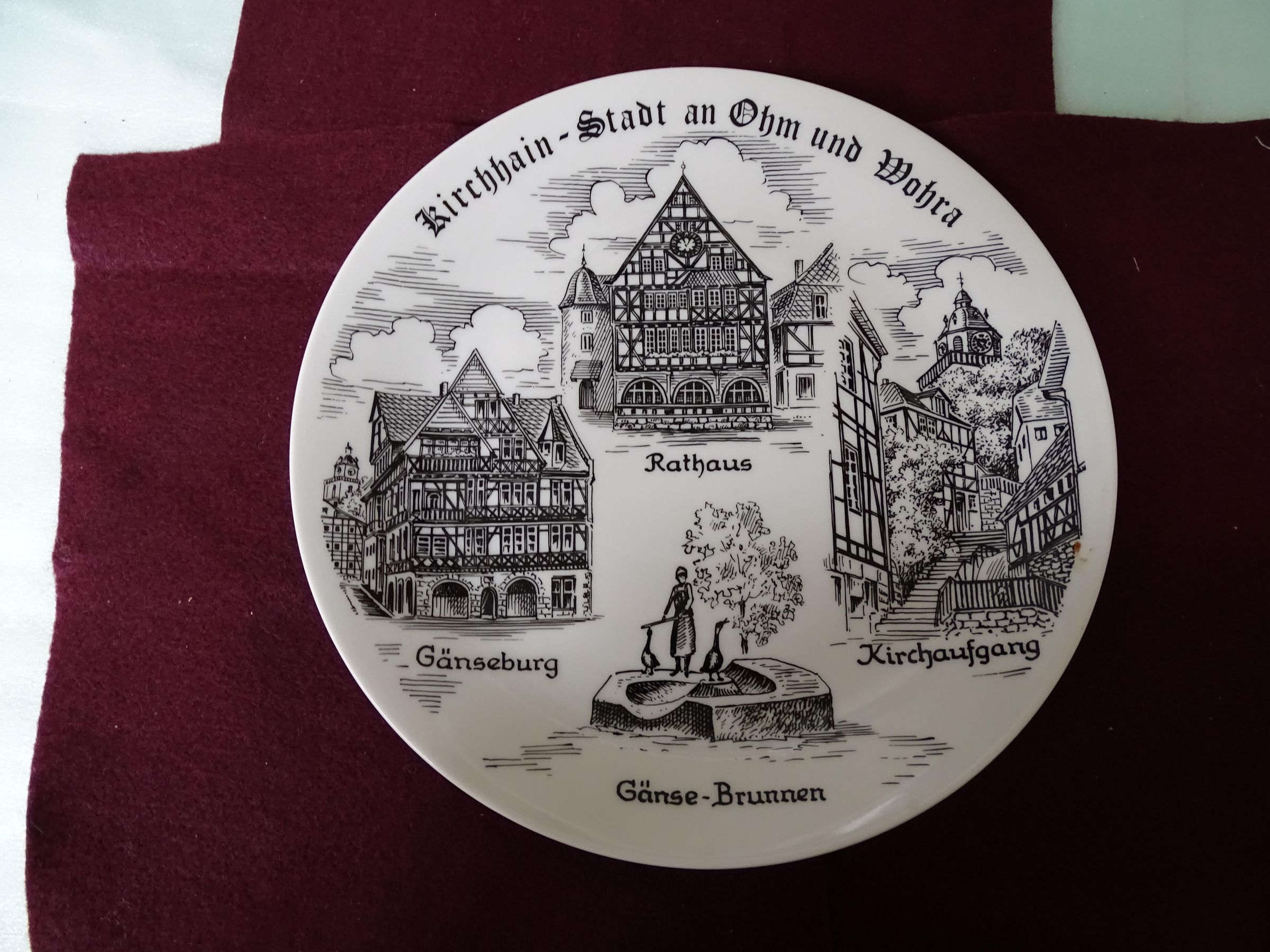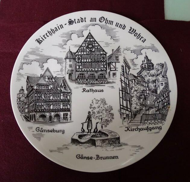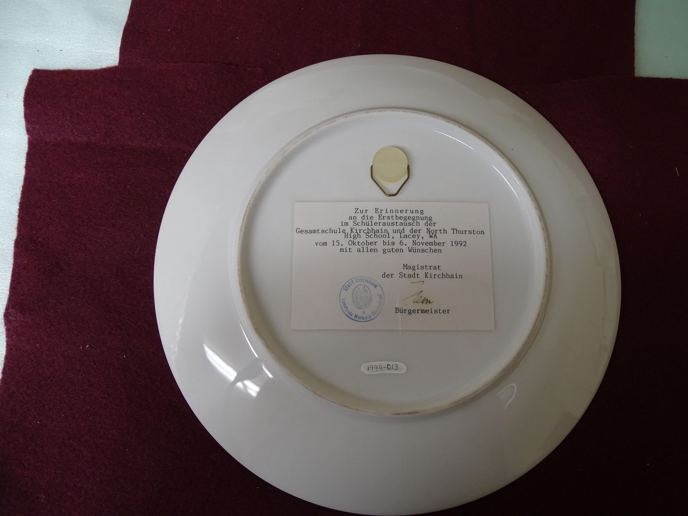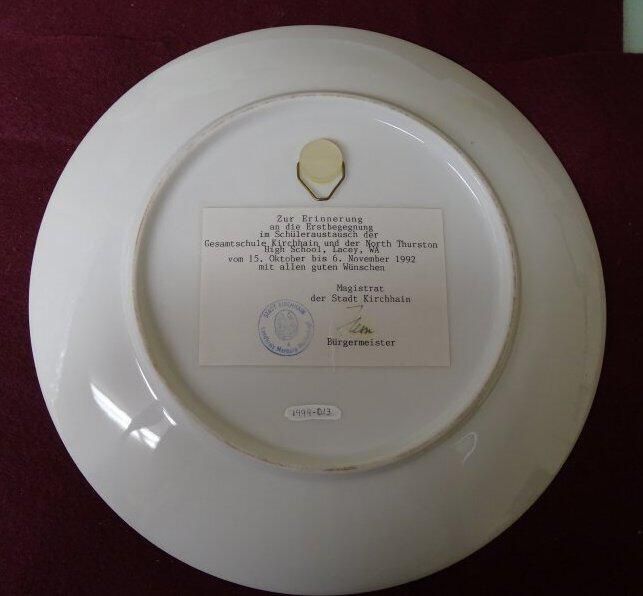 Porcelain commemorative plate given to North Thurston High School. The plate is white with images and German words on the face in black paint. At the top is "Kirchhain - Stadt an Ohm und Wohra". There are images of three buildings and underneath the words "Rathaus", "Ganseburg", and "Kirchaufgang". There is also an image of a woman and geese standing on what looks like a concrete structure with a tree behind and below the words "Ganse-Brunnen". Clouds are painted around the buildings. On the back is a plastic and metal ring for hanging, and a rectangular piece of paper taped to the plate. On the paper are the words "Zur Erinnerung an die Erstbegegnung im Schuleraustaush der Gesamtschule Kirchhain und der North Thurston High School, Lacey, WA vom 15, Oktober bis 6. November 1992 mit allen guten Wunschen" , and "Magistrat der Stadt Kirchhain, Burgermeister". A signature is written in ink above the word "Burgermeister". Also on the paper is a stamp in blue ink with the words around the outside "Stadt Kirchhain Landkkrain Marburg Biedenkopf". In the center of the stamp is an image.