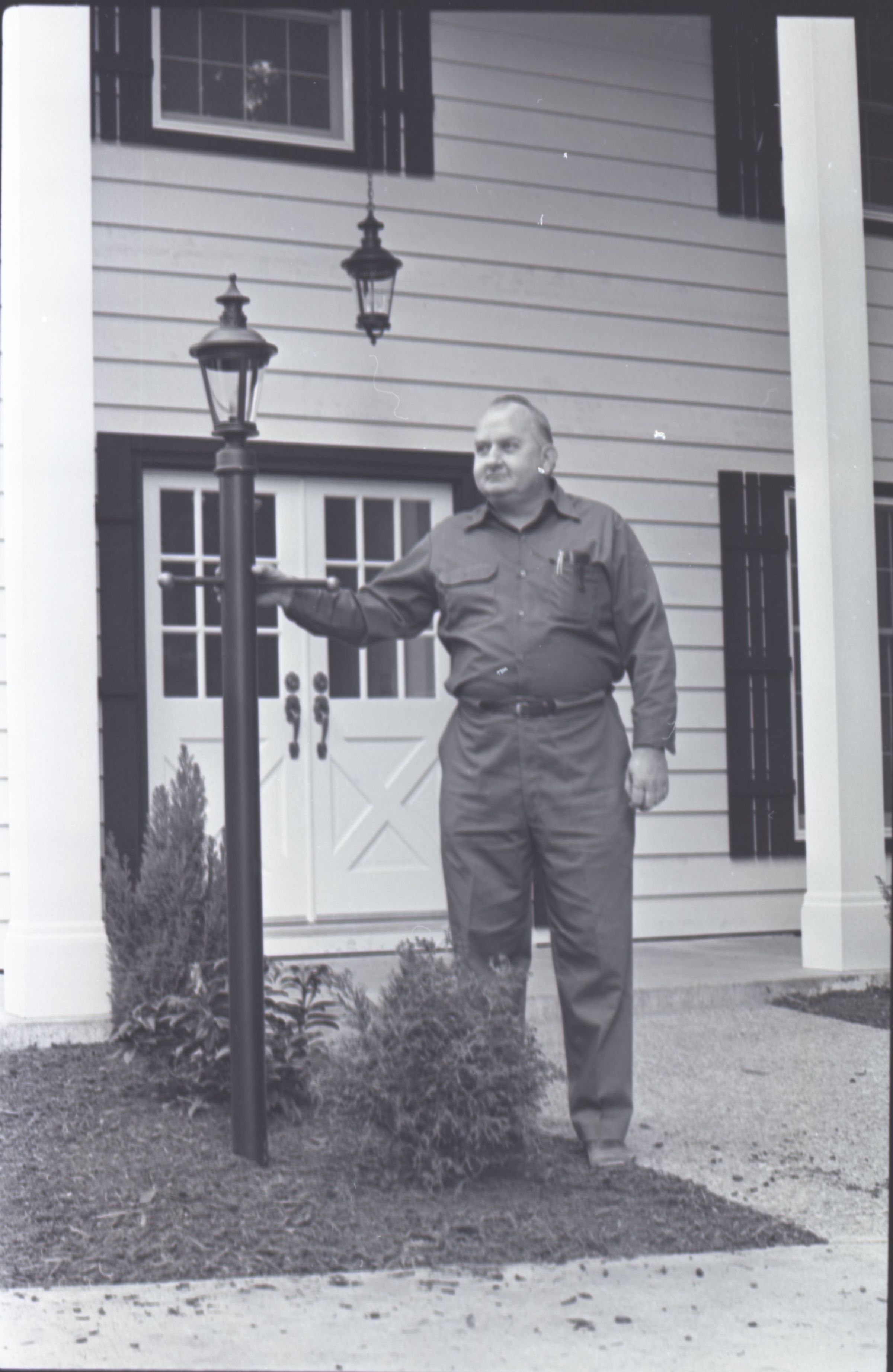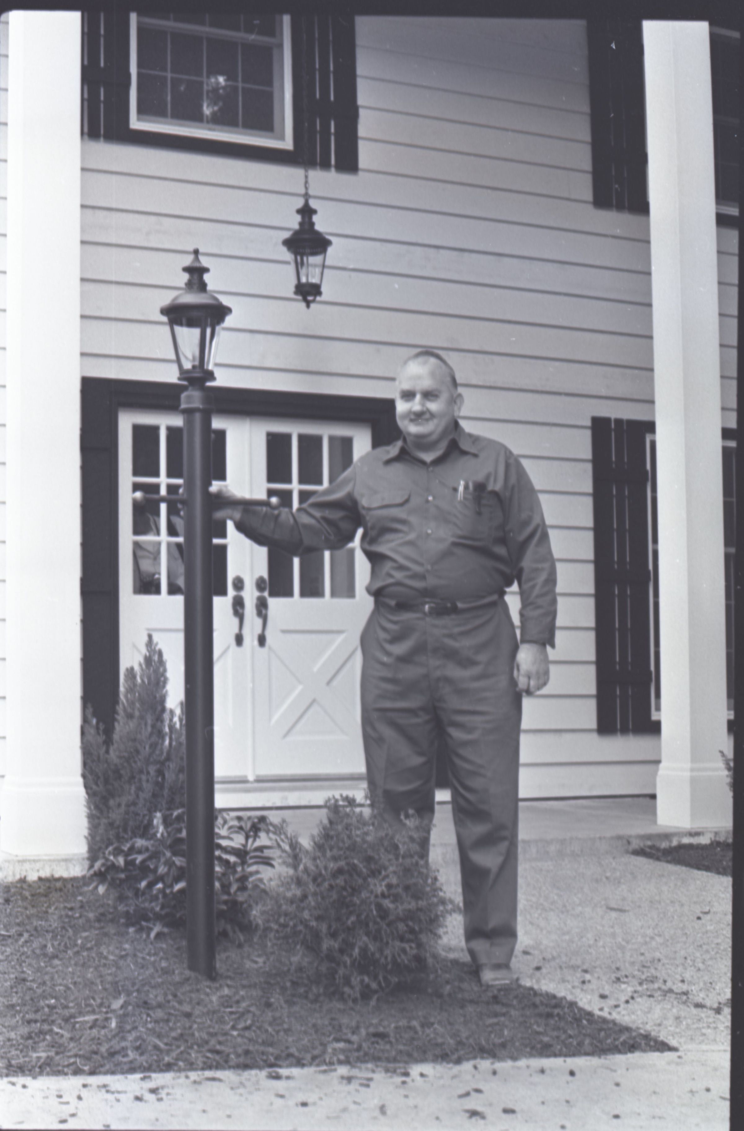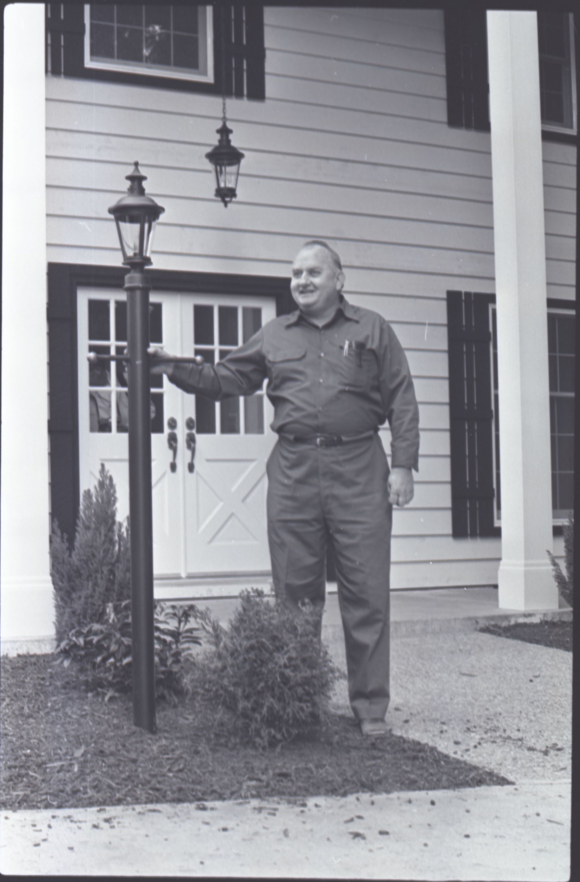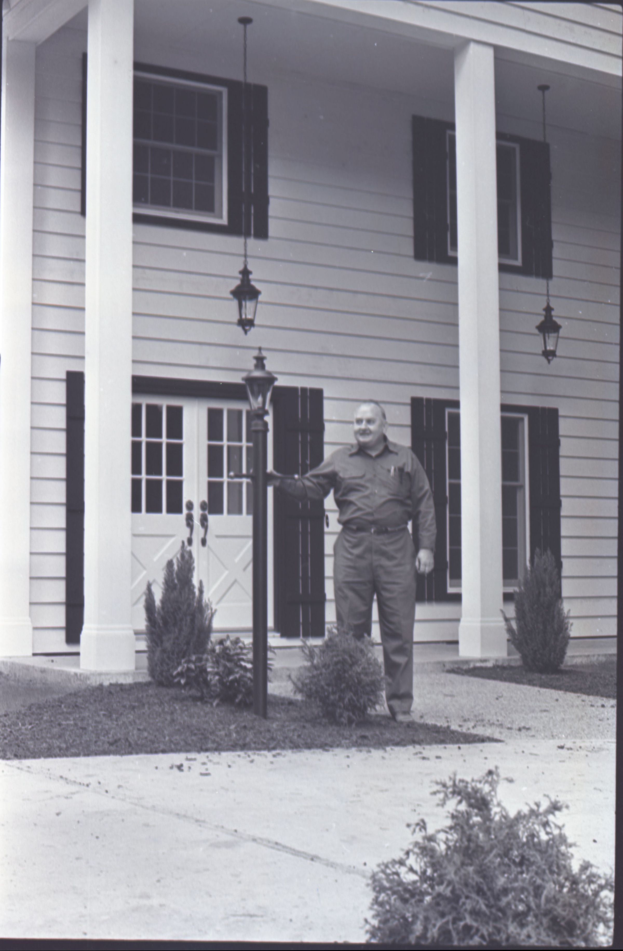 The images in group "c" show the same house seen in group "b." These images show the front side, back side and inside of the home. Image 10c shows a man standing in front of the central portion of the home. The man is balding and is wearing a button-up shirt and slacks. He is reaching out to touch a light post in front of the house with his right hand. A small bush is partially visible in the bottom-right corner of the image.Made/Created