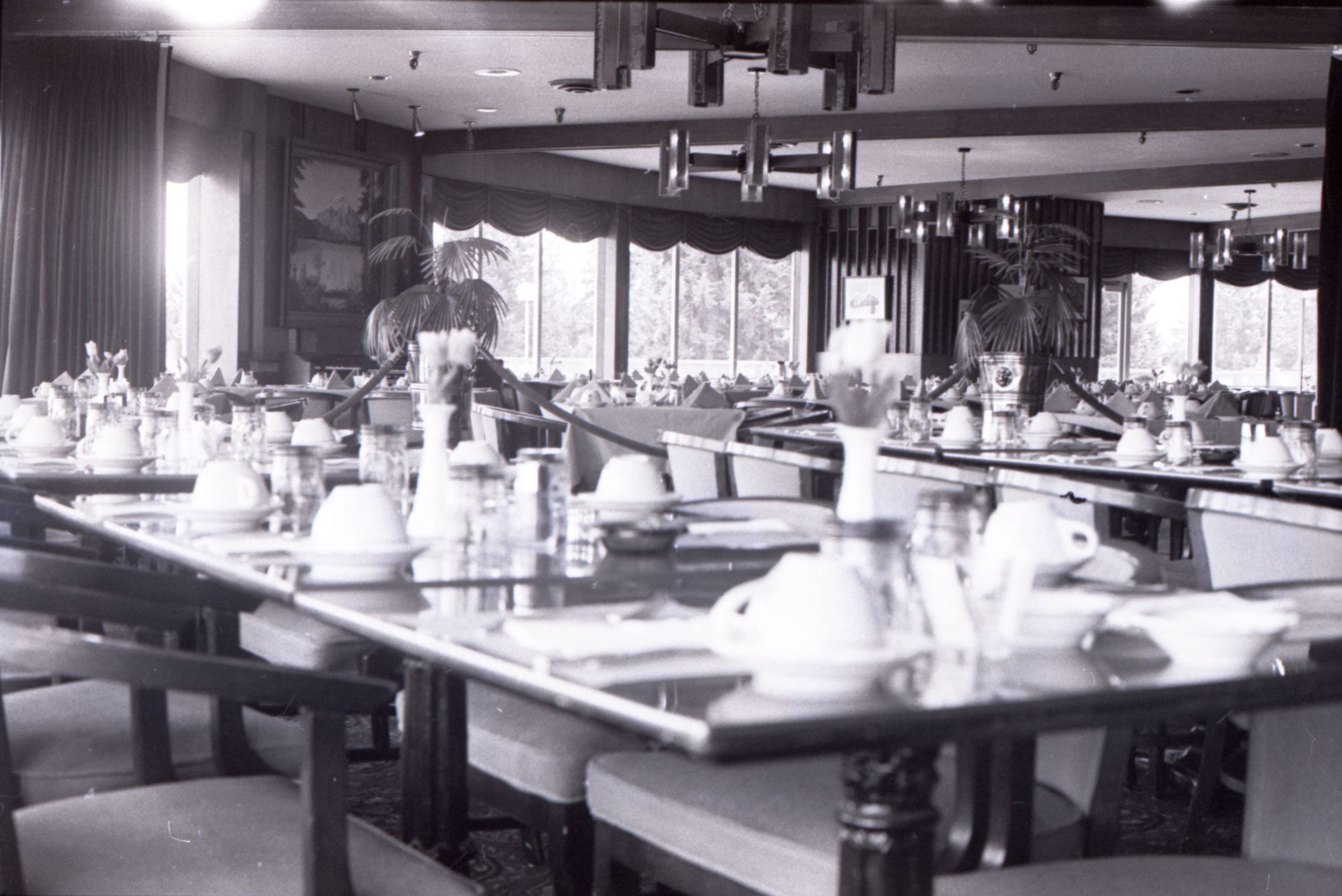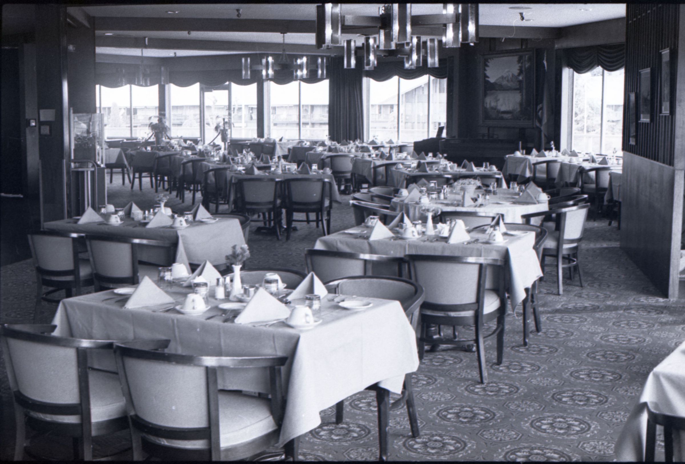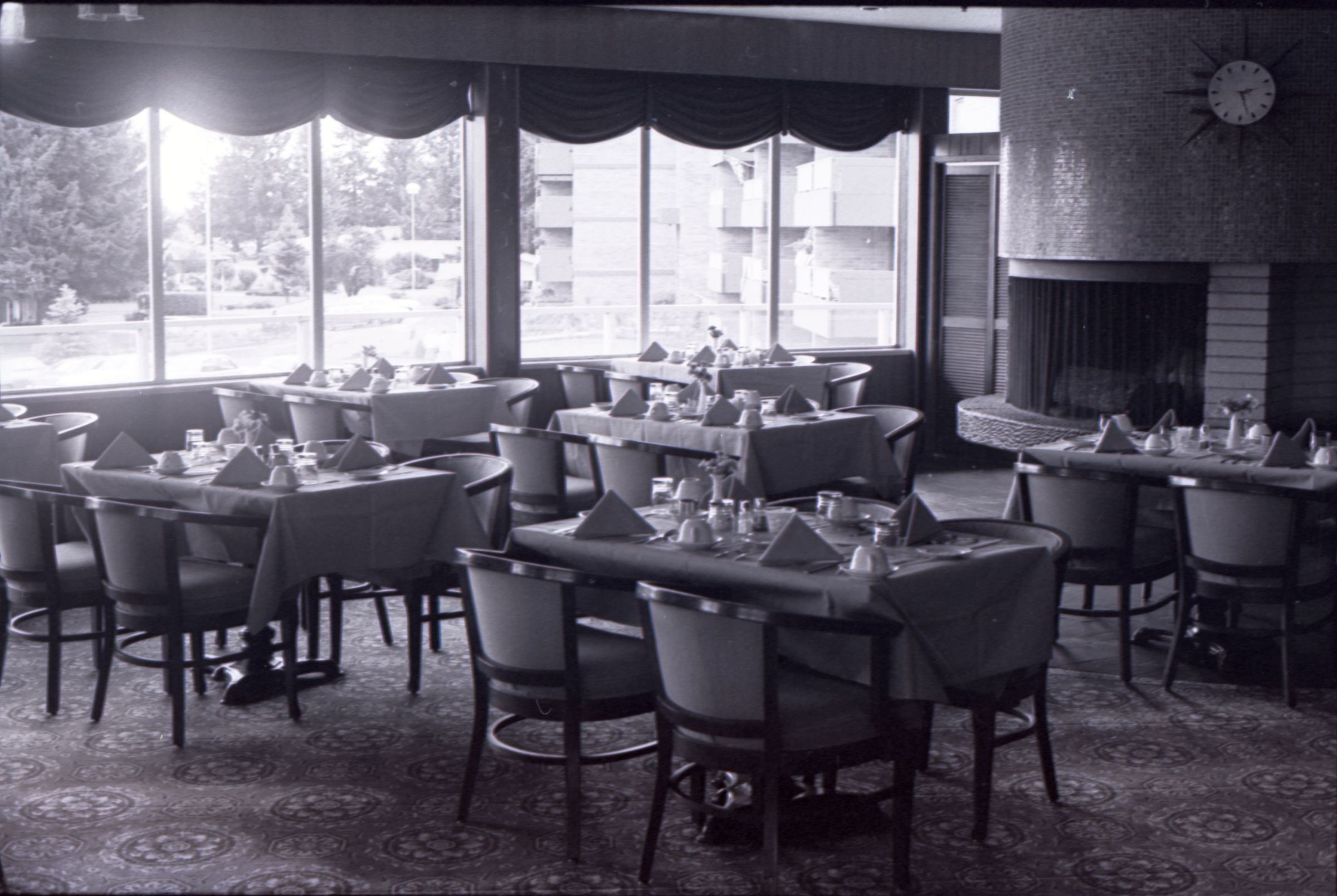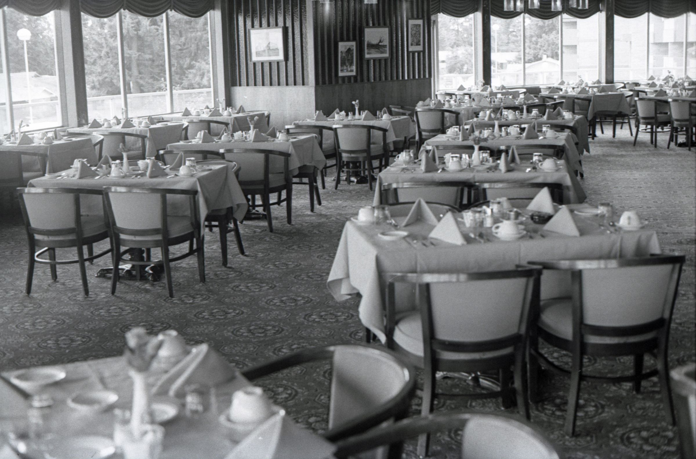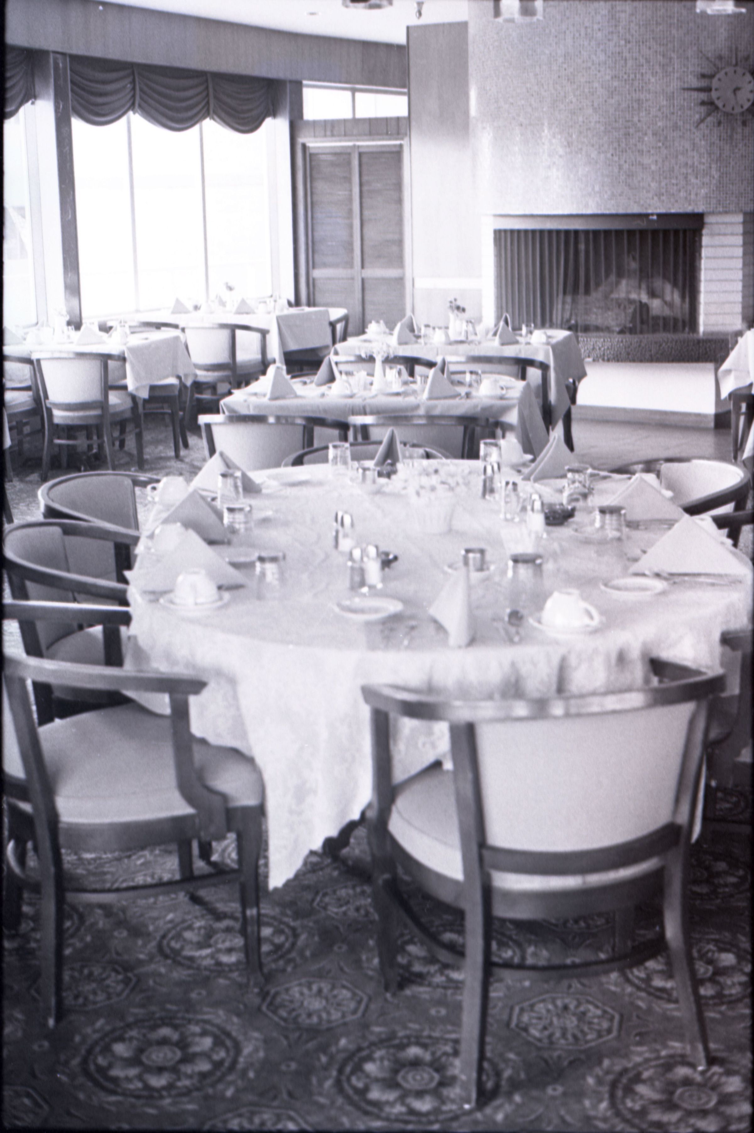 Panorama City Restaurant, 1974. These four black and white film negative strips were created for the Lacey Leader newspaper. These images show a restaurant with many fully set tables. The restaurant is almost completely empty of people.Made/Created