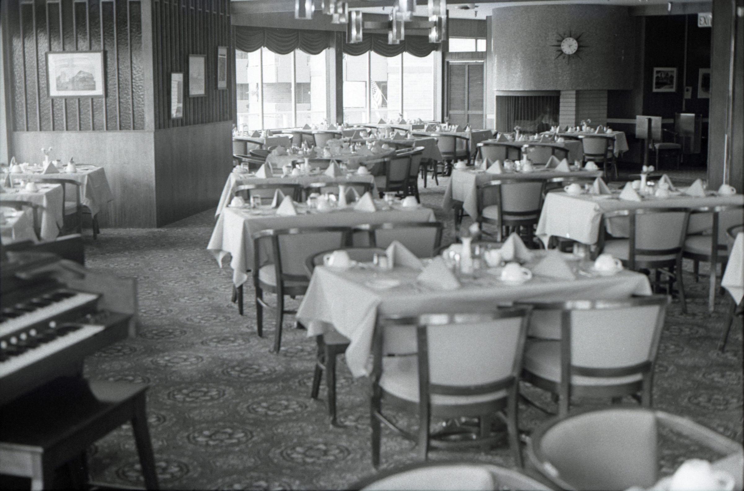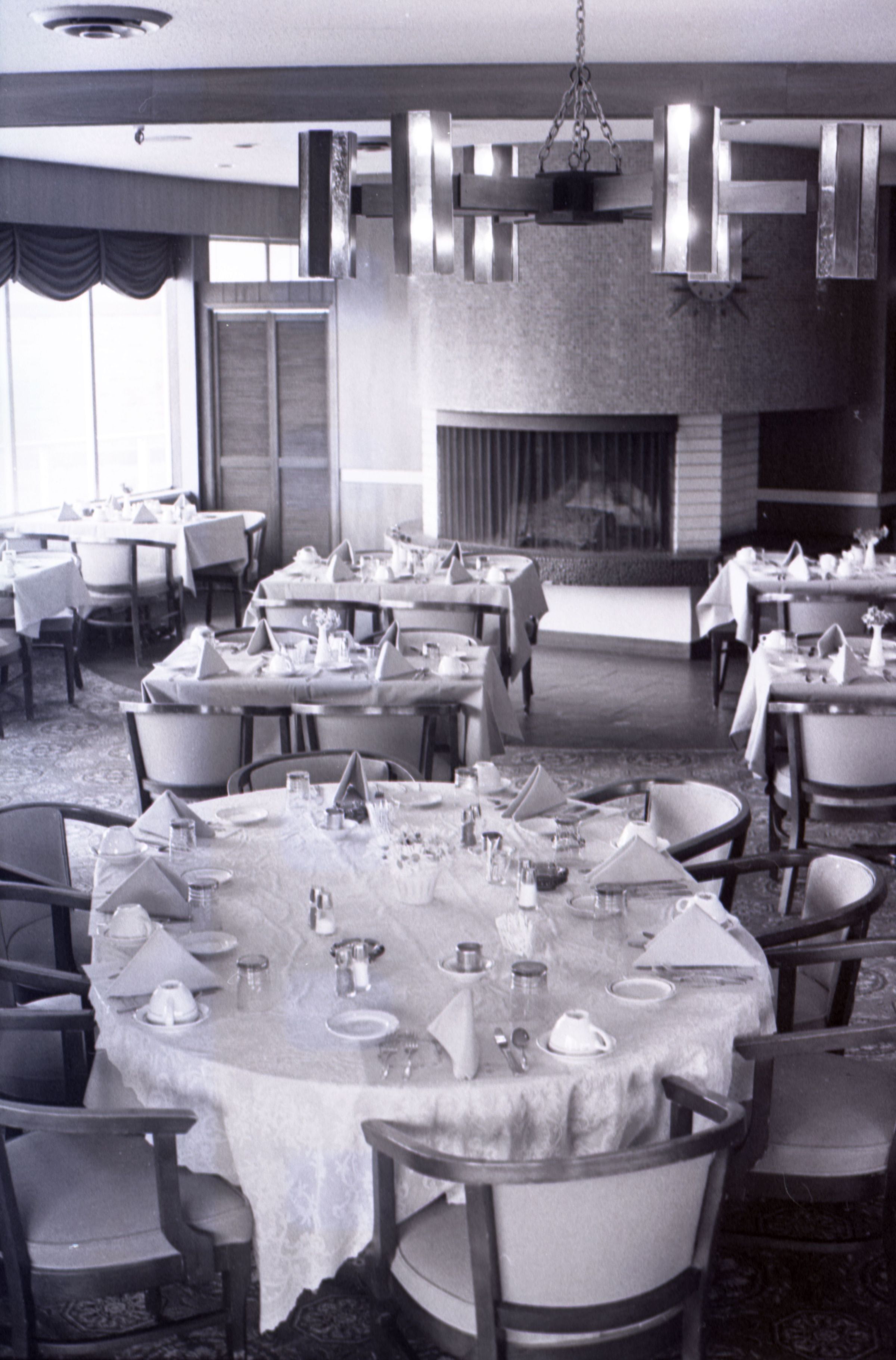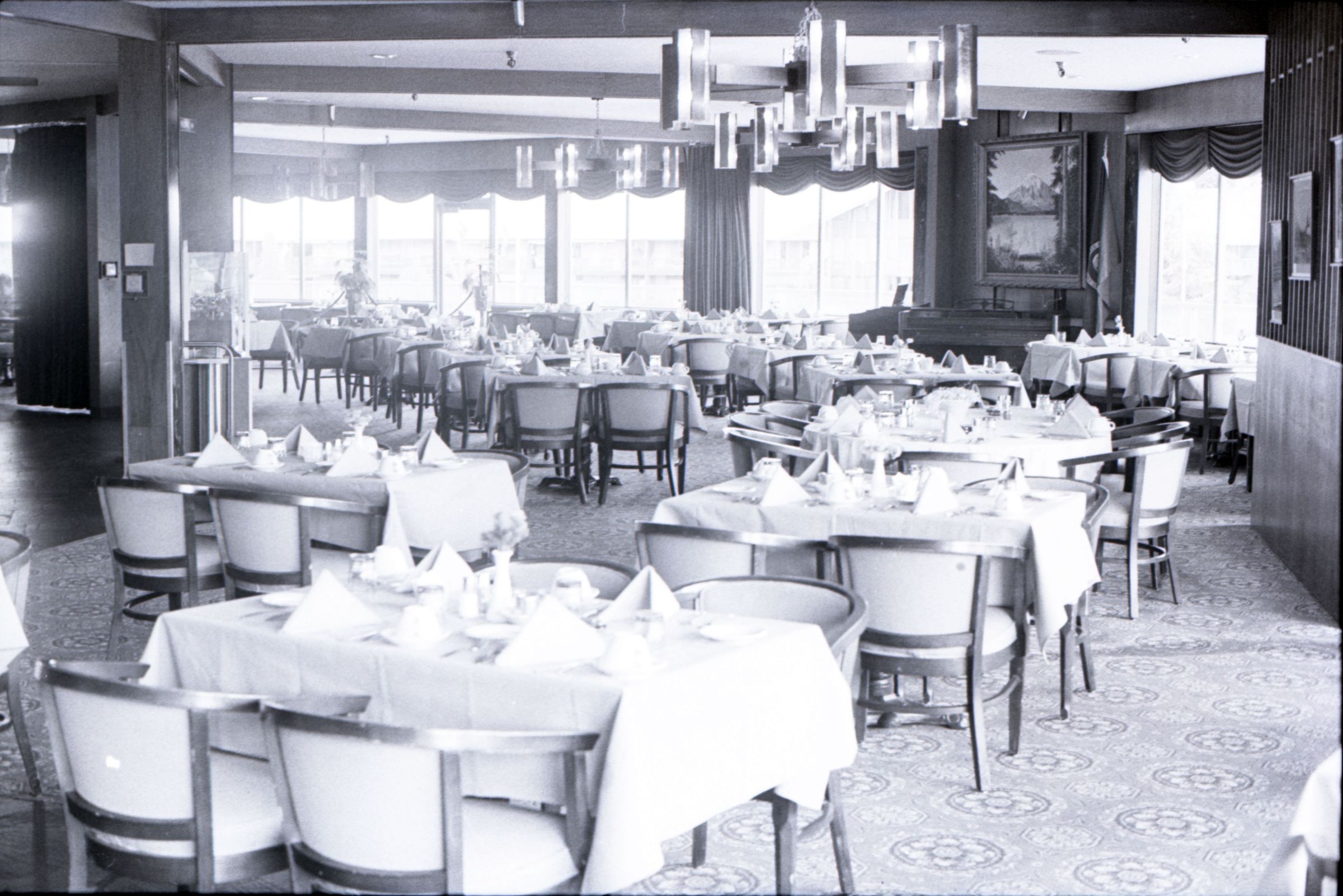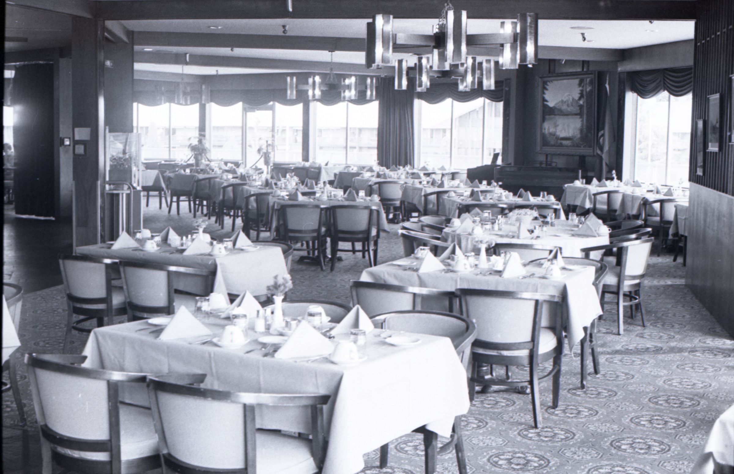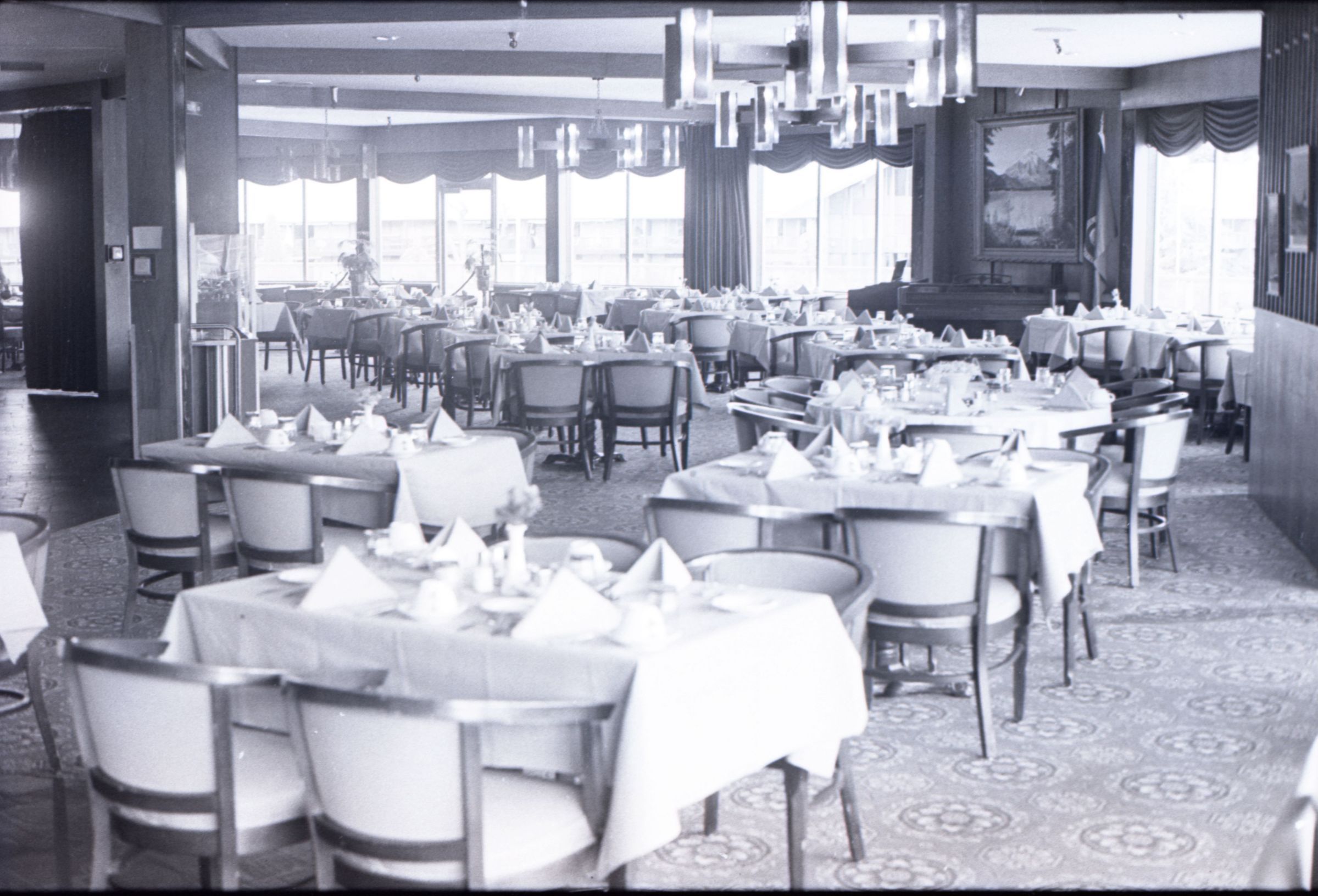 Panorama City Restaurant, 1974. These four black and white film negative strips were created for the Lacey Leader newspaper. These images show a restaurant with many fully set tables. The restaurant is almost completely empty of people.Made/Created