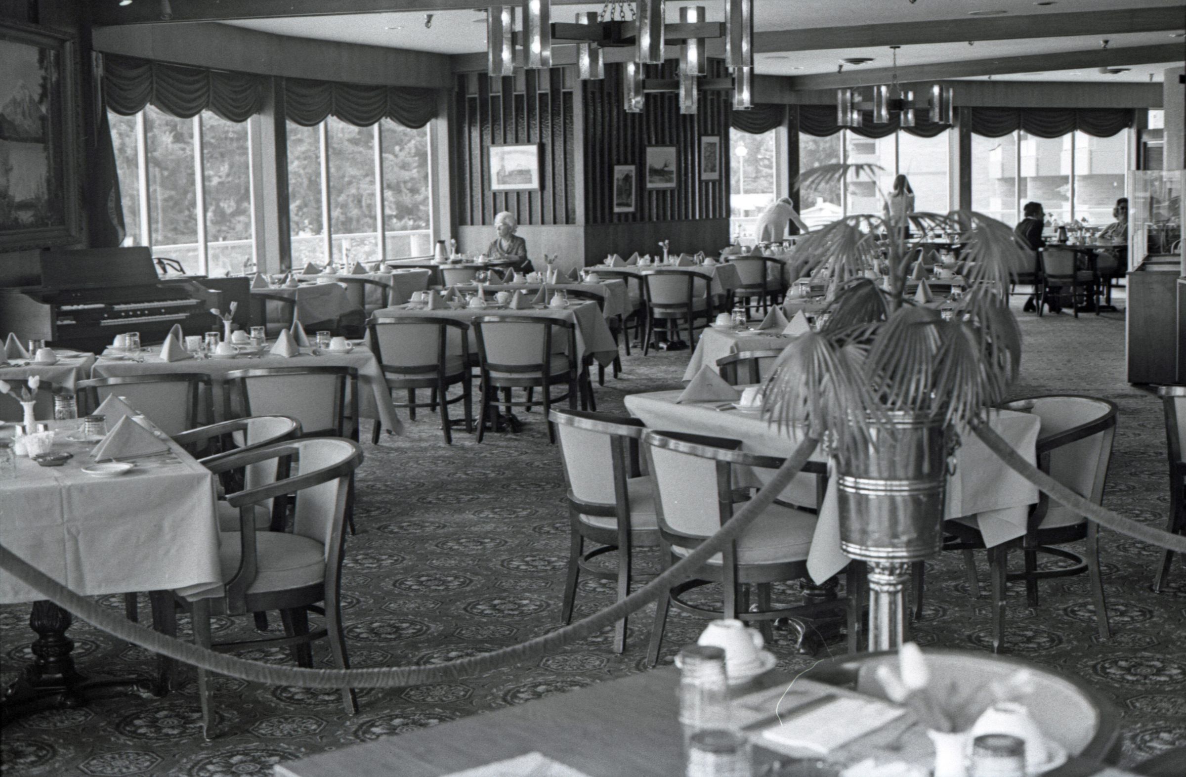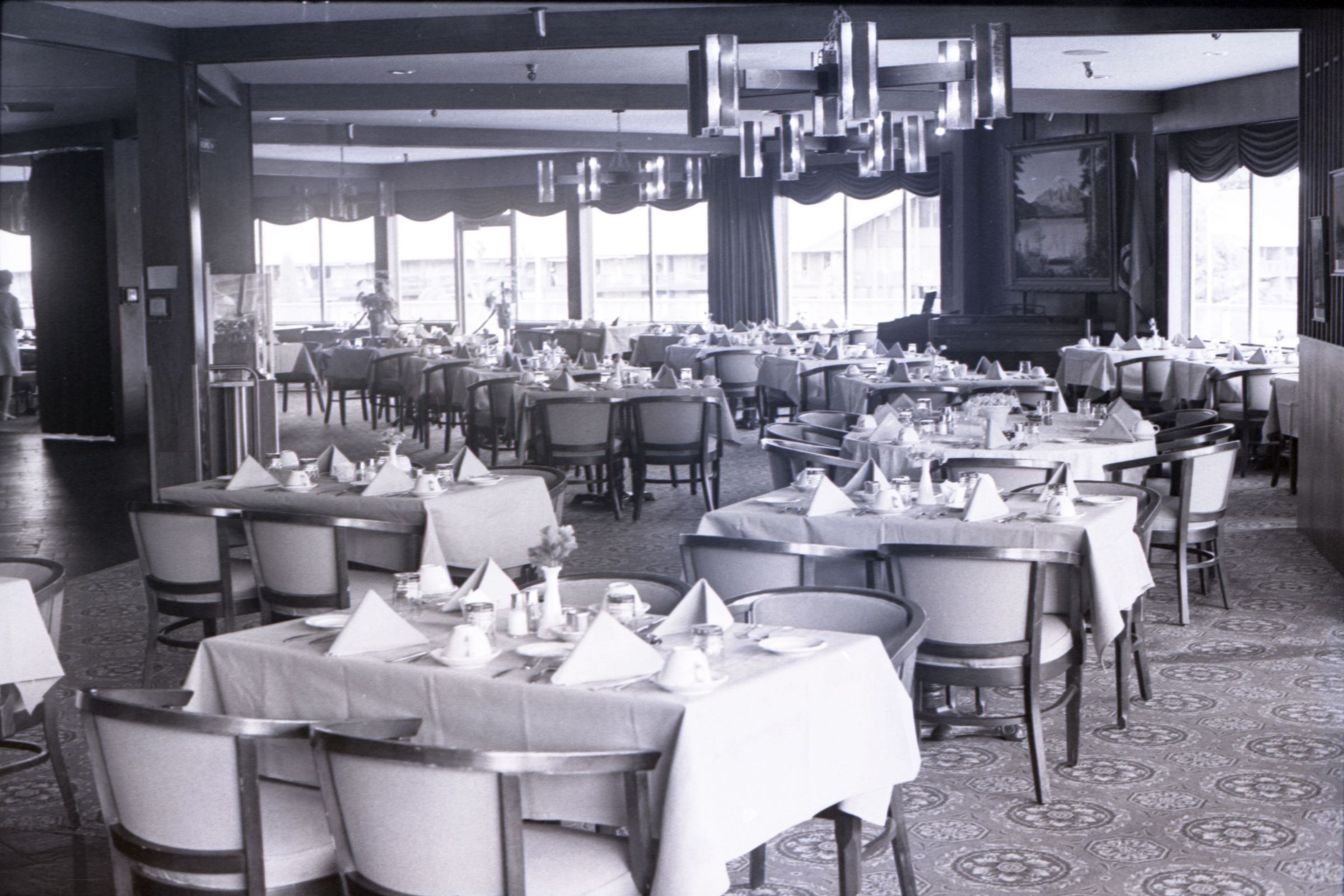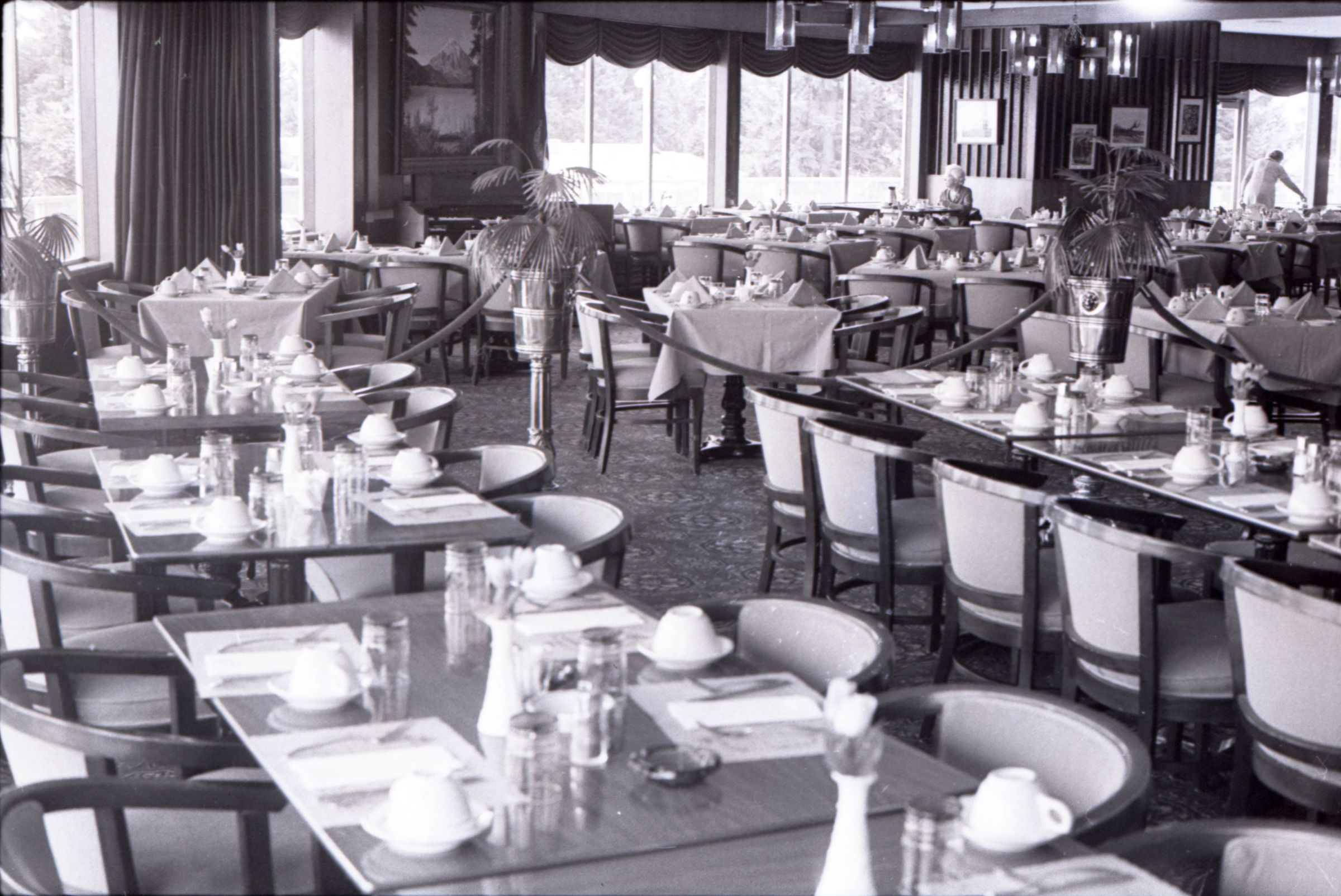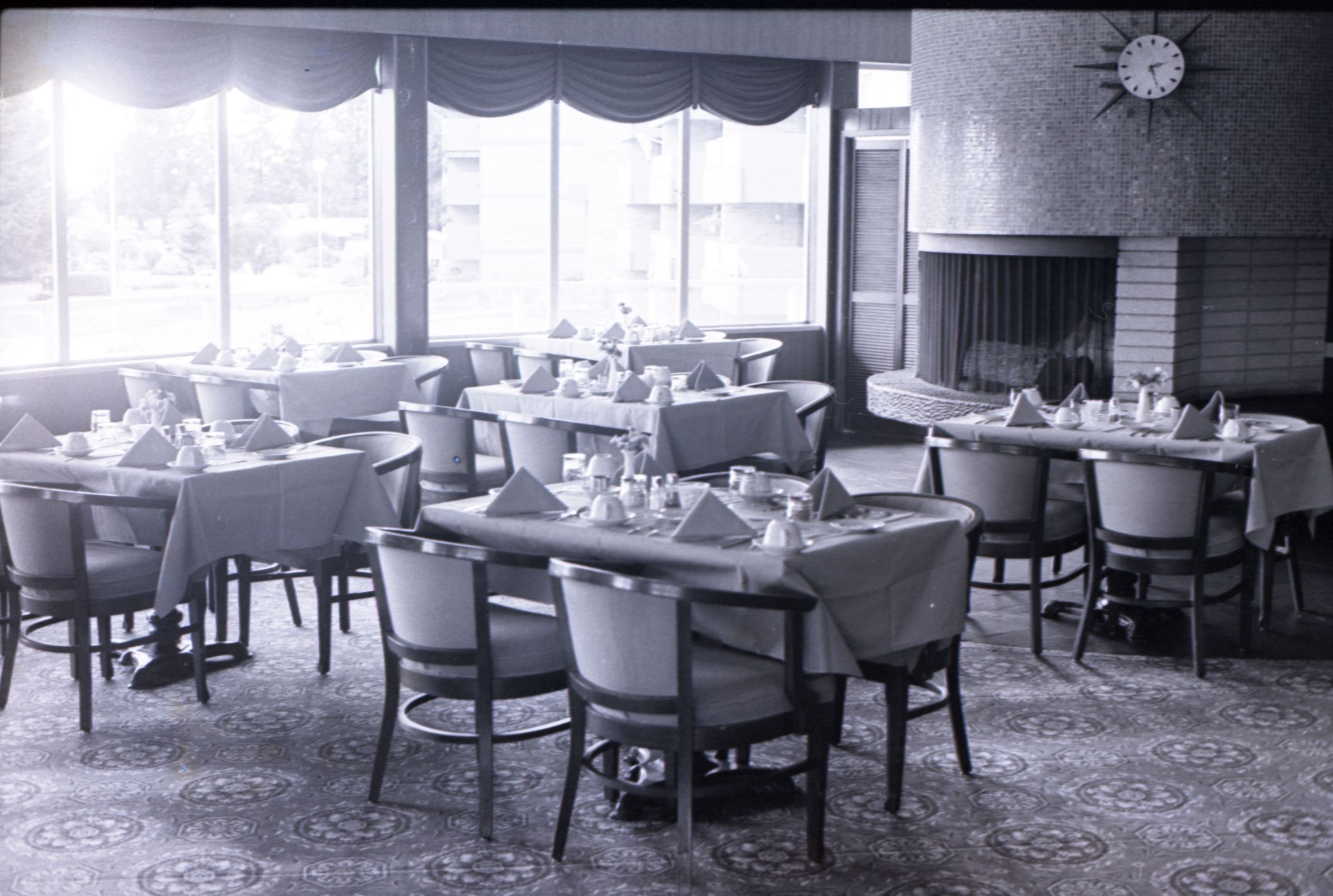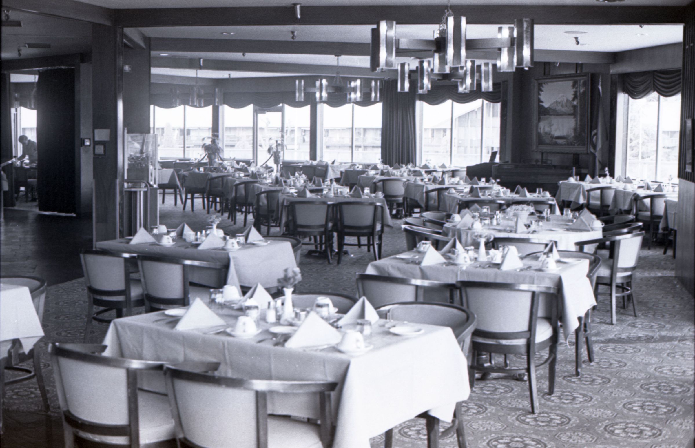 Panorama City Restaurant, 1974. These four black and white film negative strips were created for the Lacey Leader newspaper. These images show a restaurant with many fully set tables. The restaurant is almost completely empty of people.Made/Created