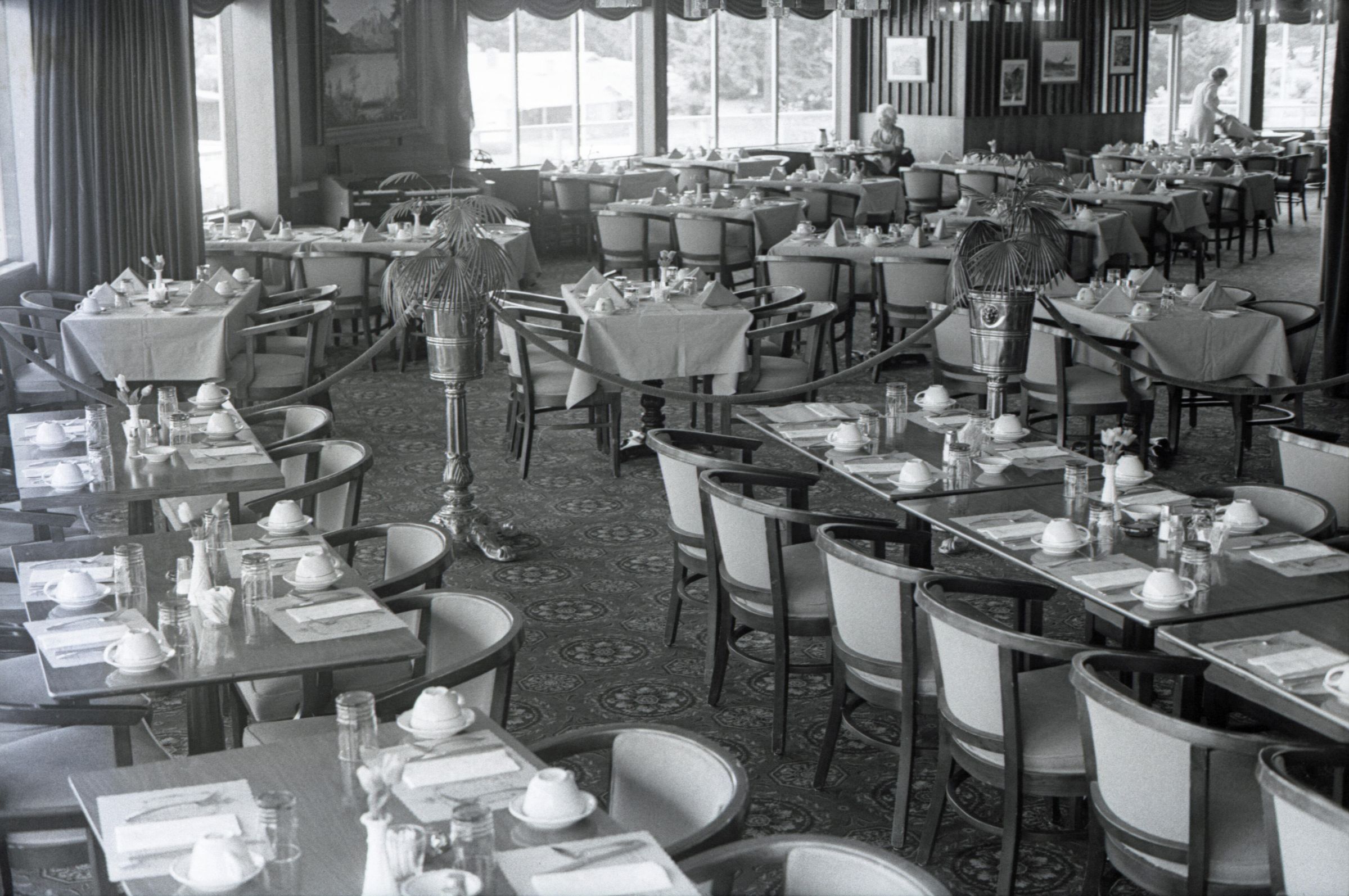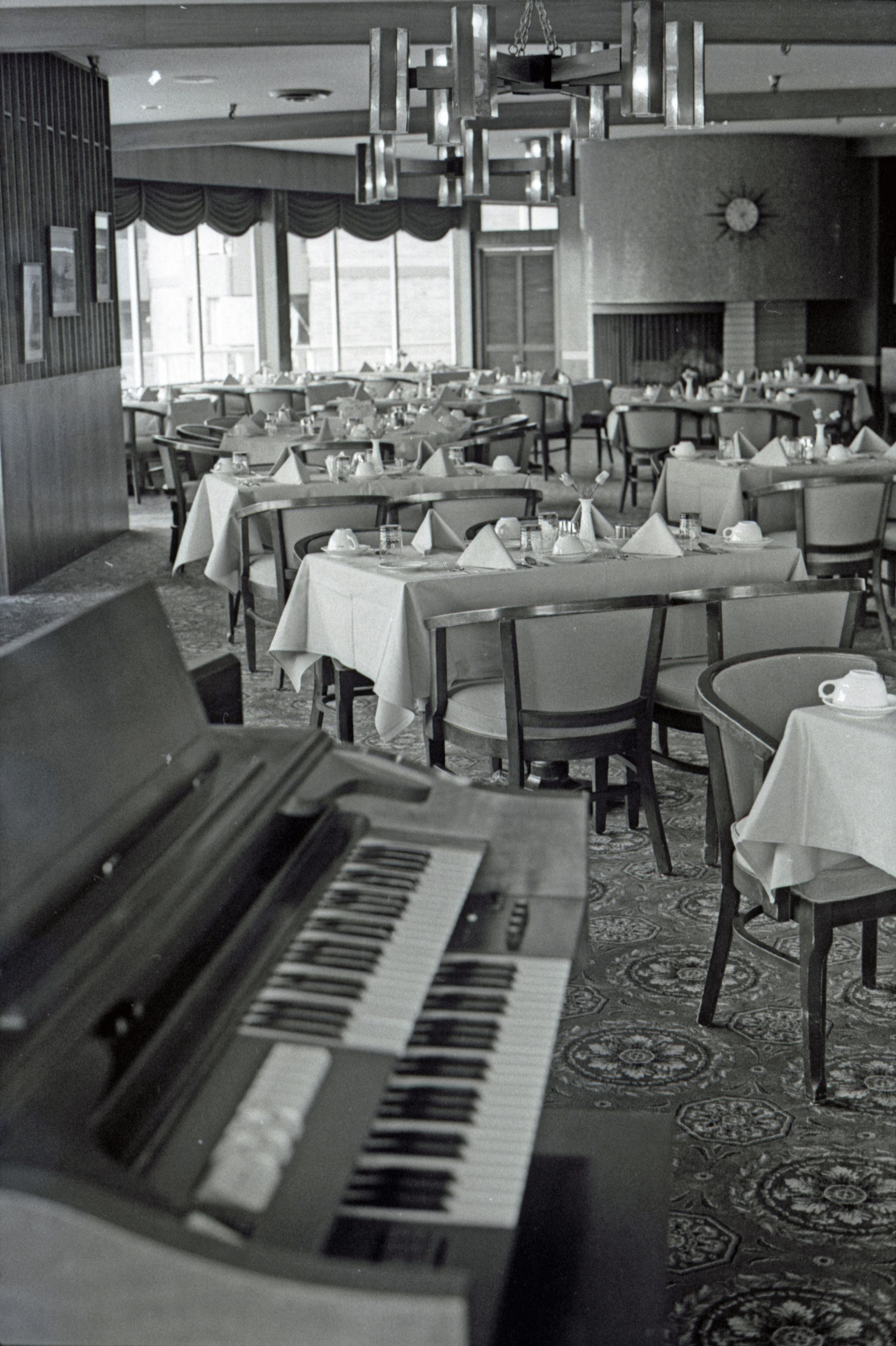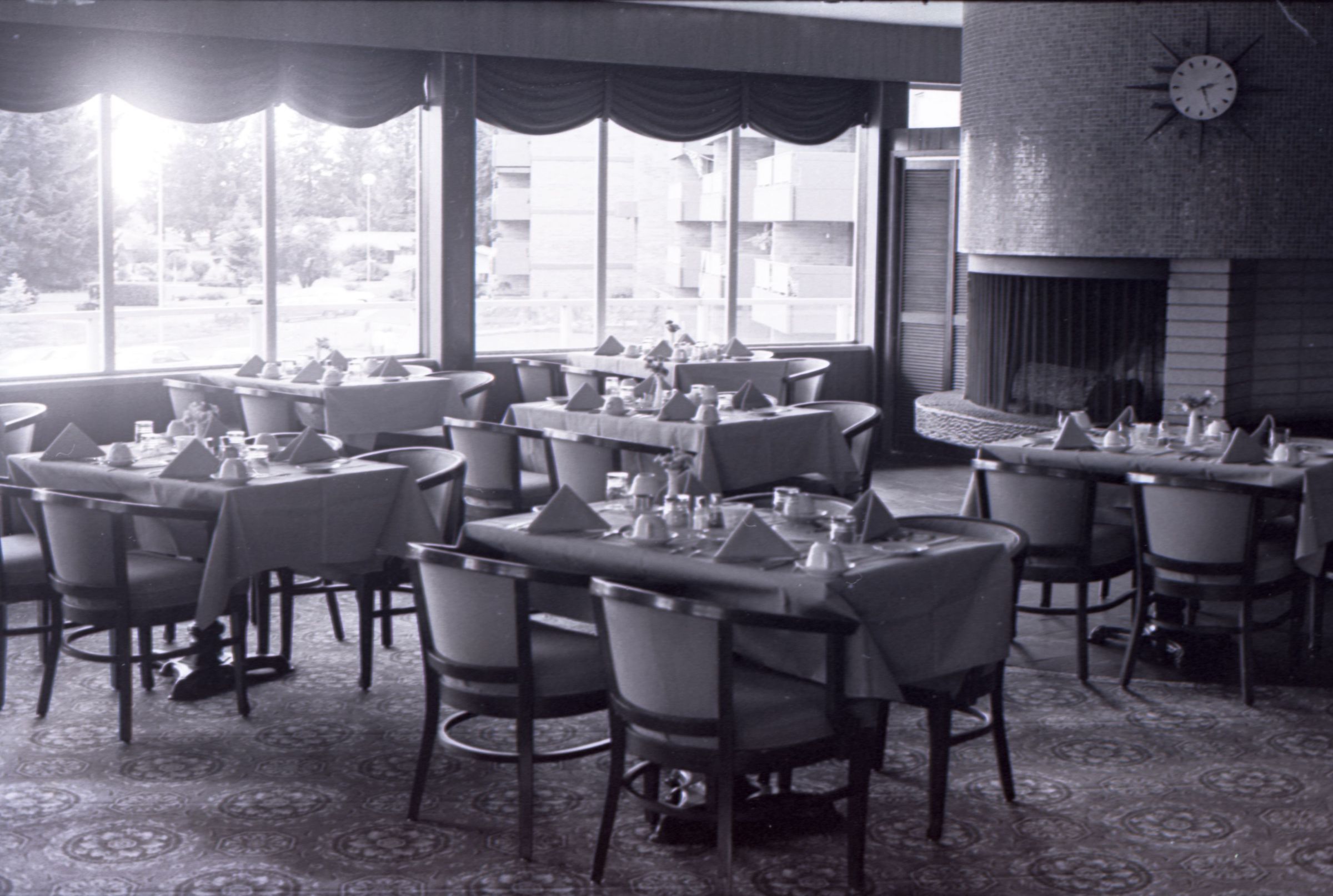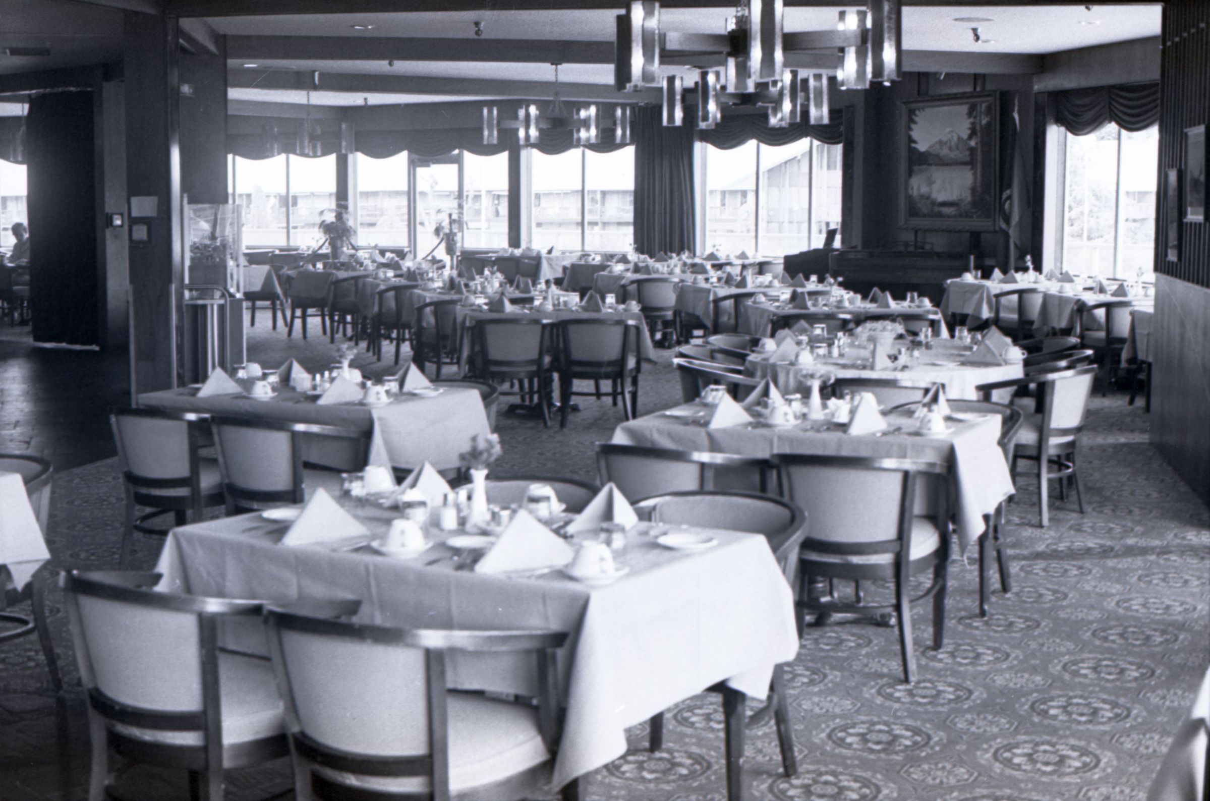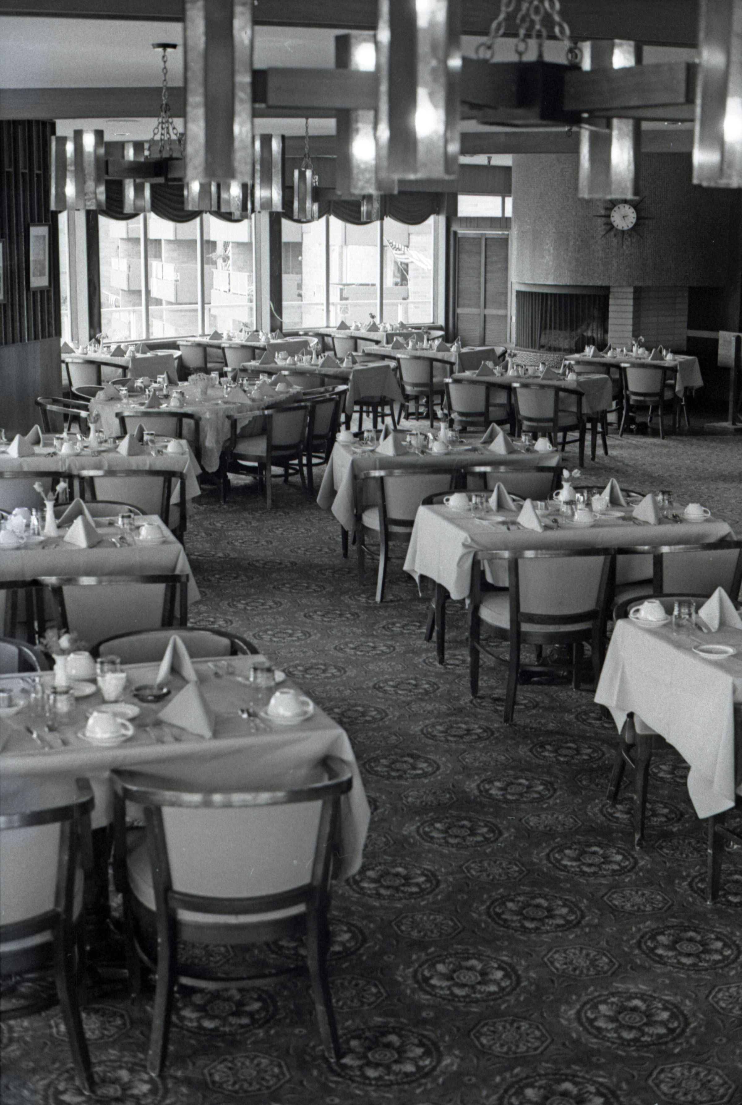 Panorama City Restaurant, 1974. These four black and white film negative strips were created for the Lacey Leader newspaper. These images show a restaurant with many fully set tables. The restaurant is almost completely empty of people.Made/Created