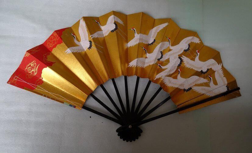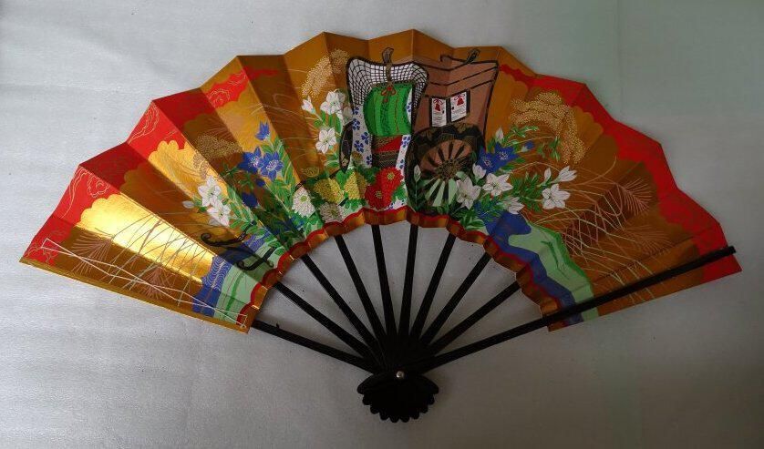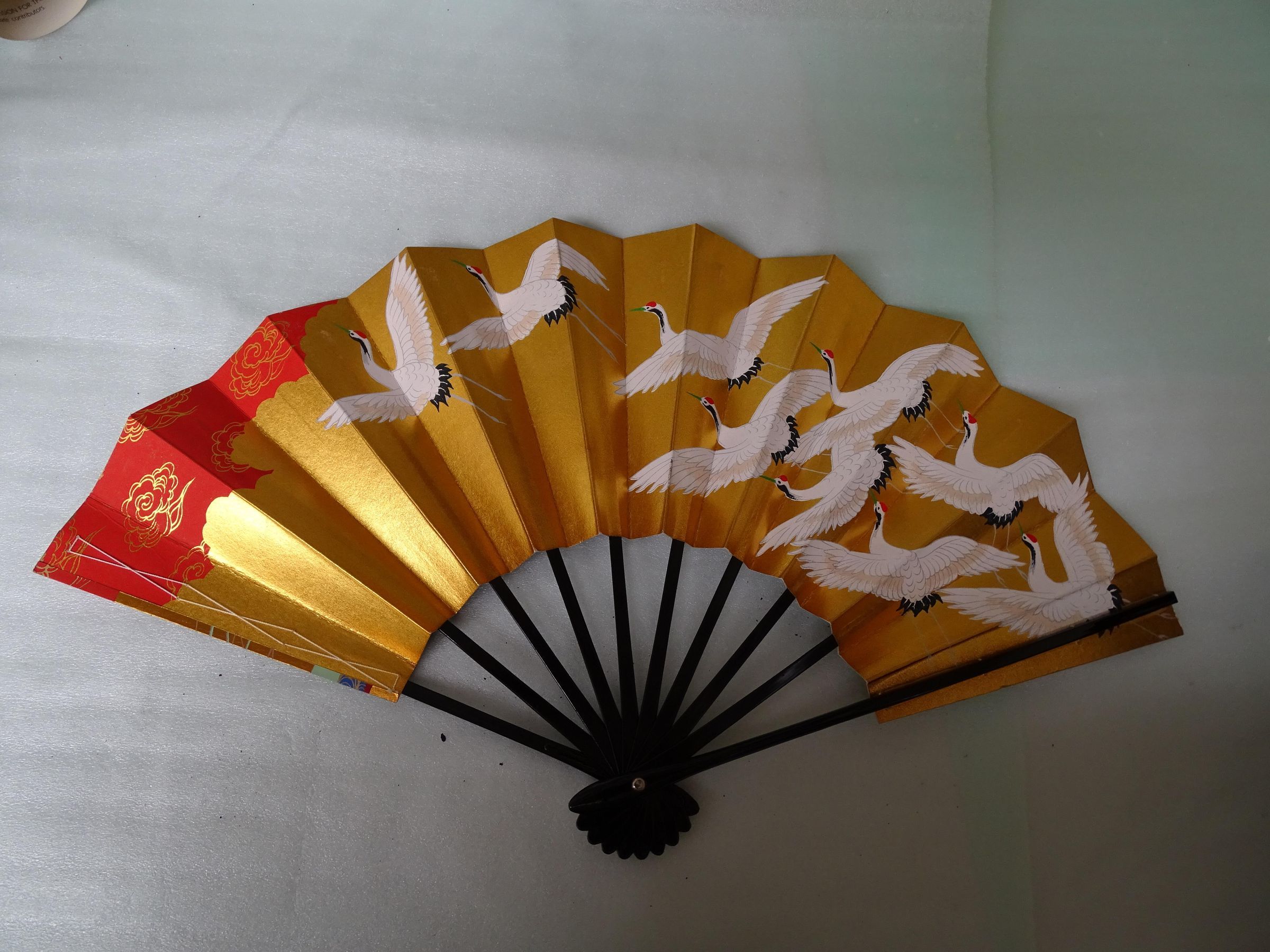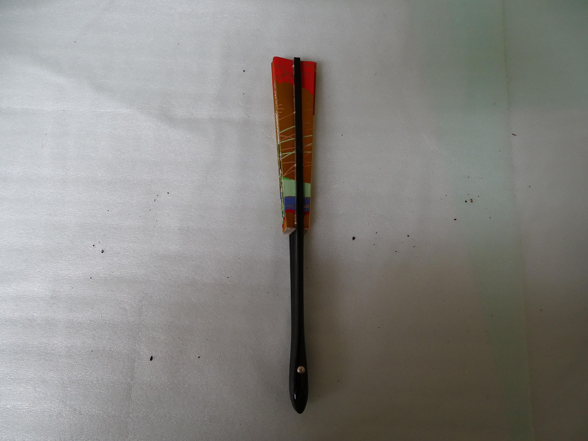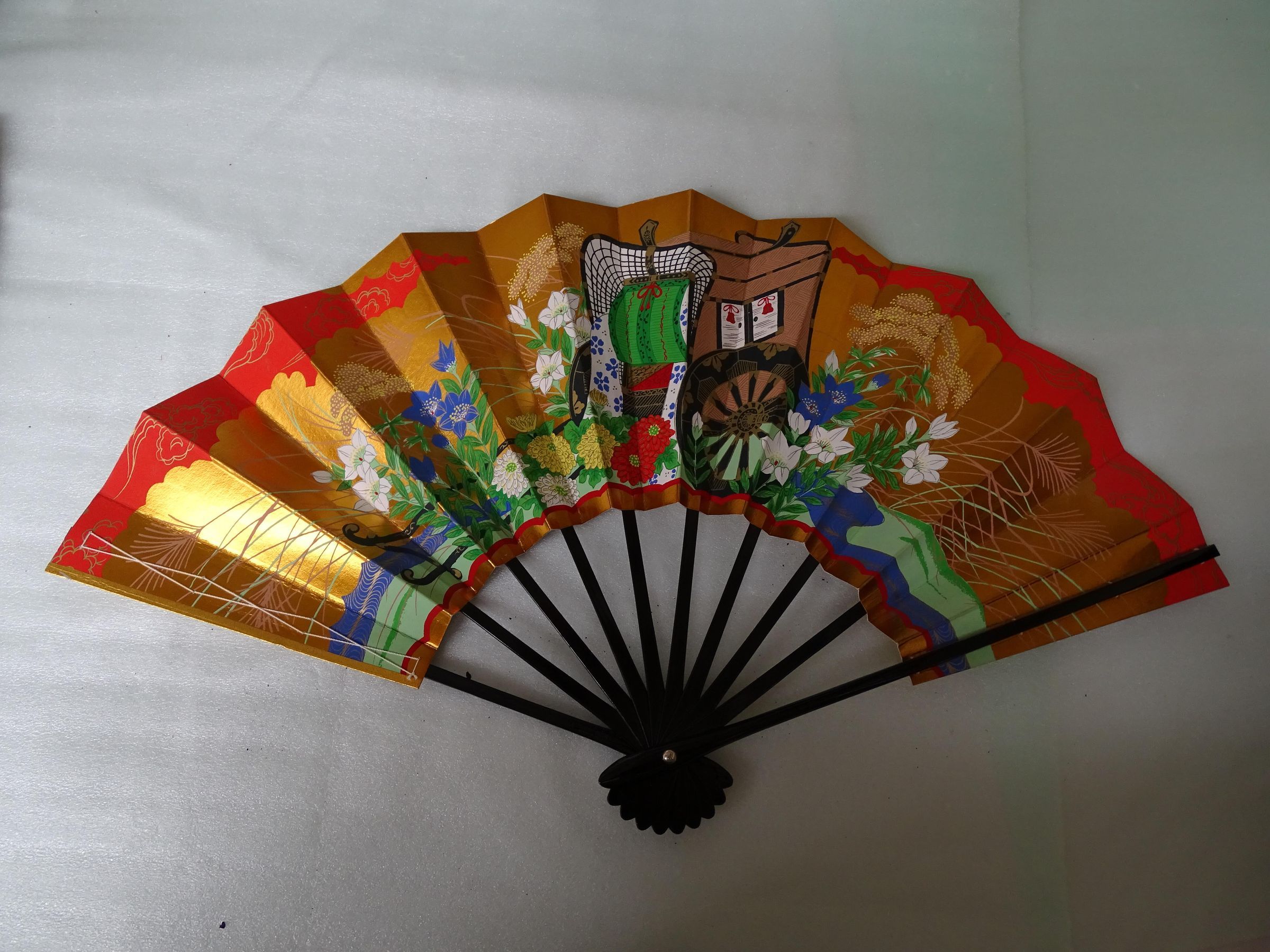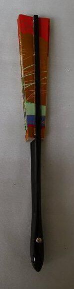 Folding paper and plastic Japanese hand fan. The accession file states that this fan is a gift to the City of Lacey from the mayor of the city of Yashiro, Japan. Ten black plastic sticks are pinned together so that they can swivel to form a fan shape. Sewed onto the top and bottom stick is a paper (almost cardboard) that is folded so that it lies flat on each of the other sticks, and permits the fan to be opened almost flat or closed to form a single stick. The paper is gold in color with pictures of swans on one side with a bit of red color, and on the other side are flowers and a wheeled vehicle with some red color.Made/Created