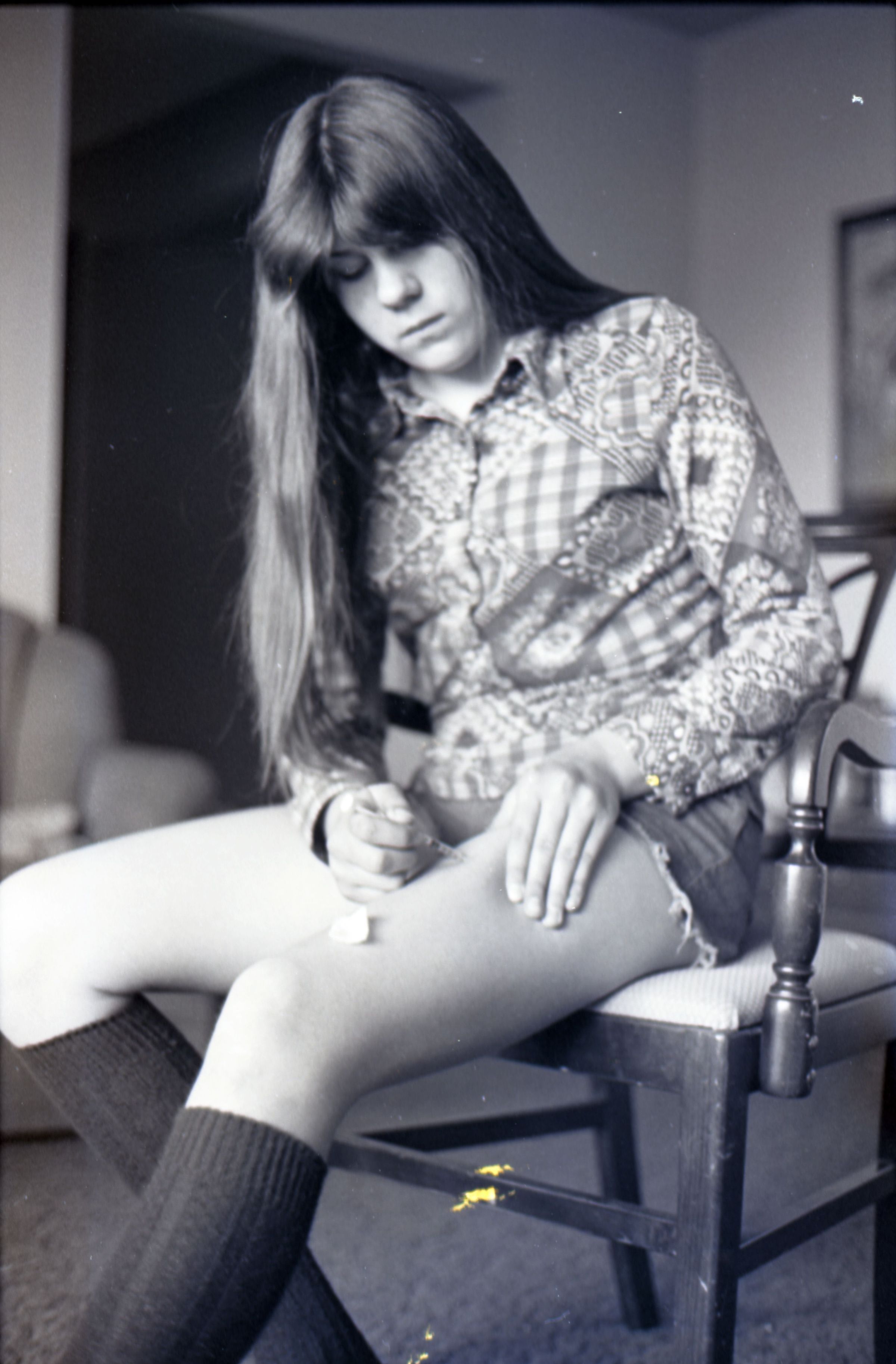 Diabetic Girl, 1976. This single black and white film negative strip was created for the Lacey Leader newspaper. These images show a young woman (Denise Kuehnle) injecting her left thigh with a syringe. This young woman has long hair and is wearing a long-sleeved top made up of quilt-like squares of various patterns. She is also wearing jean shorts and knee socks. She is sitting in a chair. She is looking downward at the syringe.