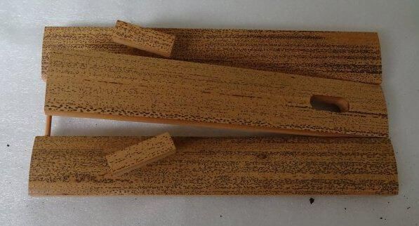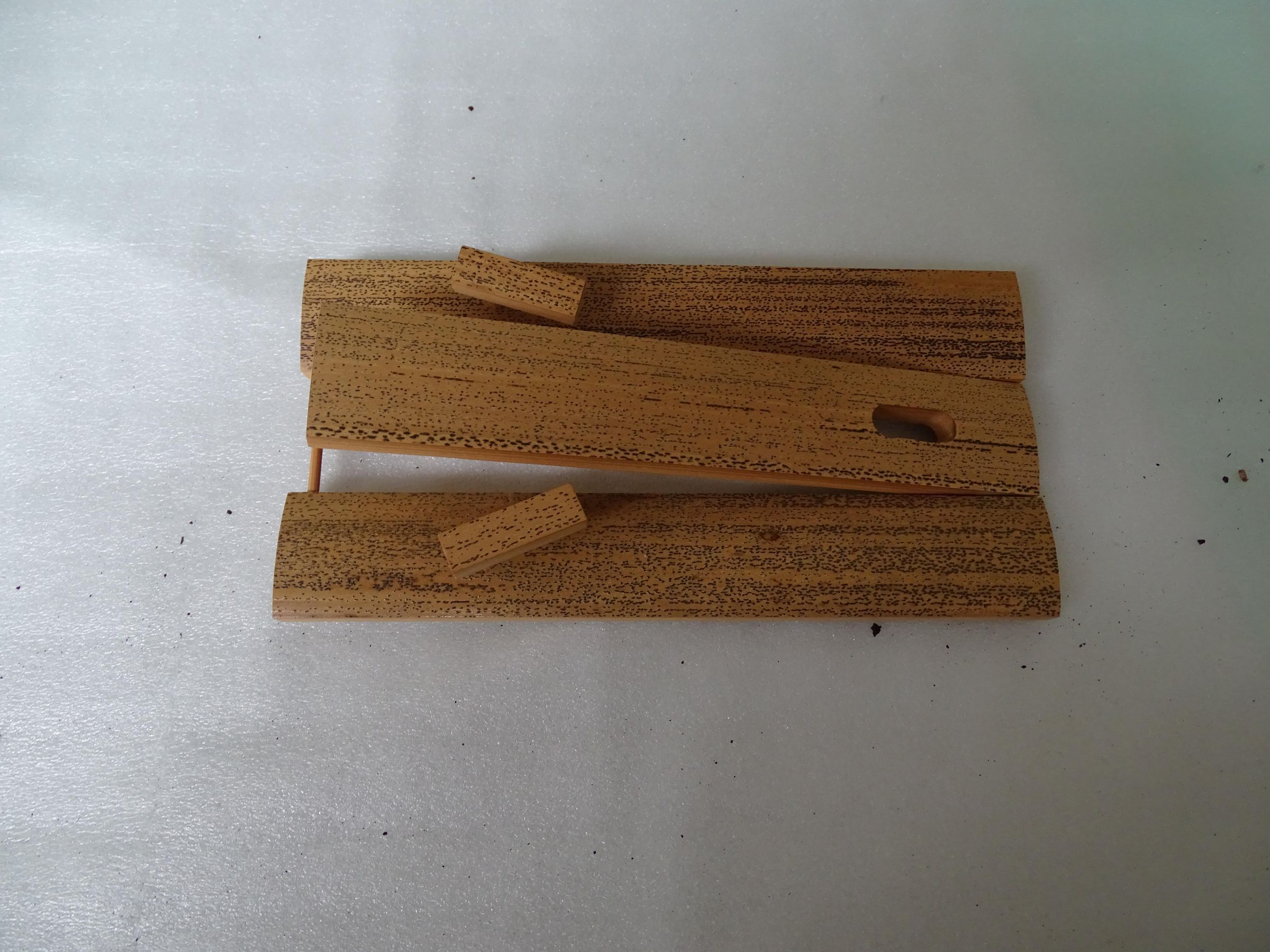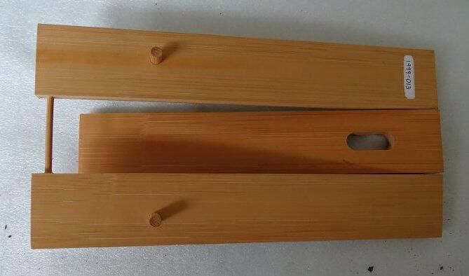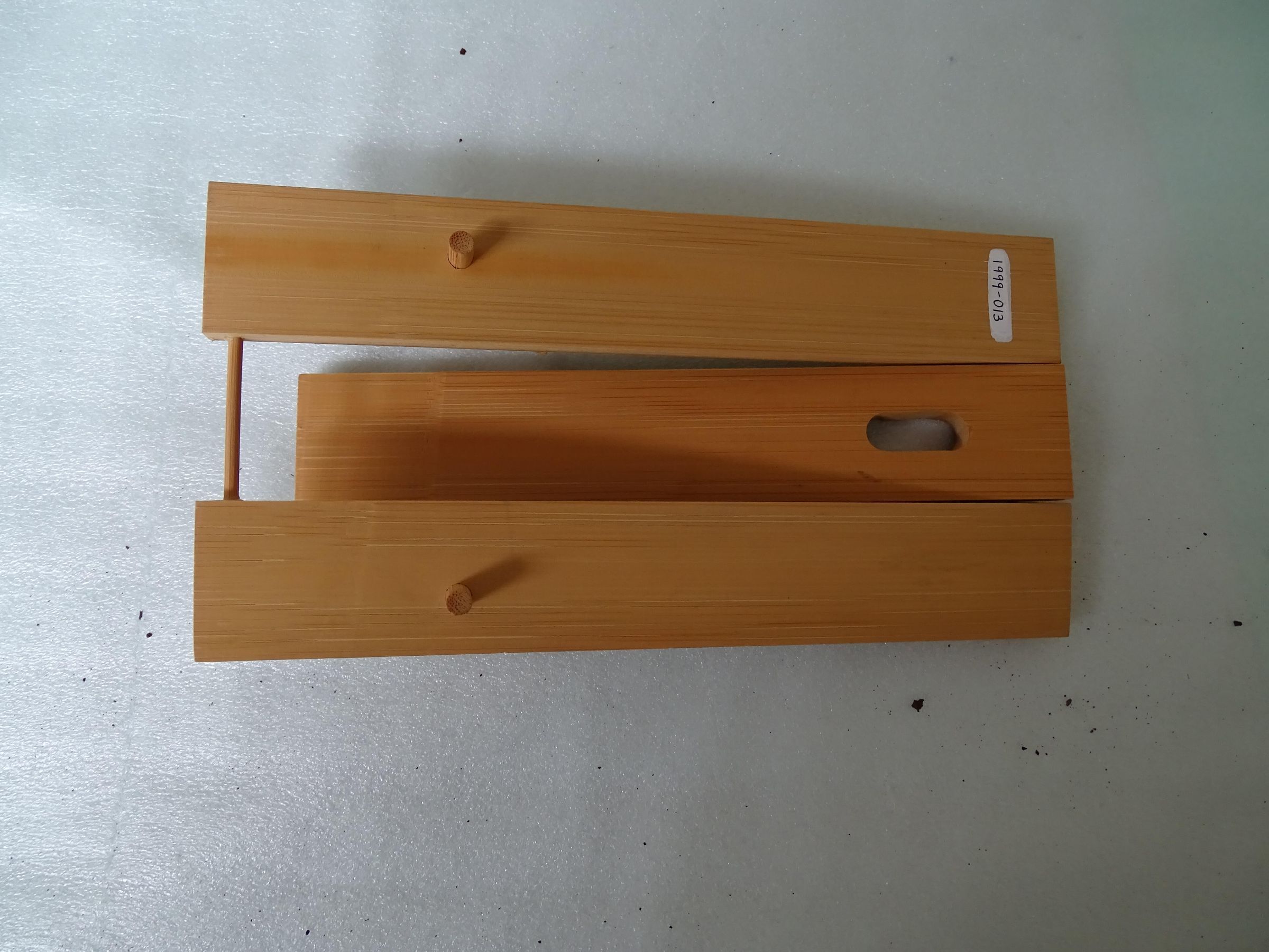 Beige colored wooden assembly made up of three wooden slats with the center slat pivoted so that the assembly stands erect. There are two small wooden pieces fastened to the outer slats with dowels to hold a folding fan. All of the wooden parts have a black stippling color.Made/Created