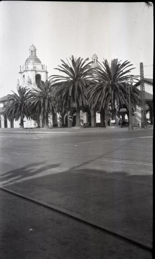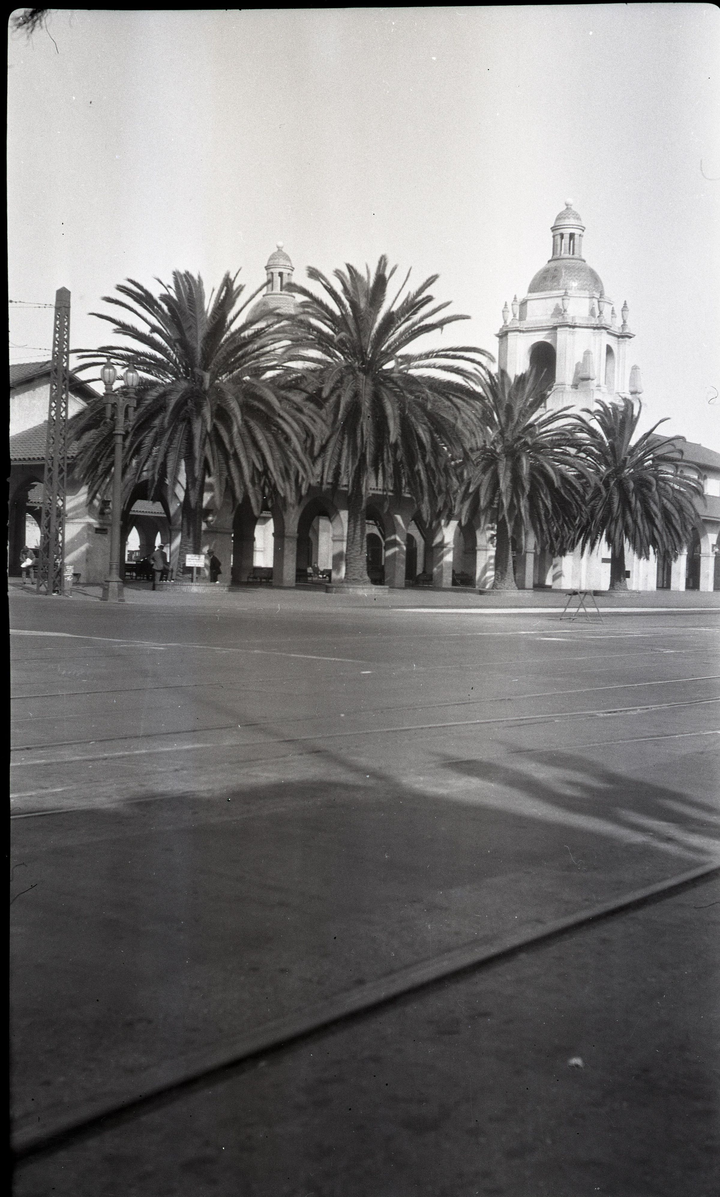 Black and white negative of a park in San Antonio. There is pavement in the foreground and behind it are palm trees and parts of a building. At the right of the trees is what appears to be a metal, latticework post. In the background are two domes.. There is a white border on all sides, and in the bottom border is "#248" and "10/17/29".