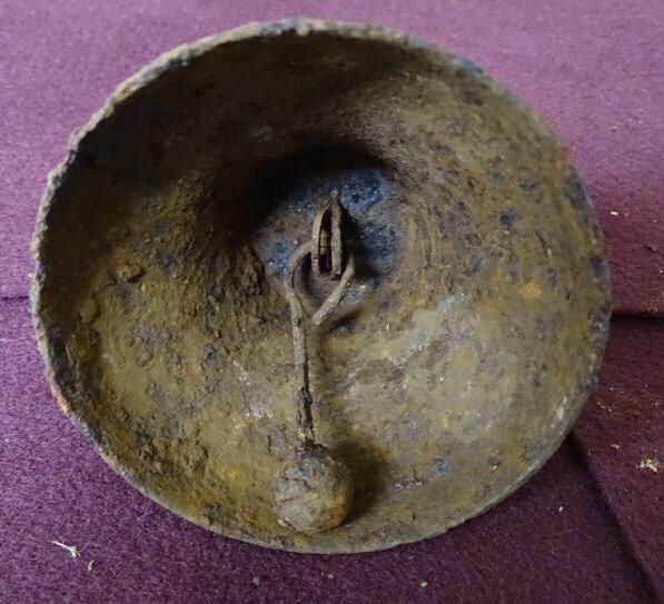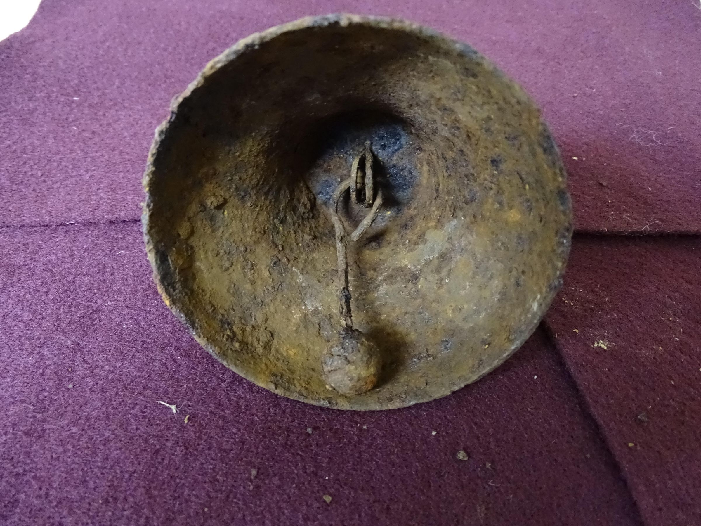 Metal bell with clapper and attachment device. The object is heavily corroded. The bell housing is cone shaped. The clapper is a round ball suspended by a wire from the center of the cone. The attachment device is a metal strip formed in an oblong shape that would slide onto a belt or collar. The object was apparently attached to an animal, probably a cow, to keep track of its location.