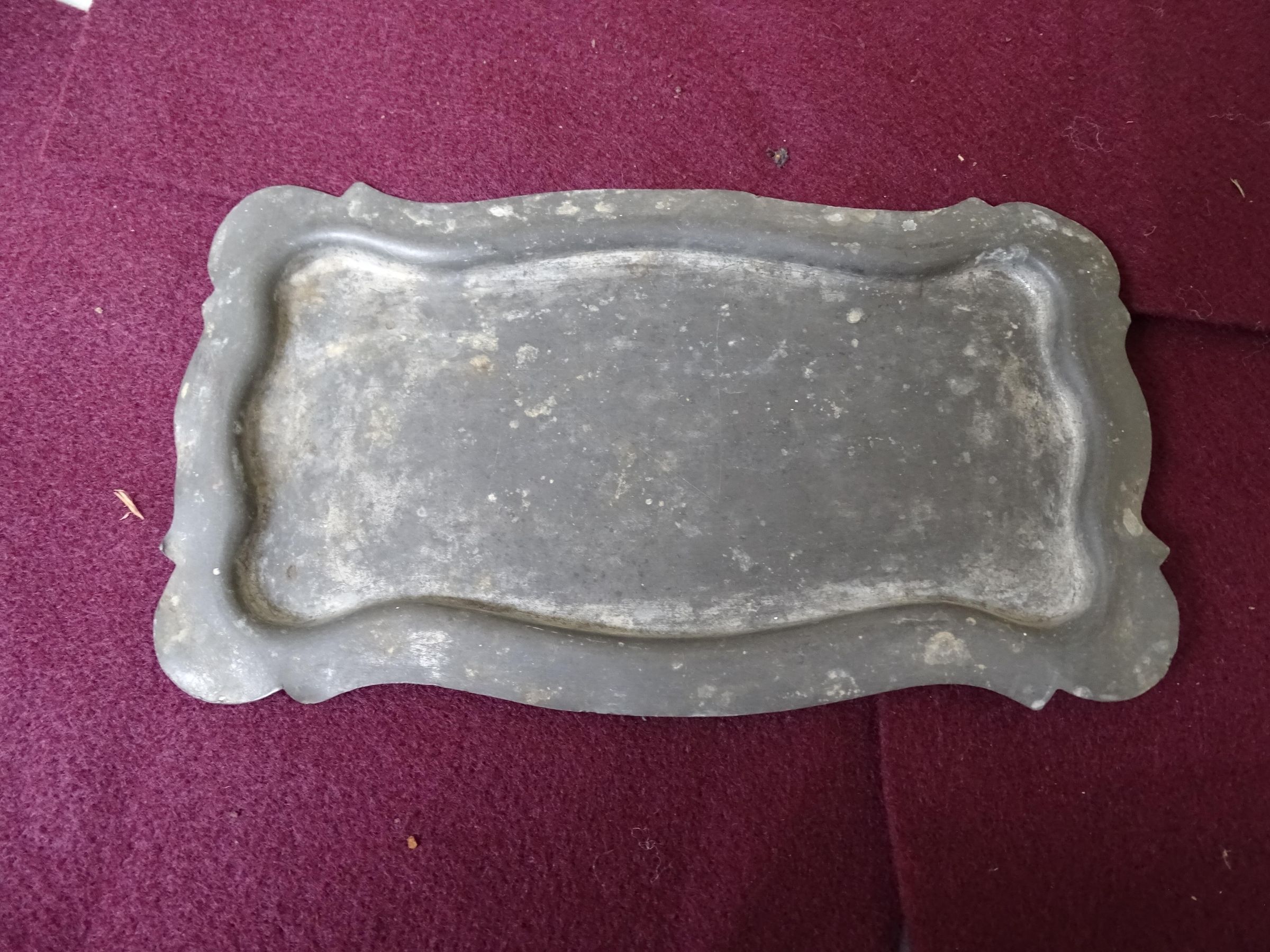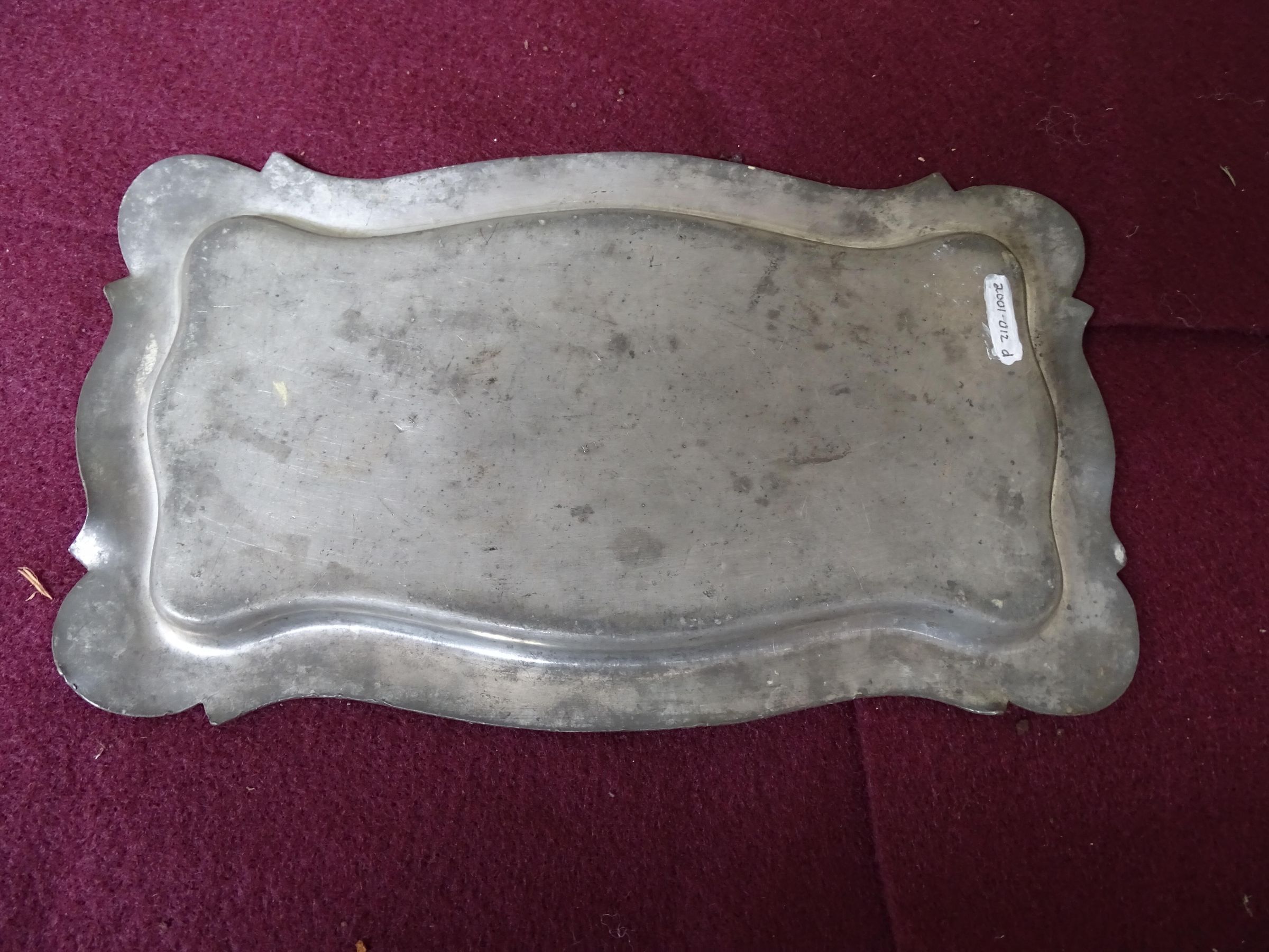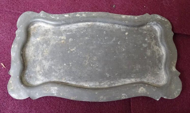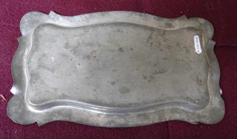 Scalloped metal tray, possibly silver plated. The purpose of the tray was to receive visitor's cards. The tray is tarnished.