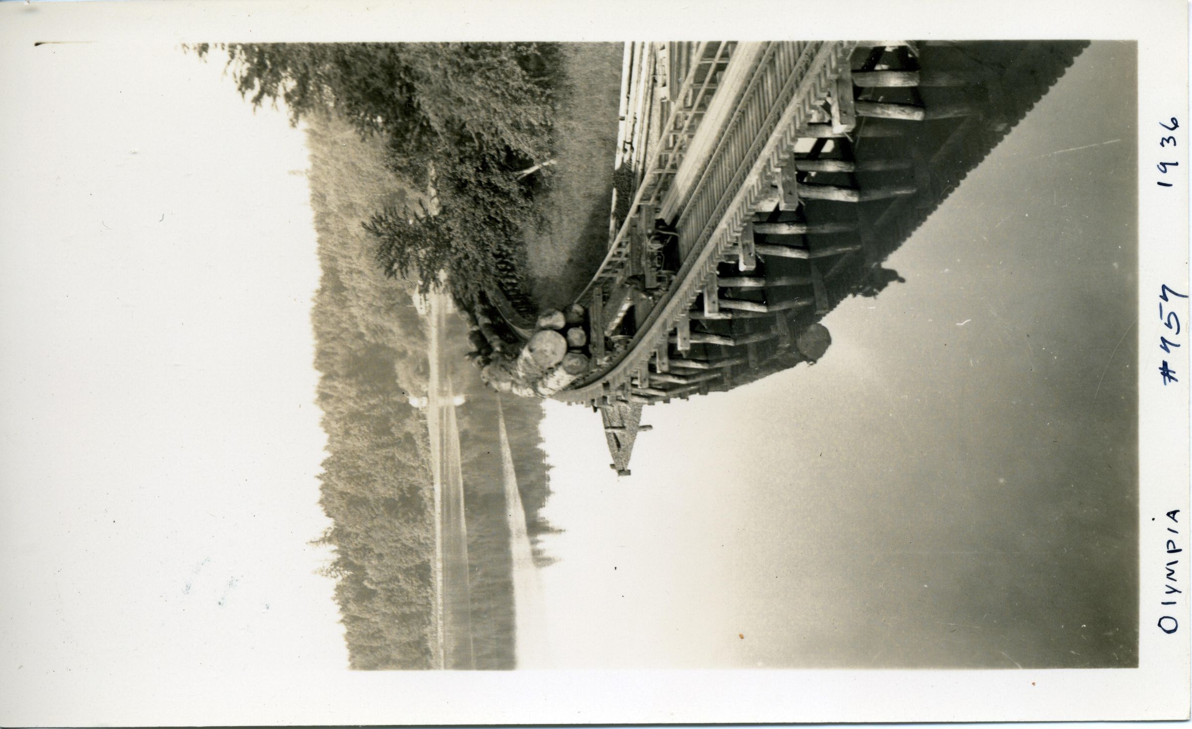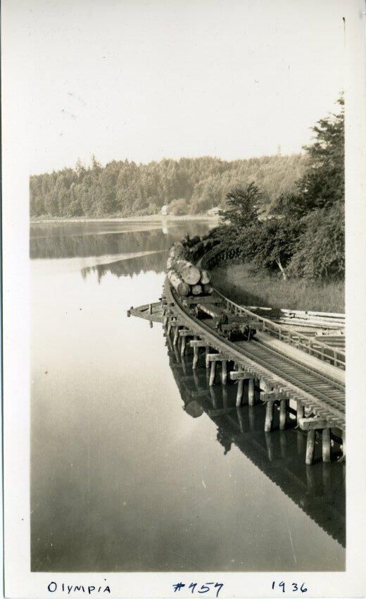 Black and white photo of a logging train on a track above Budd inlet. There is water to the left and on the right is a train on a curved track supported by pilings. Only the end of the train is visible, and the last car is empty and beyond that are flat cars with large tree trunks. Beyond the track are trees and reflections of trees in the water. There is a white border on all sides, and in the bottom border is "Olympia #757 1936". On the back is "443".