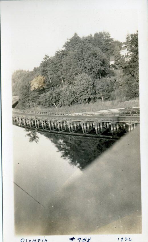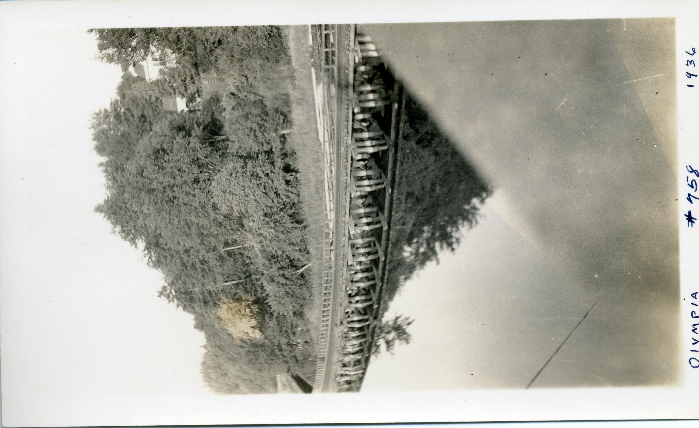 Black and white photo of a railroad track that is supported by pilings above Budd inlet. In the foreground is an out-of-focus object that may be a bridge railing. The track is curved and beyond it are trees on a hillside. There are reflections in the water of trees. There is a white border on all sides, and in the bottom border is "Olympia #758 1936" On the back is a faded stamp that appears to be "443".
