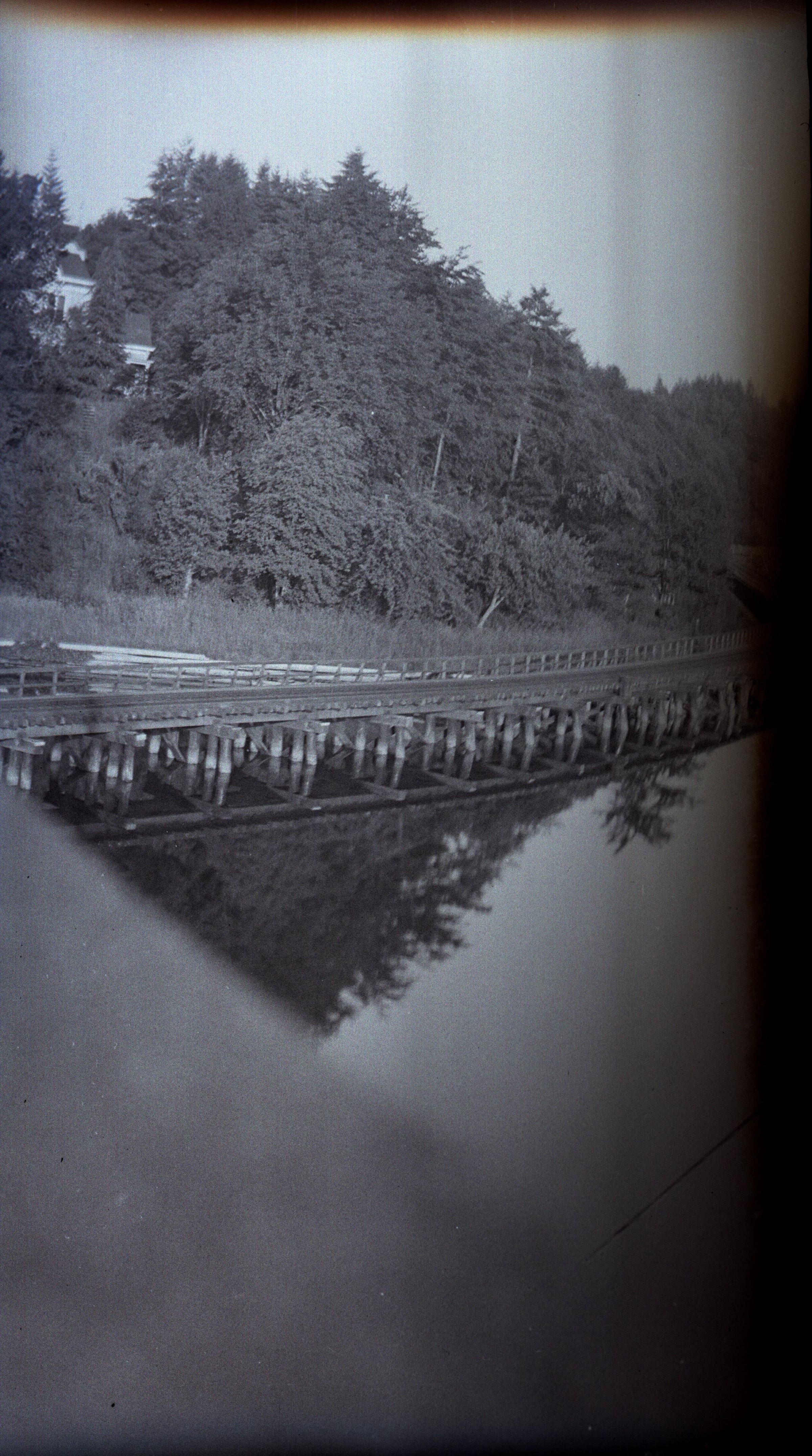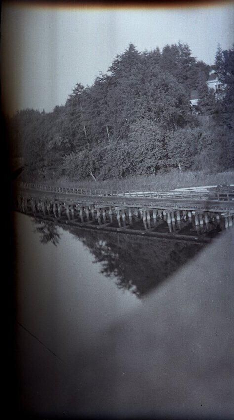 Black and white negative of a railroad track that is supported by pilings above Budd inlet. In the foreground is an out-of-focus object that may be a bridge railing. The track is curved and beyond it are trees on a hillside. There are reflections in the water of trees. There is a white border on all sides, and in the bottom border is "Olympia #758 1936"