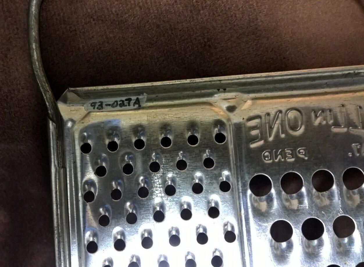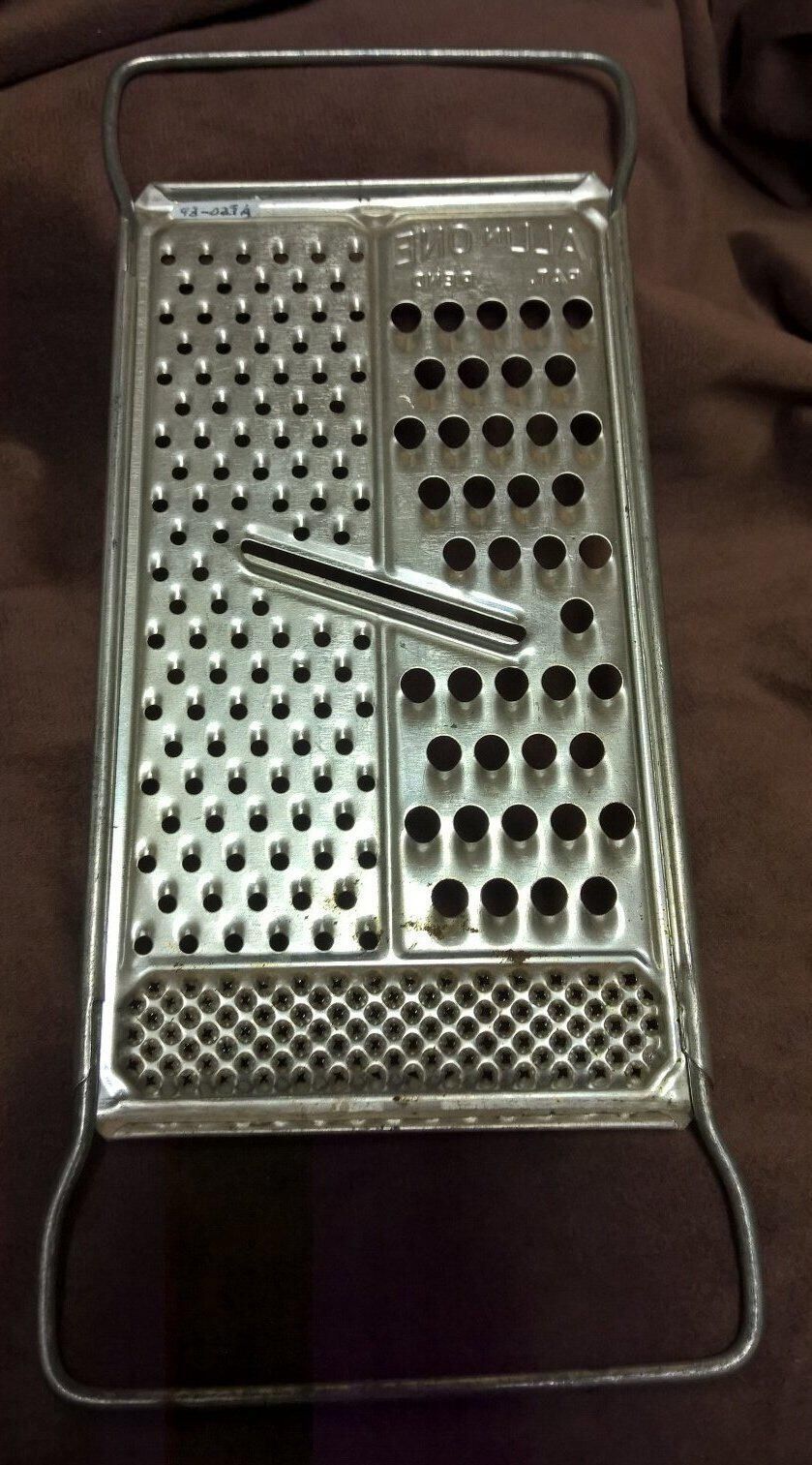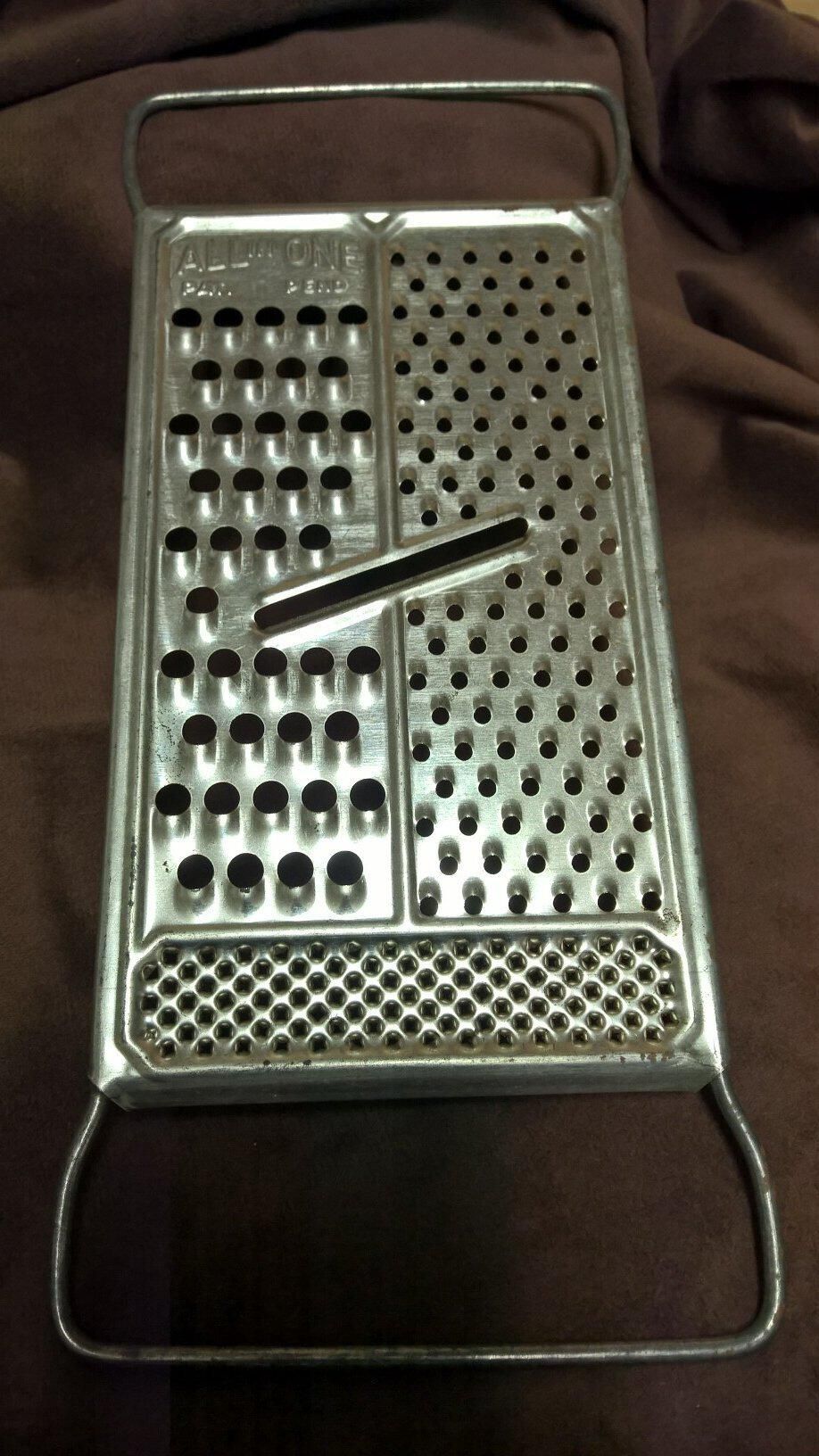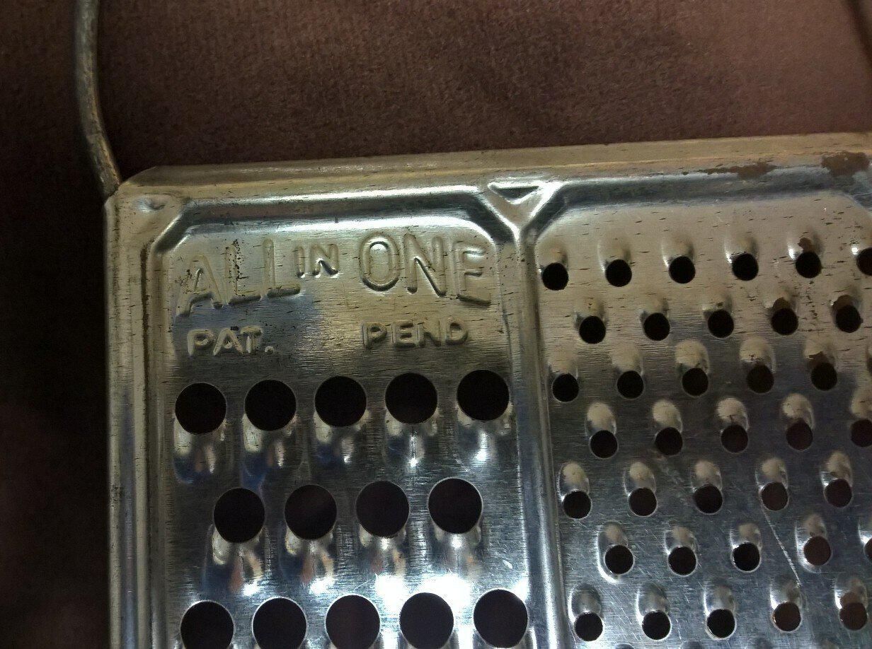 Metal rectangular device for grating cheese. The object is a flat rectangular metal sheet with a handle on each end and three sections with different size holes stamped into the sheet so as to leave a sharp edge around the holes. There is also a larger slot in the center for slicing. Pressed into the sheet are the words "All in One Pat. Pend".Made/Created