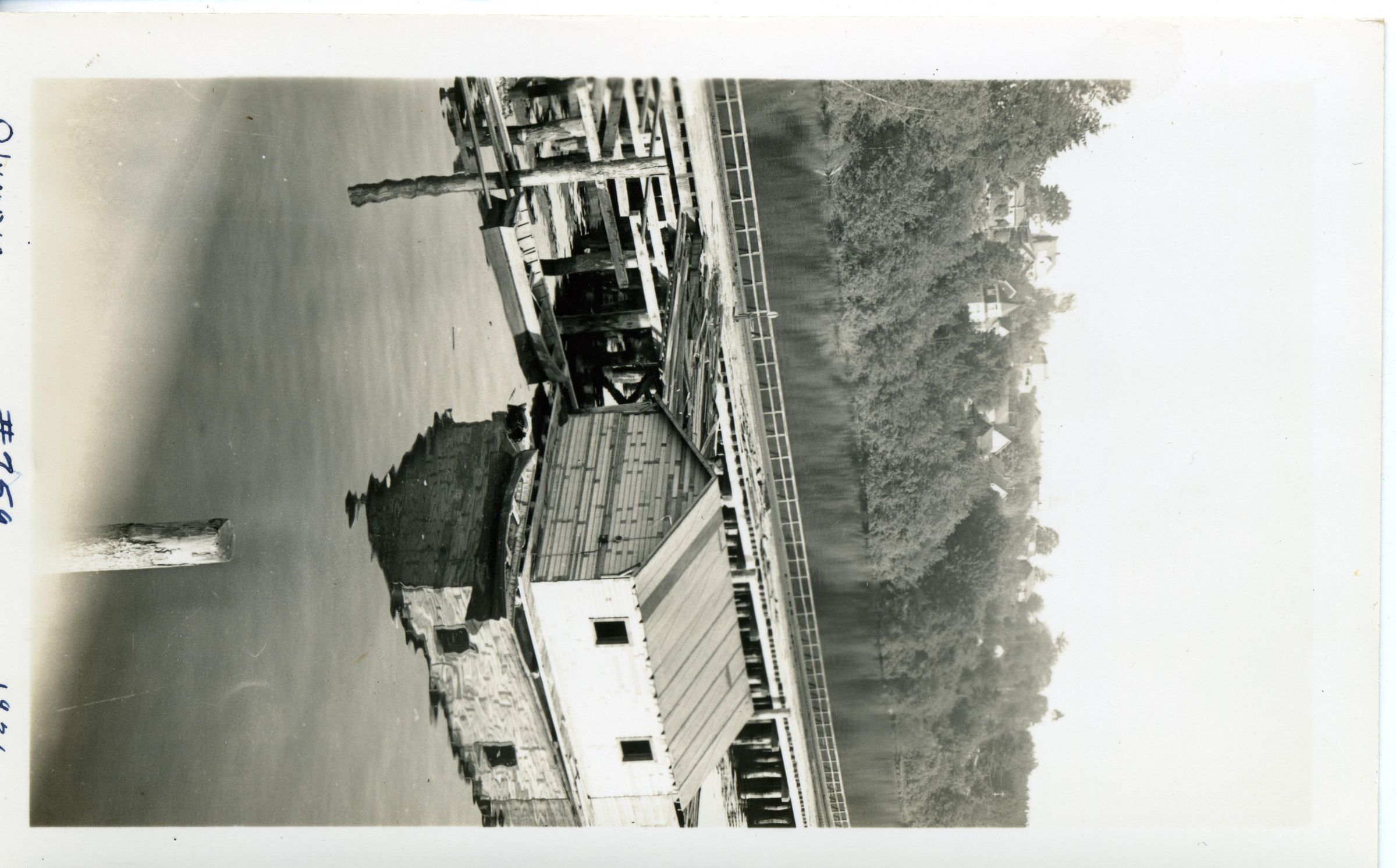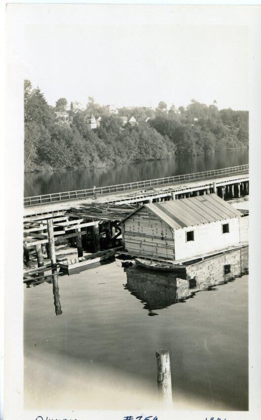 Black and white photo of a float house on Budd inlet. In the foreground is a single piling and water. The house is a structure mounted on logs. Behind it is a structure made up of pilings and beams with what appears to be small trees laid across it. Behind that is a roadway or dock with a railing that extends from one side to the other. Beyond that is more water and trees and houses on a hillside. There is a white border on all sides, and in the bottom border is "Olympia #759 1936" On the back is a faint stamp that may be "443".