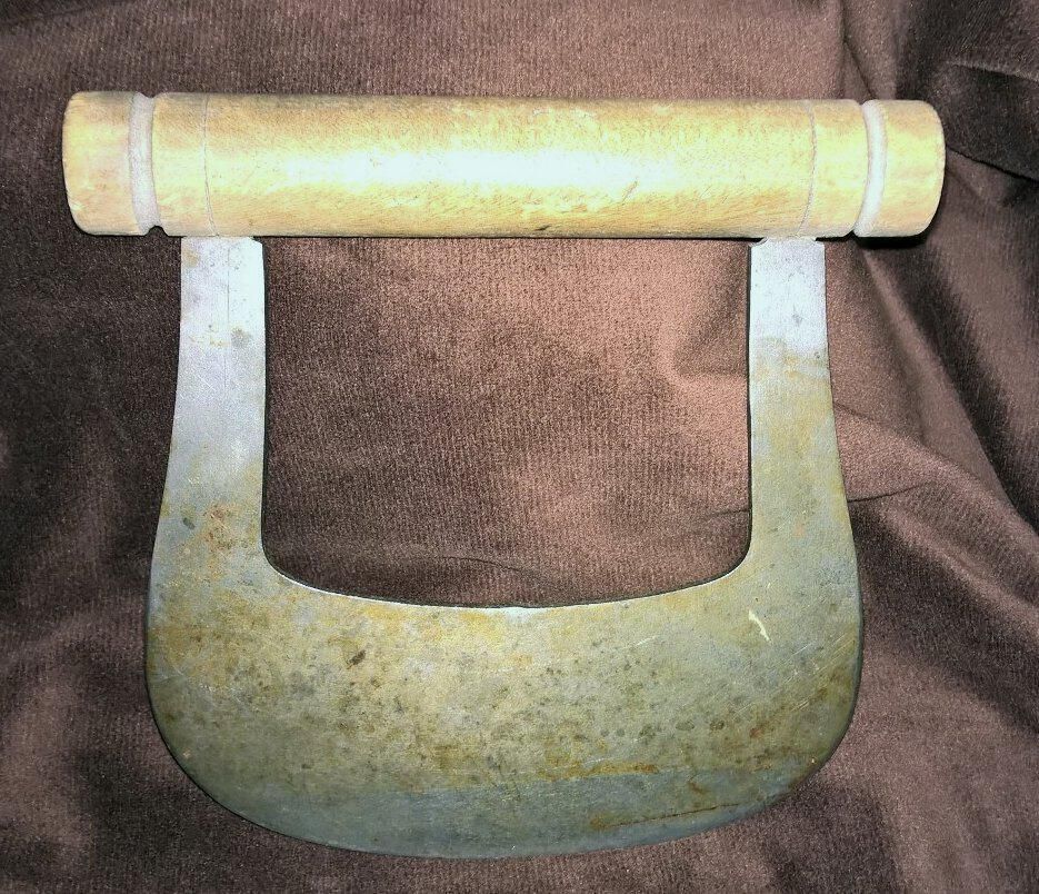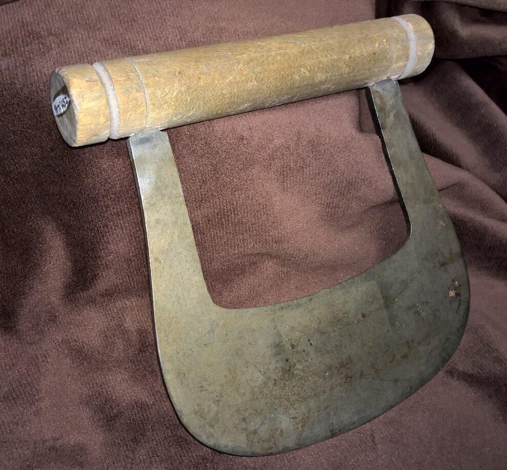 Metal blade with a wooden handle for chopping vegetables or other foods. The blade is steel in a scimitar shape with double tangs extending into the wooden handle near each end. Turned wooden handle has two grooves on either end. Outer groove is thicker than inner groove.Made/Created