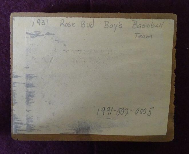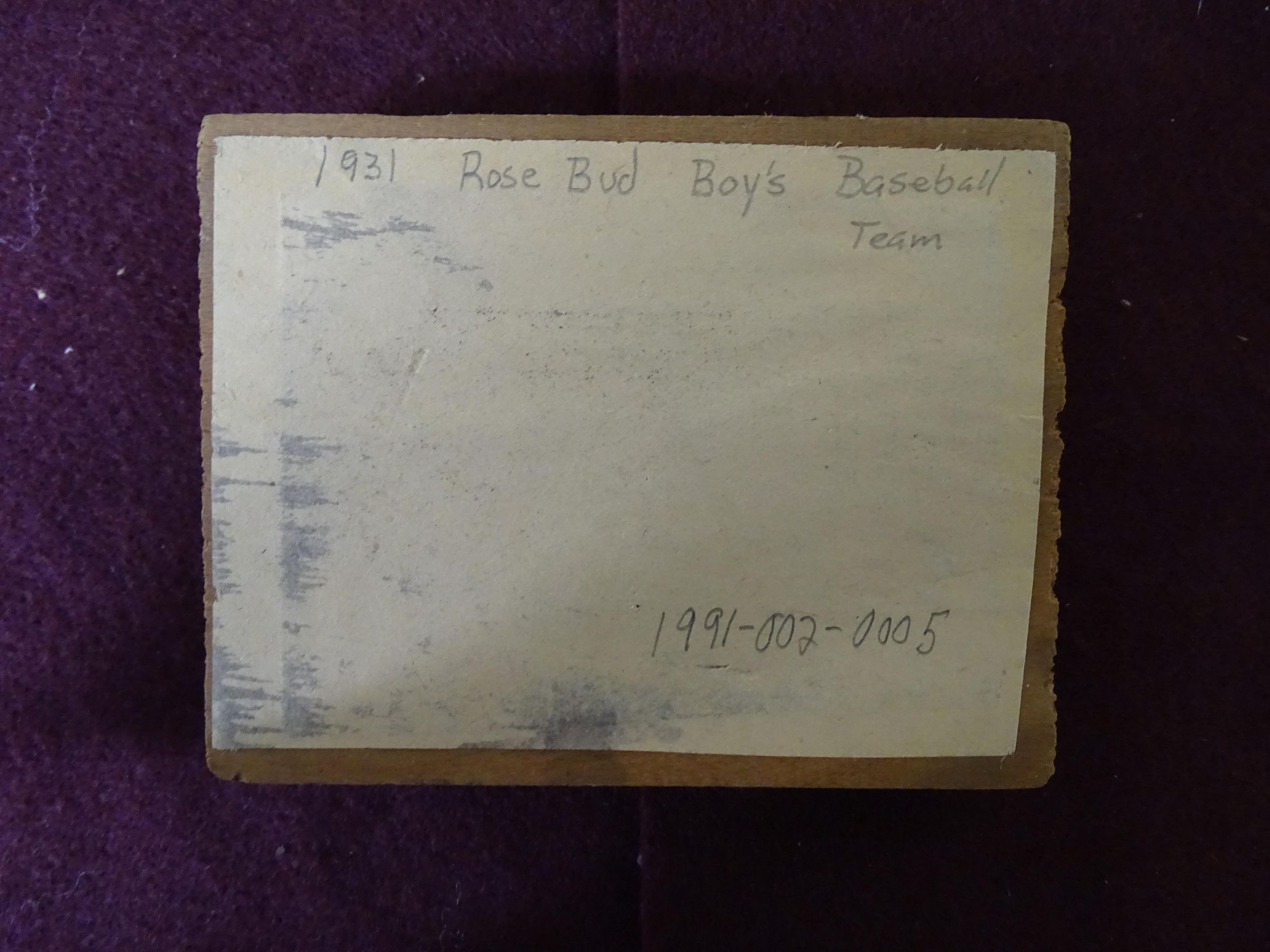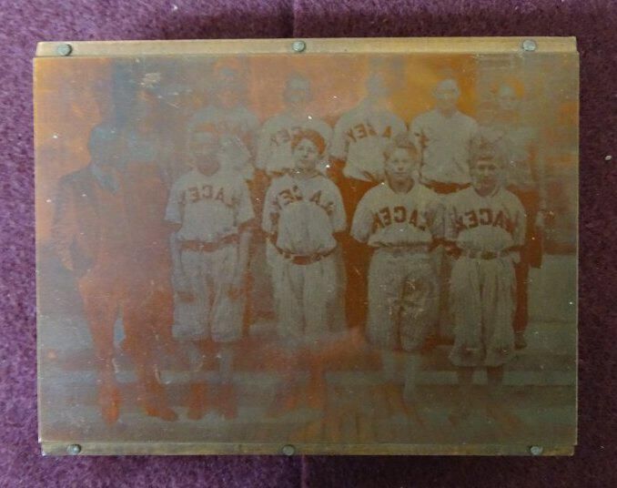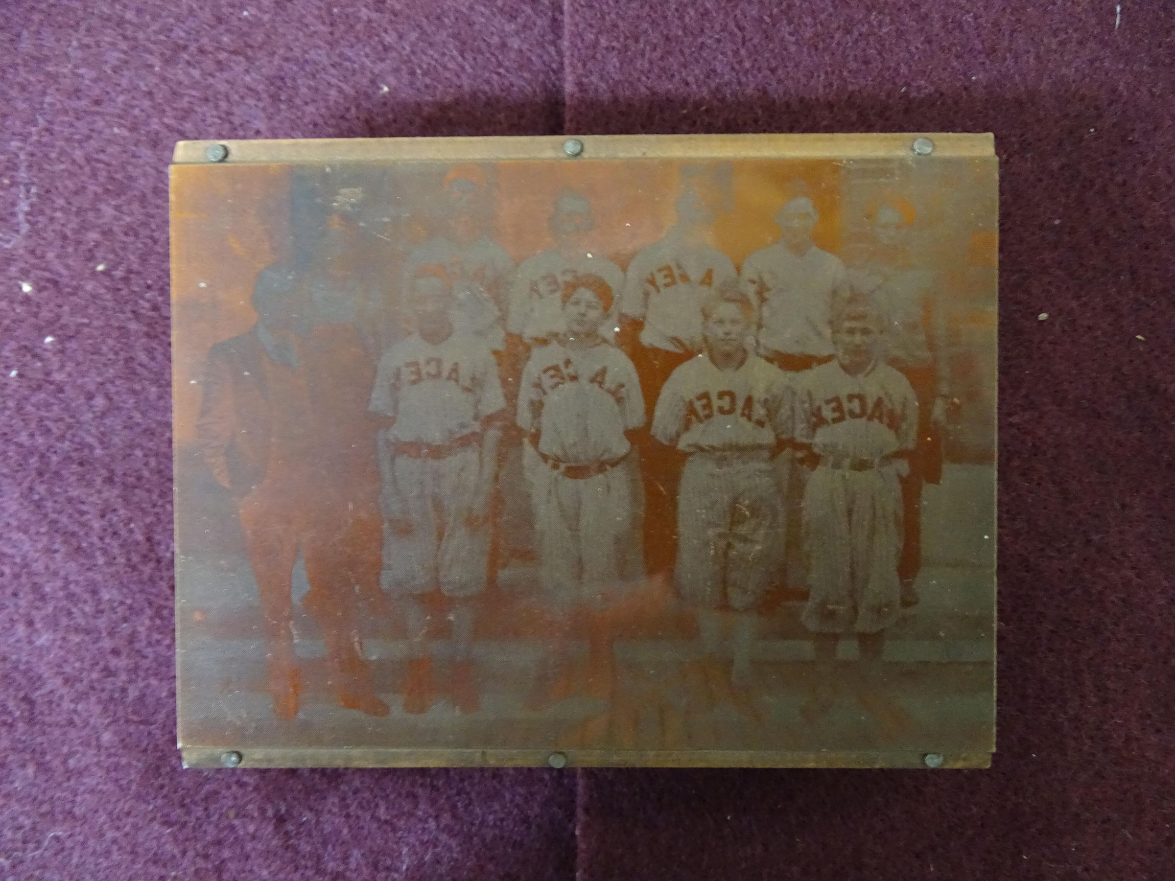 This plate was used in printing the Lacey School annual "Rosebud" and is a picture of the 1931 boy's baseball team. Front row (L to R): Williard Miller Jr., Earl Prichard, Dick Levesque, Ford Mullen, and Mr. C. M. Manley. Second row: Cyrus Dimmick, Billie Ottinger, Earnest Cheadle, George Amans, Emil Zindt, and Harry Firkins.Dimensions