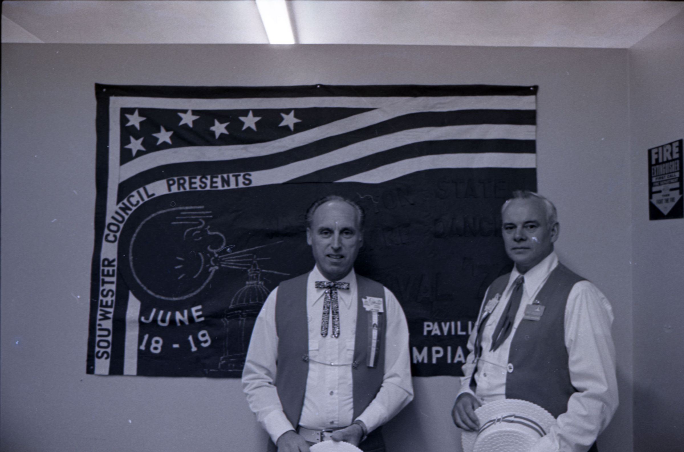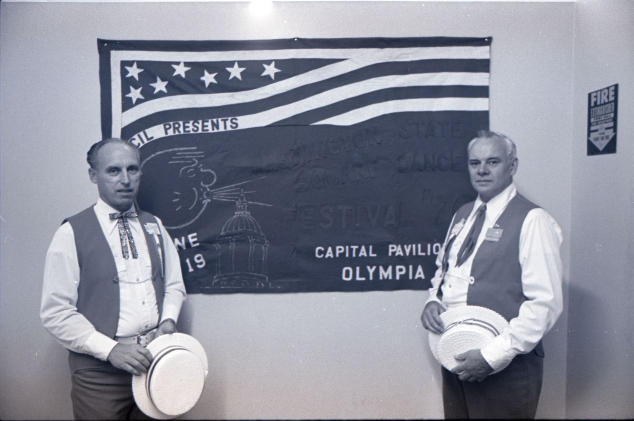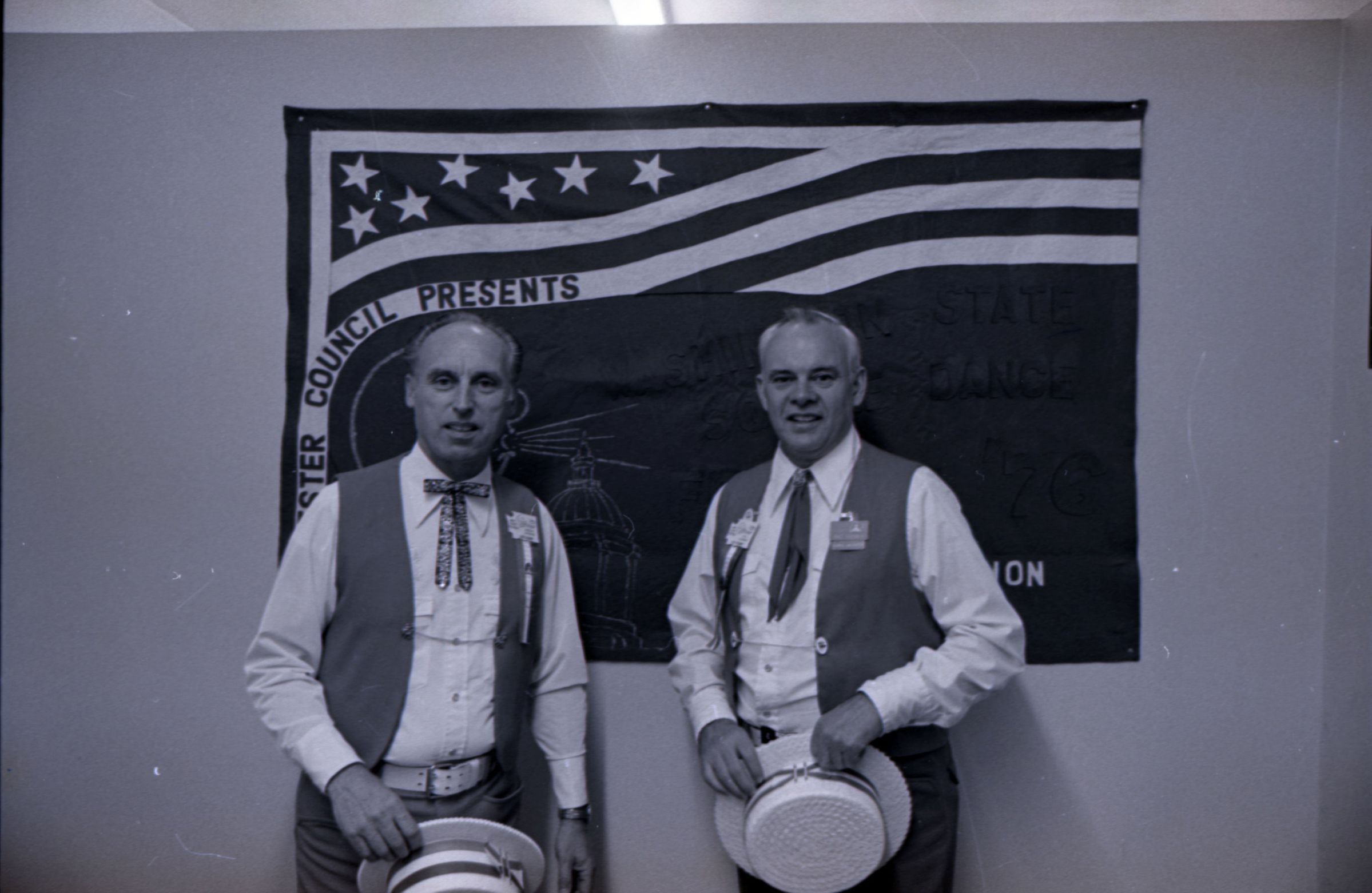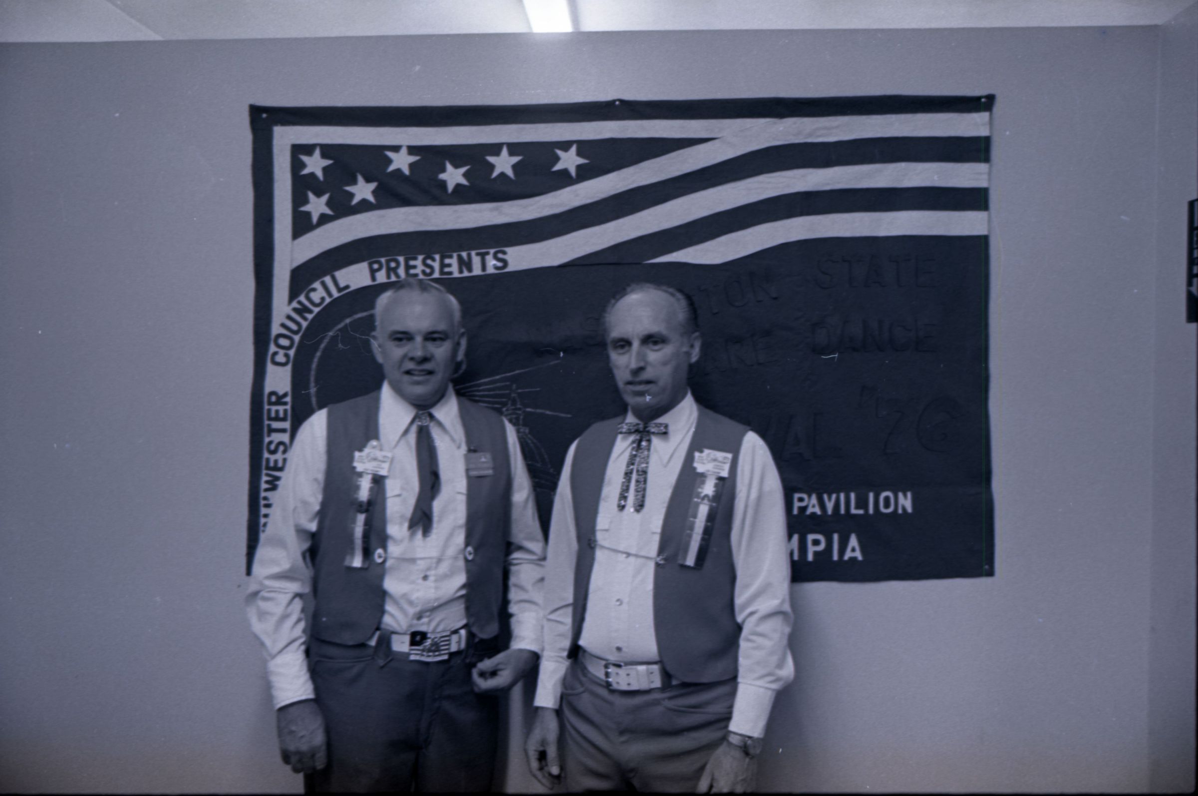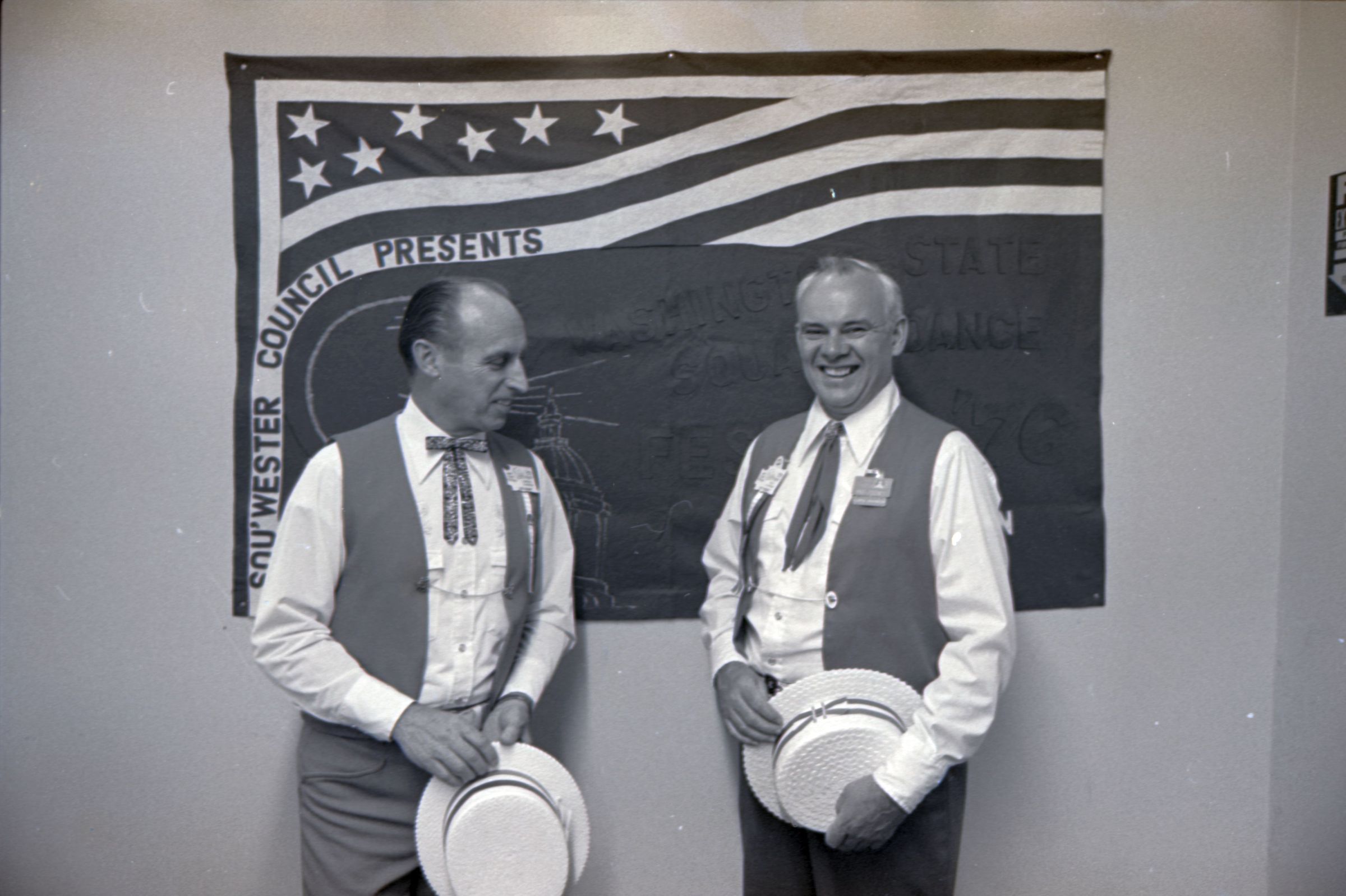 Square Dance Festival, 1976. These two black and white film negative strips were created for the Lacey Leader newspaper. These images show children standing on the shore of the Deschutes River holding innertubes, and two men in western-style outfits posing in front of a banner.Made/Created