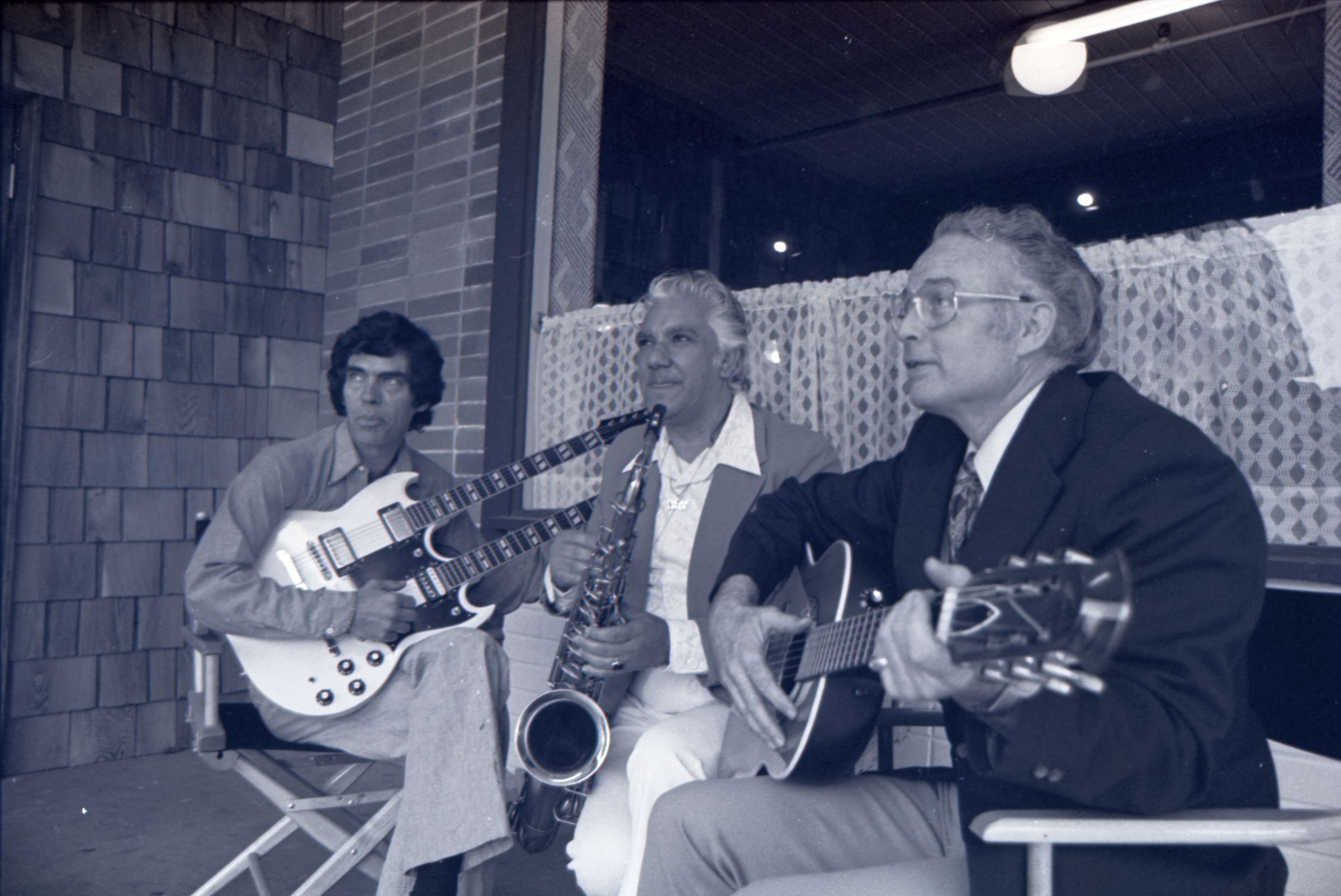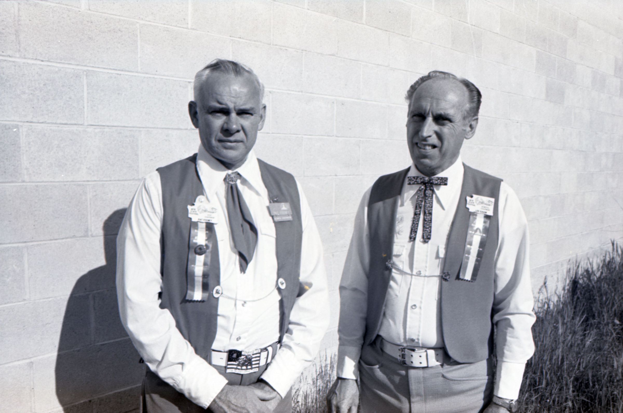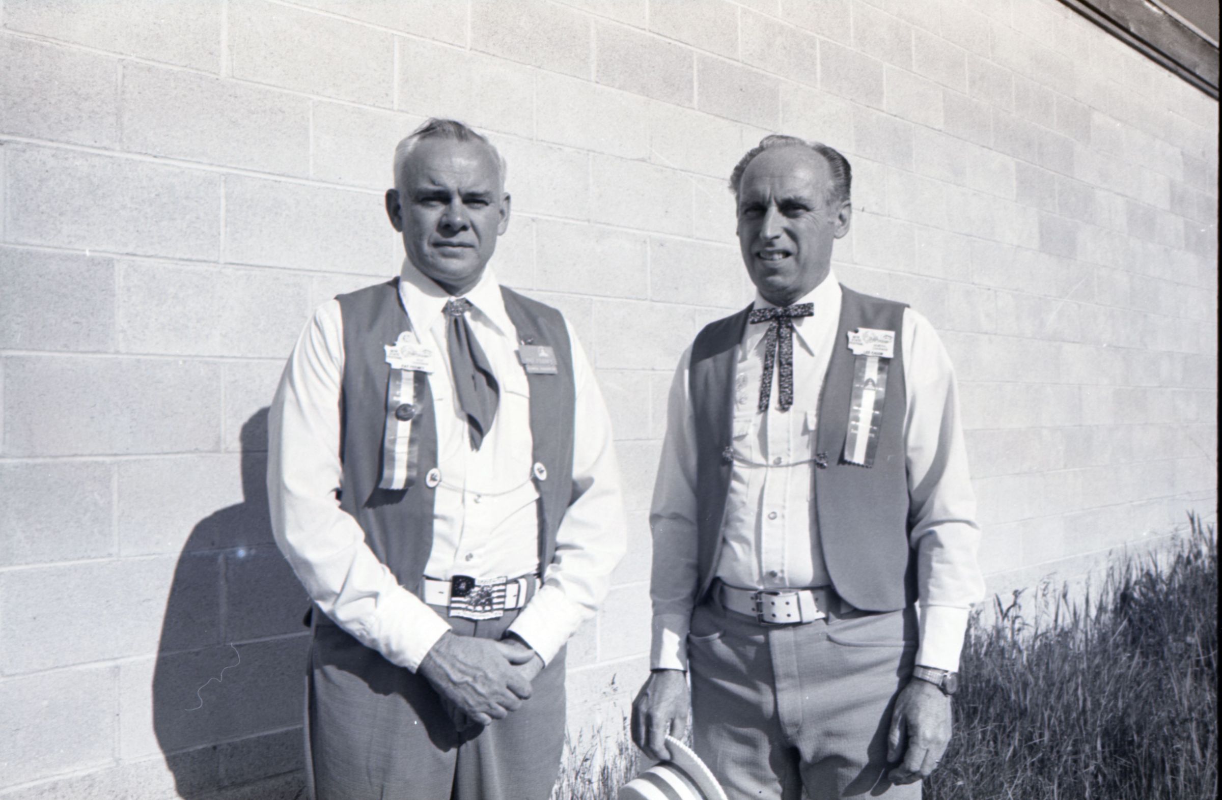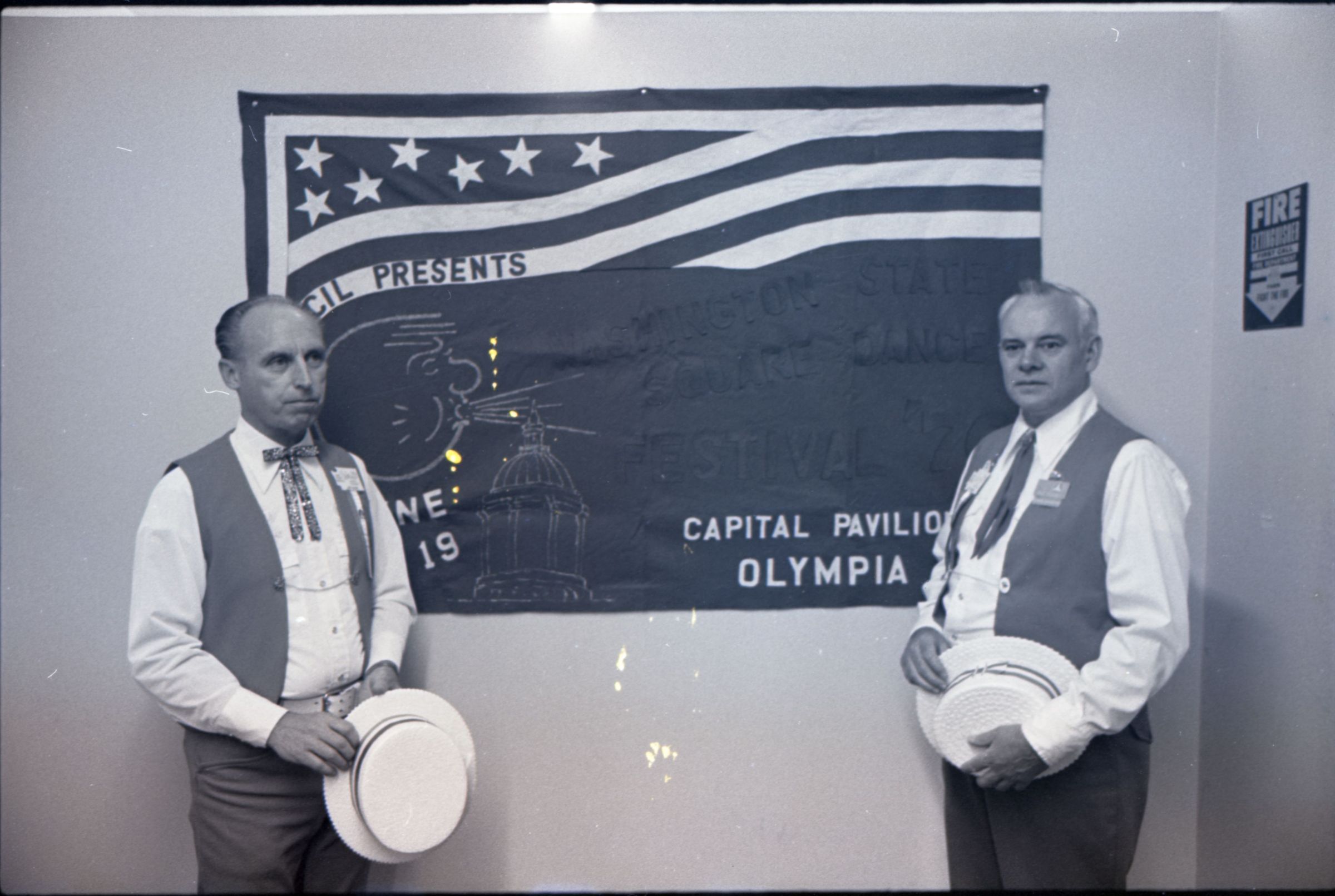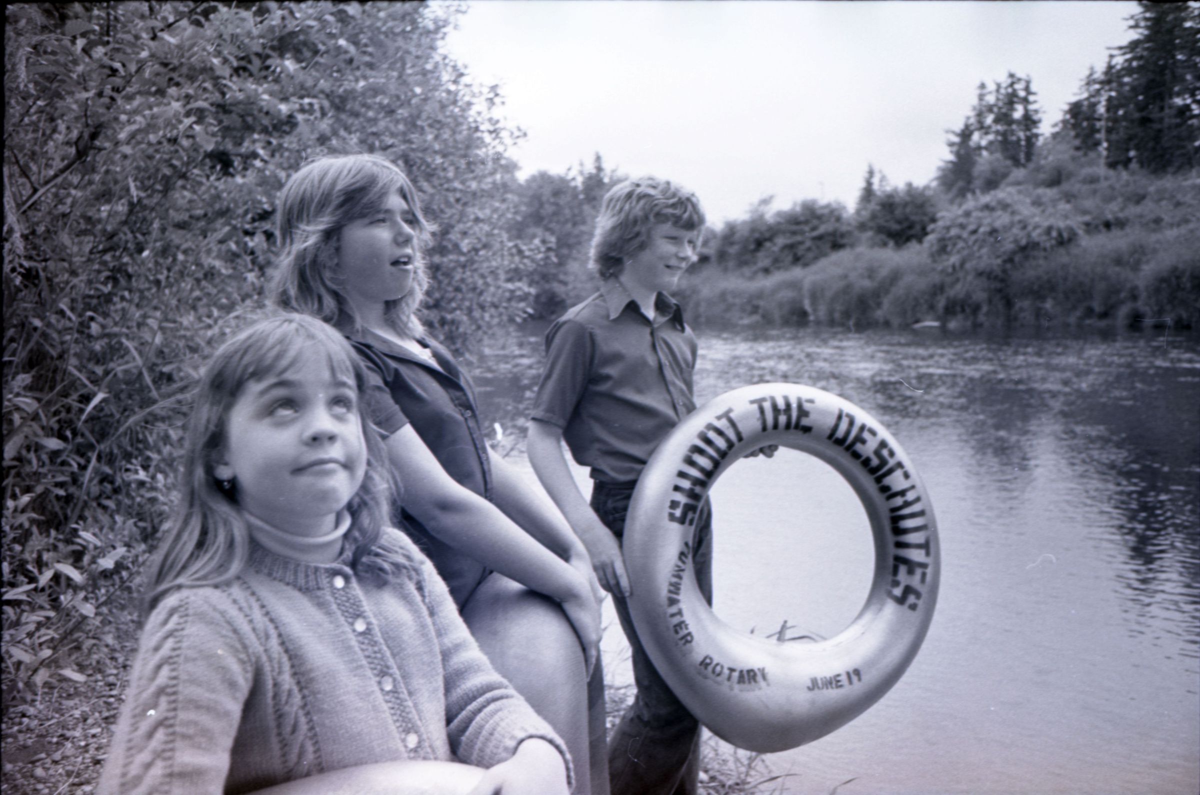 Square Dance Festival, 1976. These two black and white film negative strips were created for the Lacey Leader newspaper. These images show children standing on the shore of the Deschutes River holding innertubes, and two men in western-style outfits posing in front of a banner.Made/Created