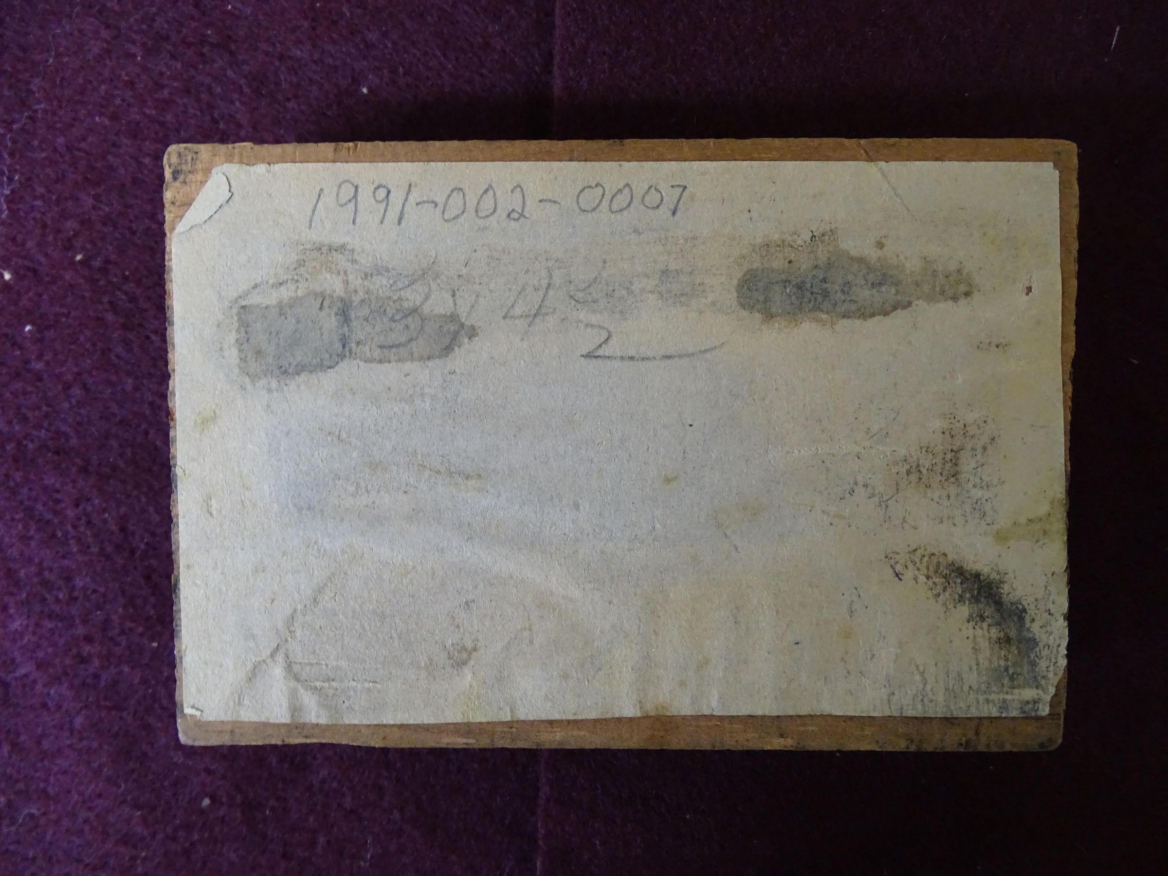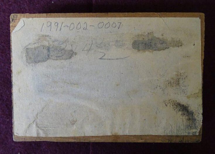 Wood and metal (copper) printer's plate used to transfer an image to paper. The copper plate has been engraved with an image and is intended for use in an offset printing press. The plate is attached to a wooden block with small nails so as to fit in the printing tray of the press.