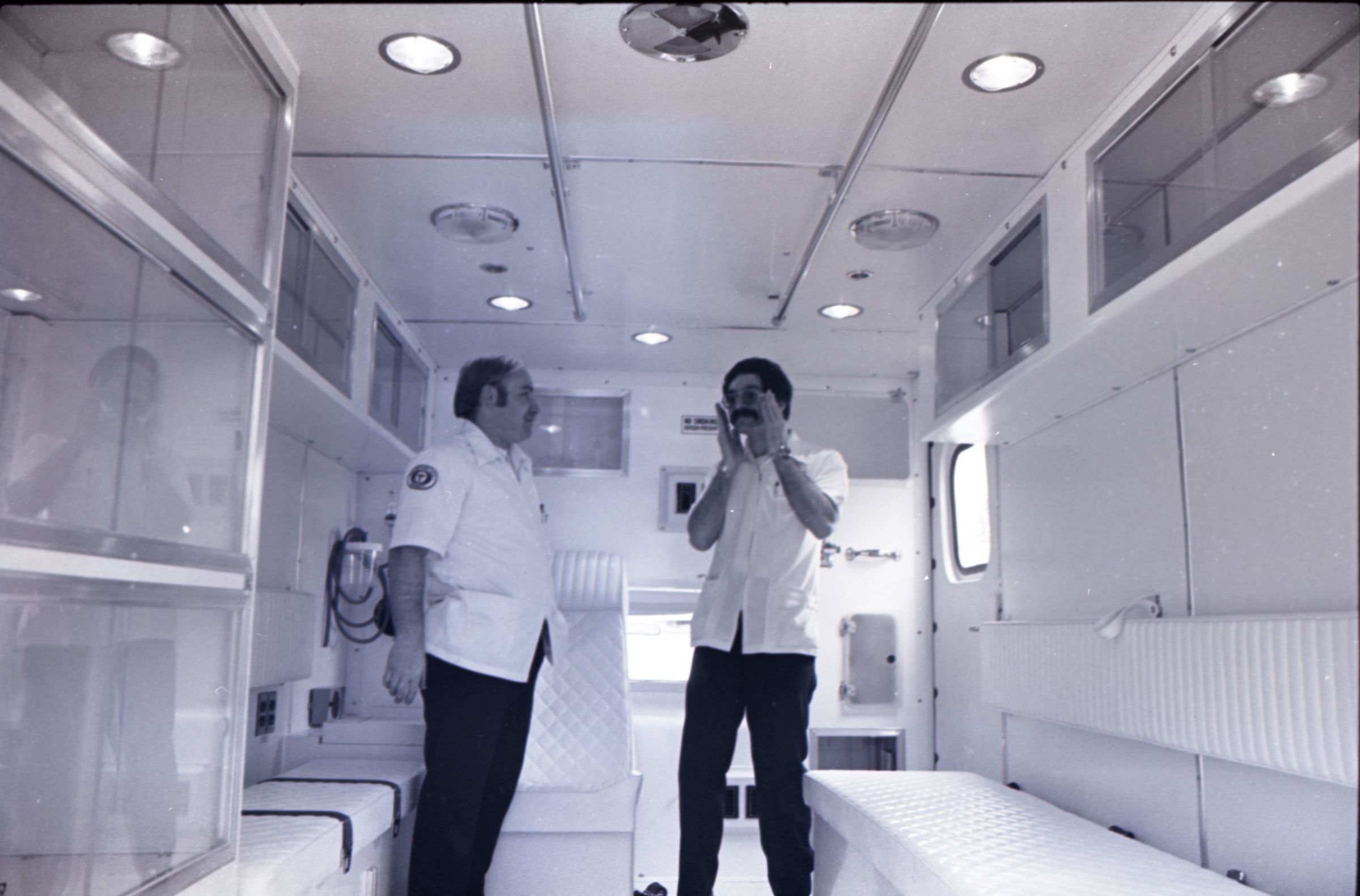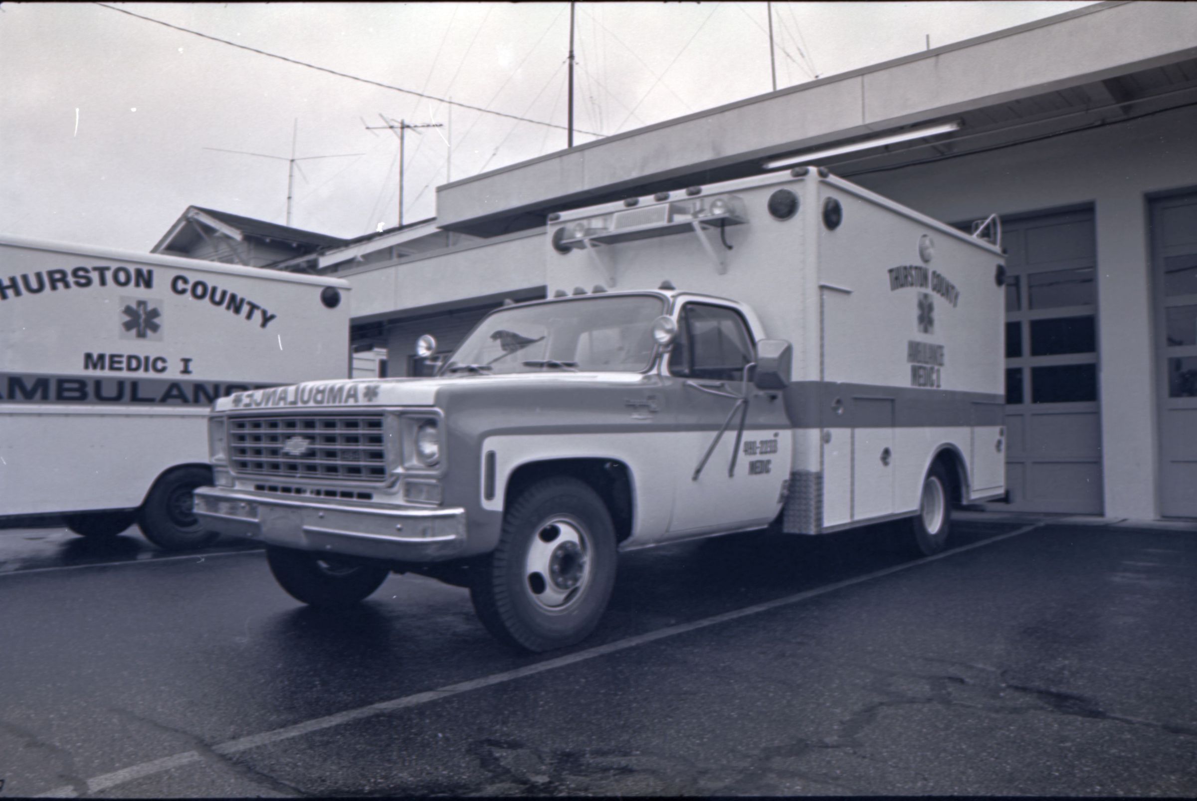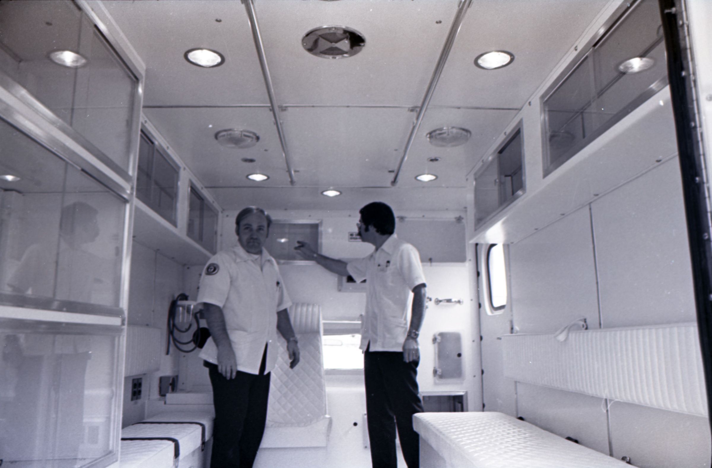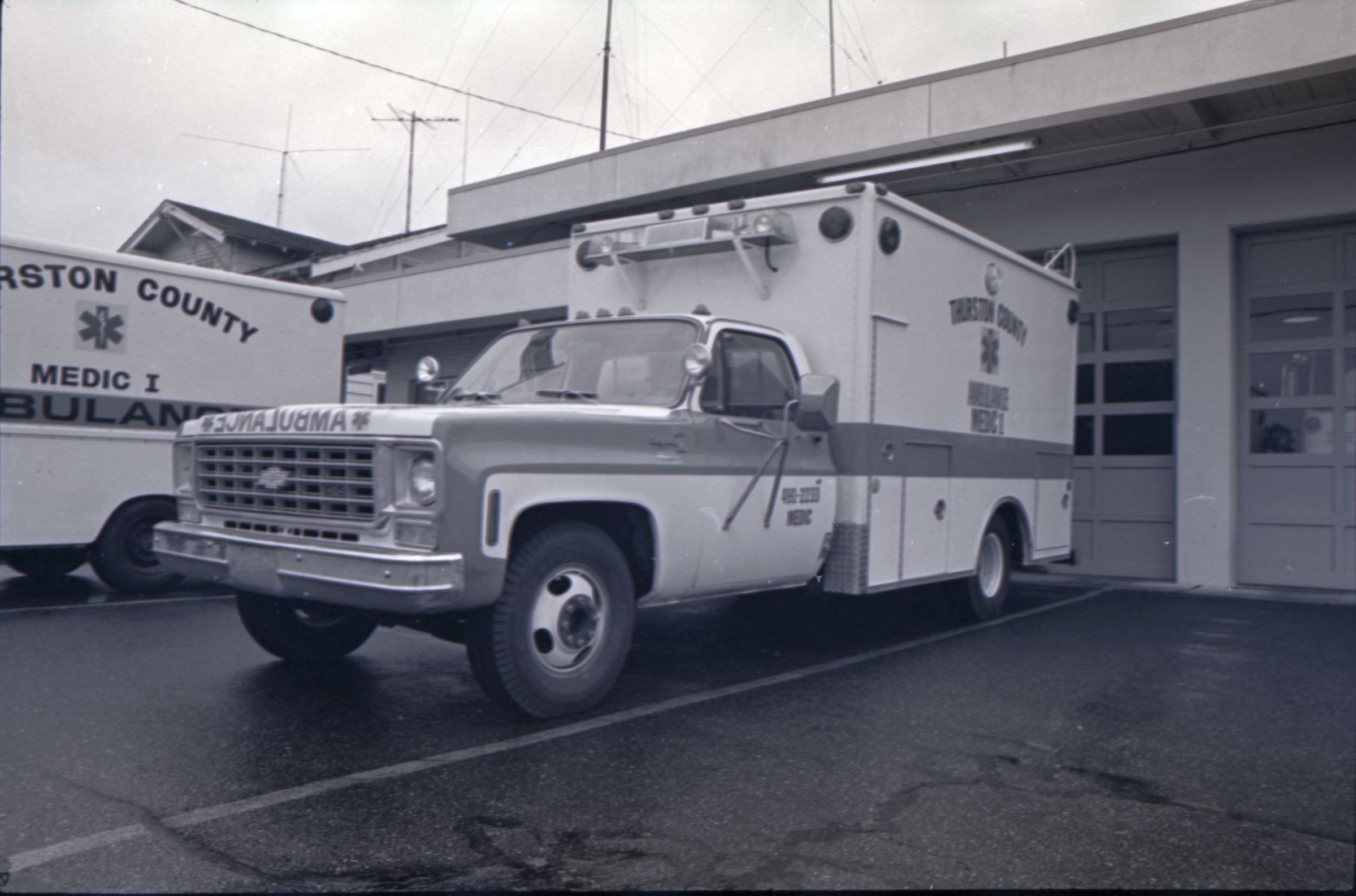 Medic One, 1976. These two black and white film negative strips were created for the Lacey Leader newspaper. These images show a parked ambulance and two men standing in the back of the ambulance.Made/Created