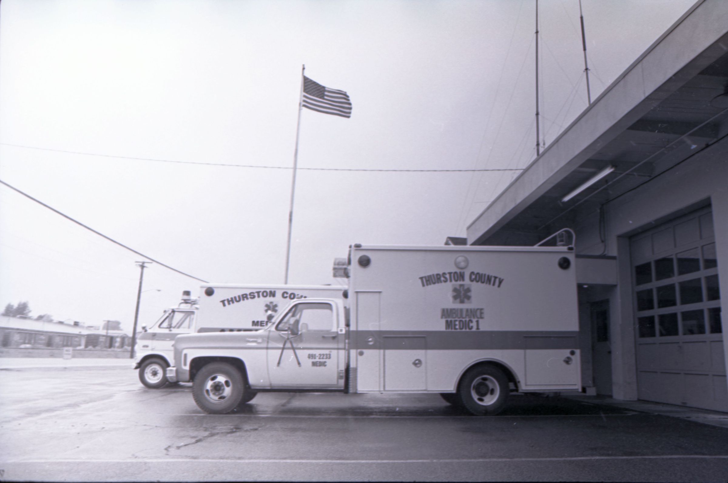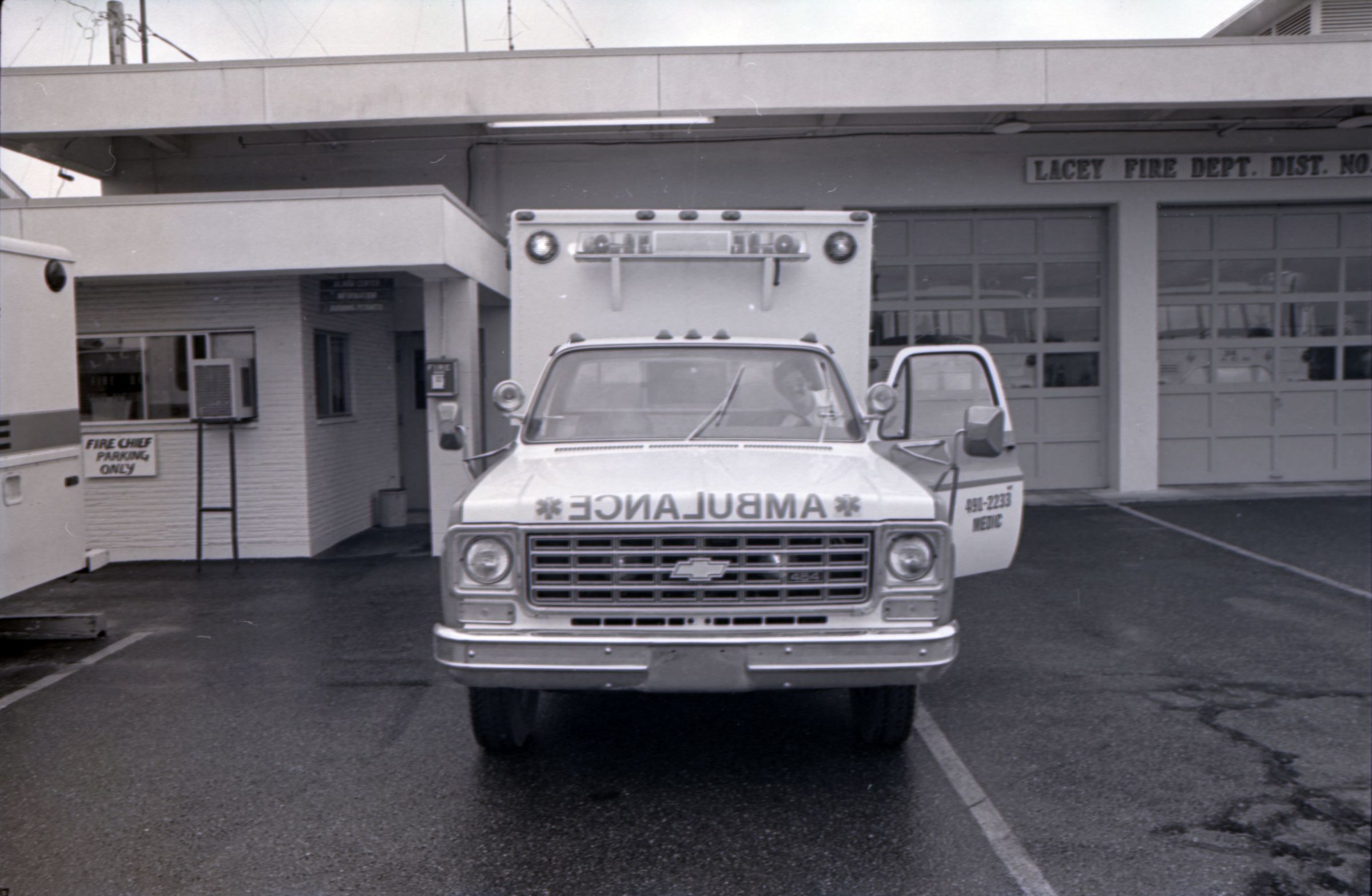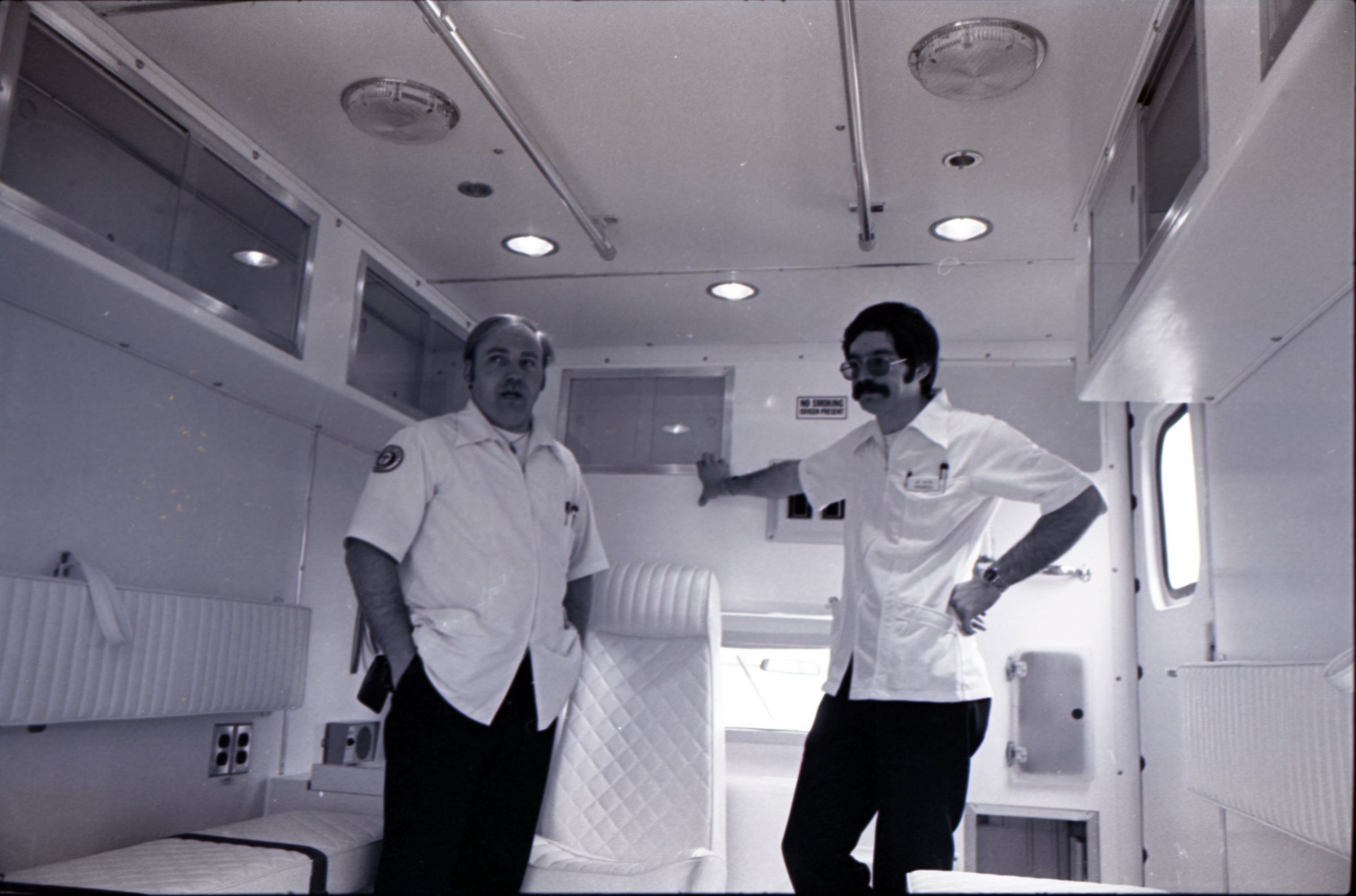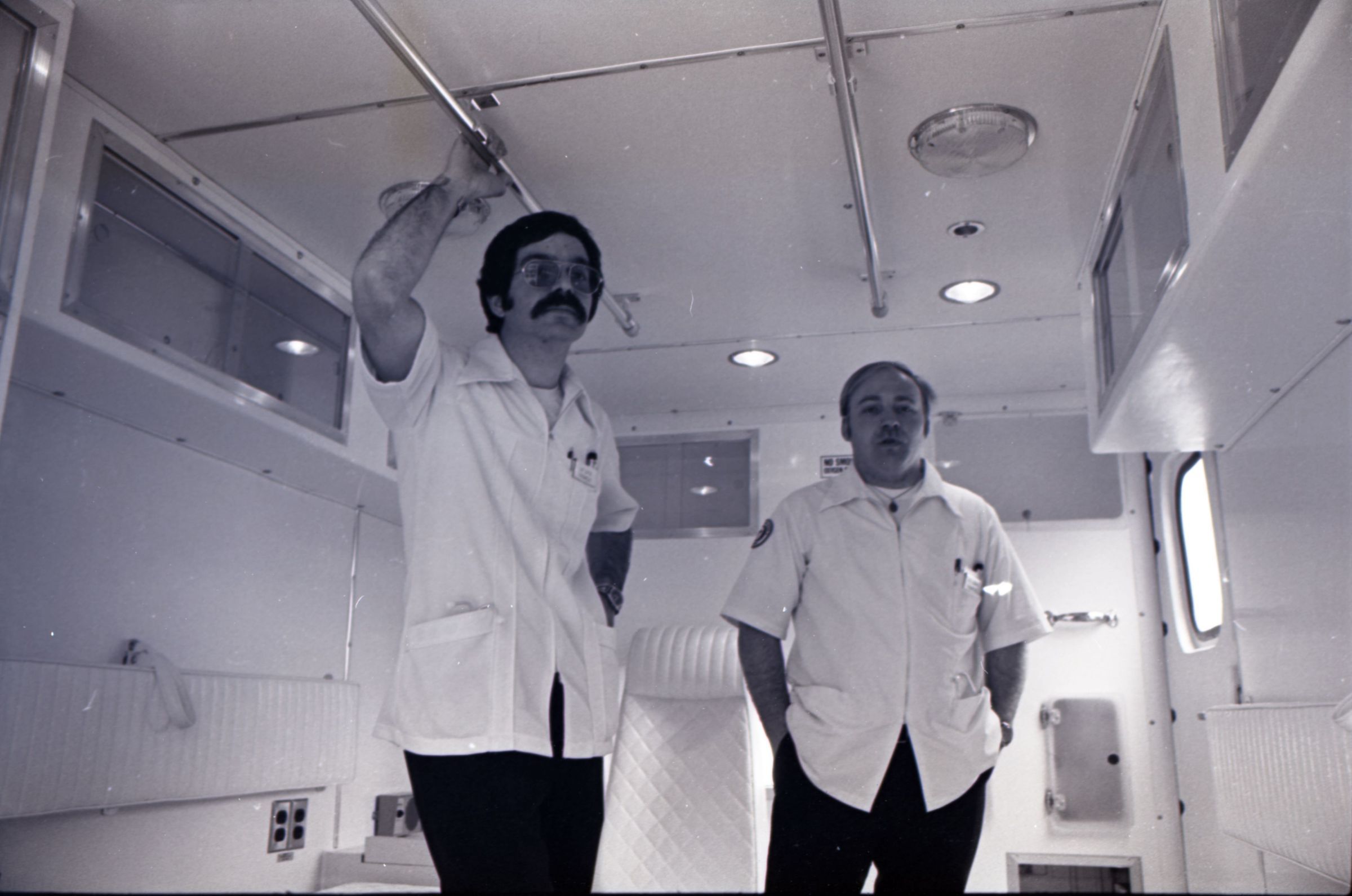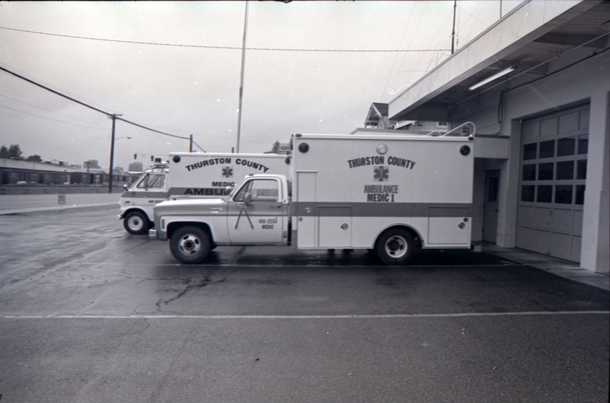Medic One, 1976. These two black and white film negative strips were created for the Lacey Leader newspaper. These images show a parked ambulance and two men standing in the back of the ambulance.Made/Created