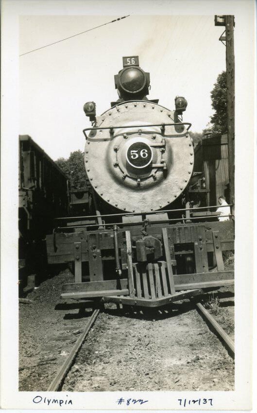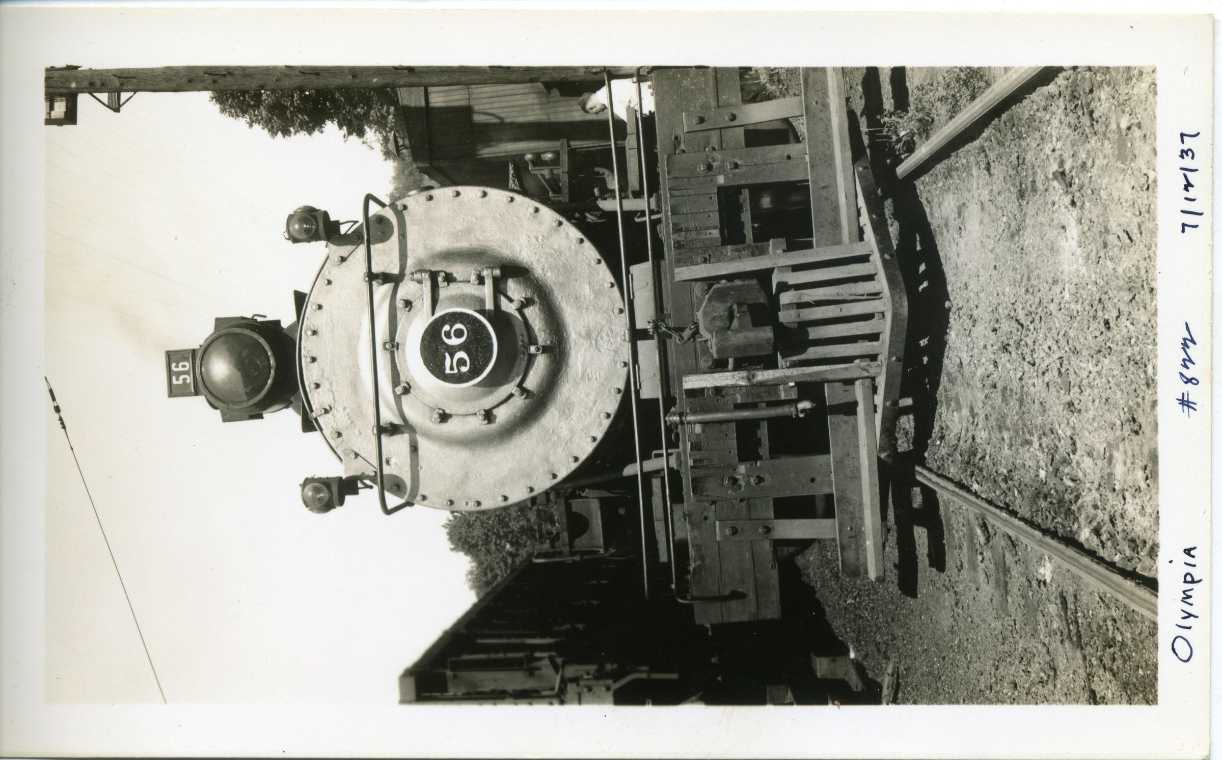 Black and white photo of a locomotive. A railroad track is in the foreground and a head-end view of the locomotive is in the center. Beginning at the bottom, there is a cow catcher in front of the frame and coupling levers. Above the cow catcher is a coupler. The round boiler has rivets around the outside and clamps in the center to close the pipe door. In that center portion is the number "56". There is a pipe bracket holding two marker lights, and at the top is a head light. Part of a freight car is visible on one side, and a telephone pole and wire is visible on the other. Trees are in the background. There is a white border on all sides, and in the bottom border is "Olympia #822 7/12/37". On the back is a seal-shaped stamp whose words are not readable. Below that is a date stamp "Jul 12 1937". Also stamped is "D 23".