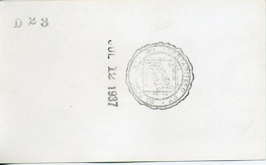 The photo is inserted, along with a negative of the image, into a cream colored envelope that has typed "Olympia 7/12/37 Front view - No. 56". Stamped is "822" and "indexed".Made/Created