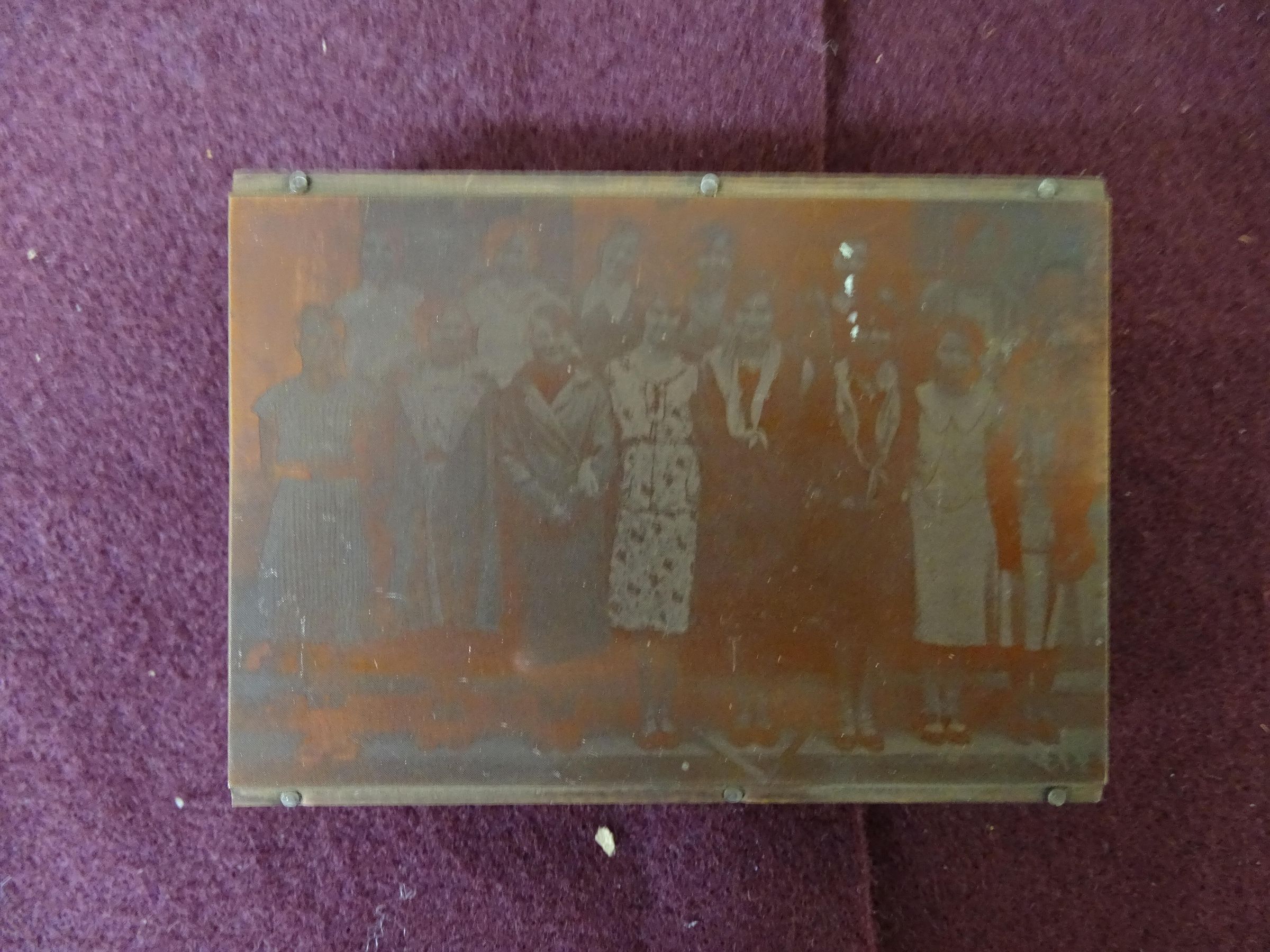 Wood and metal (copper) printer's plate used to transfer an image to paper. The copper plate has been engraved with an image and is intended for use in an offset printing press. The plate is attached to a wooden block with small nails so as to fit in the printing tray of the press.