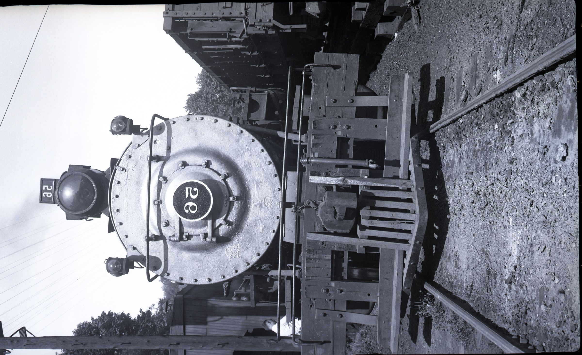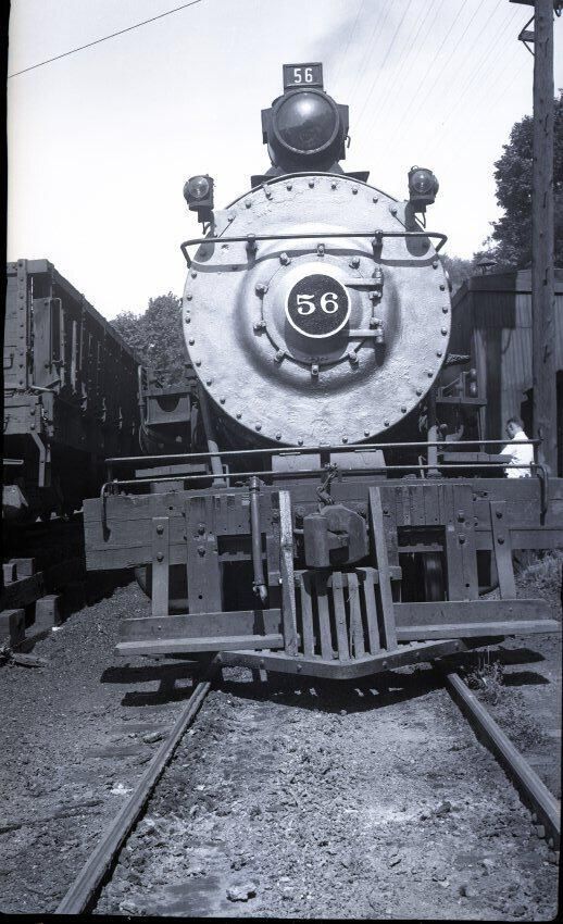 Black and white negative of a locomotive. A railroad track is in the foreground and a head-end view of the locomotive is in the center. Beginning at the bottom, there is a cow catcher in front of the frame and coupling levers. Above the cow catcher is a coupler. The round boiler has rivets around the outside and clamps in the center to close the pipe door. In that center portion is the number "56". There is a pipe bracket holding two marker lights, and at the top is a head light. Part of a freight car is visible on one side, and a telephone pole and wire is visible on the other. Trees are in the background. There is a white border on all sides, and in the bottom border is "Olympia #822 7/12/37".