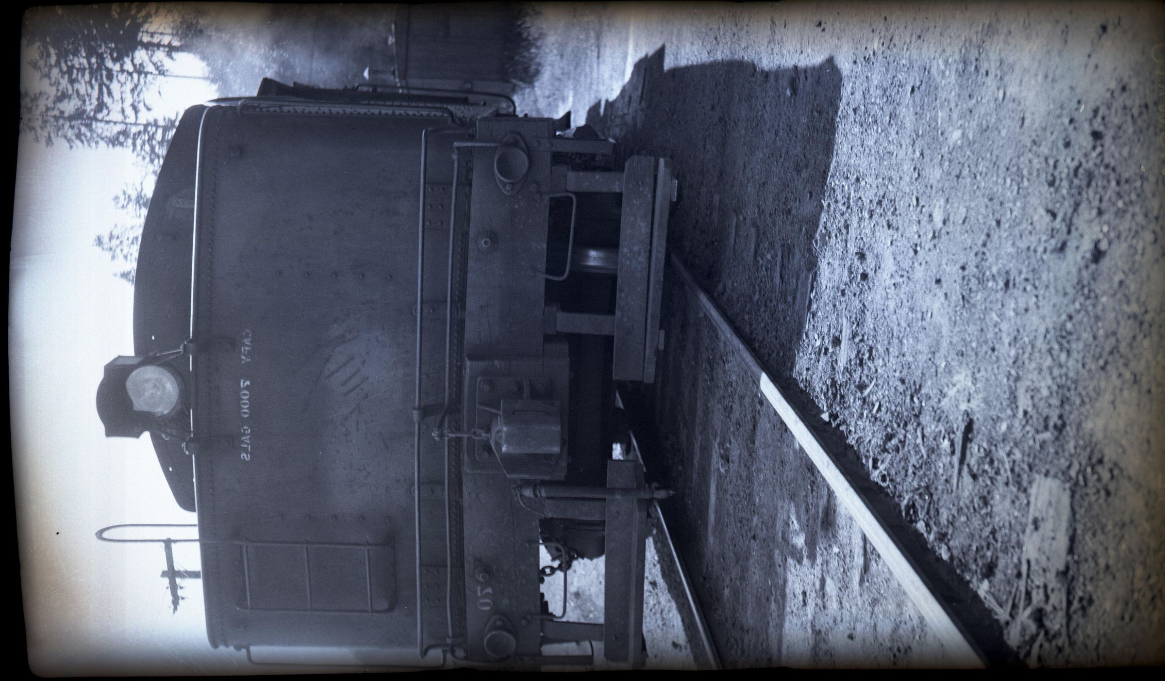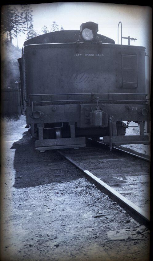 Black and white negative of a locomotive. From the right side to the center is a railroad track and in the center is the locomotive tender with the locomotive cab partially visible above it. At the bottom of the tender are standing boards, a coupler, and coupling levers. There are grab irons and a brake wheel on the right side of the tender body. Painted on the back of the tender is "capy 7000 gals". At the top of the tender body is a rear-facing head light. bits of trees are visible on the left side. There is a white border on all sides, and in the bottom border is "Olympia #823 7/12/37".