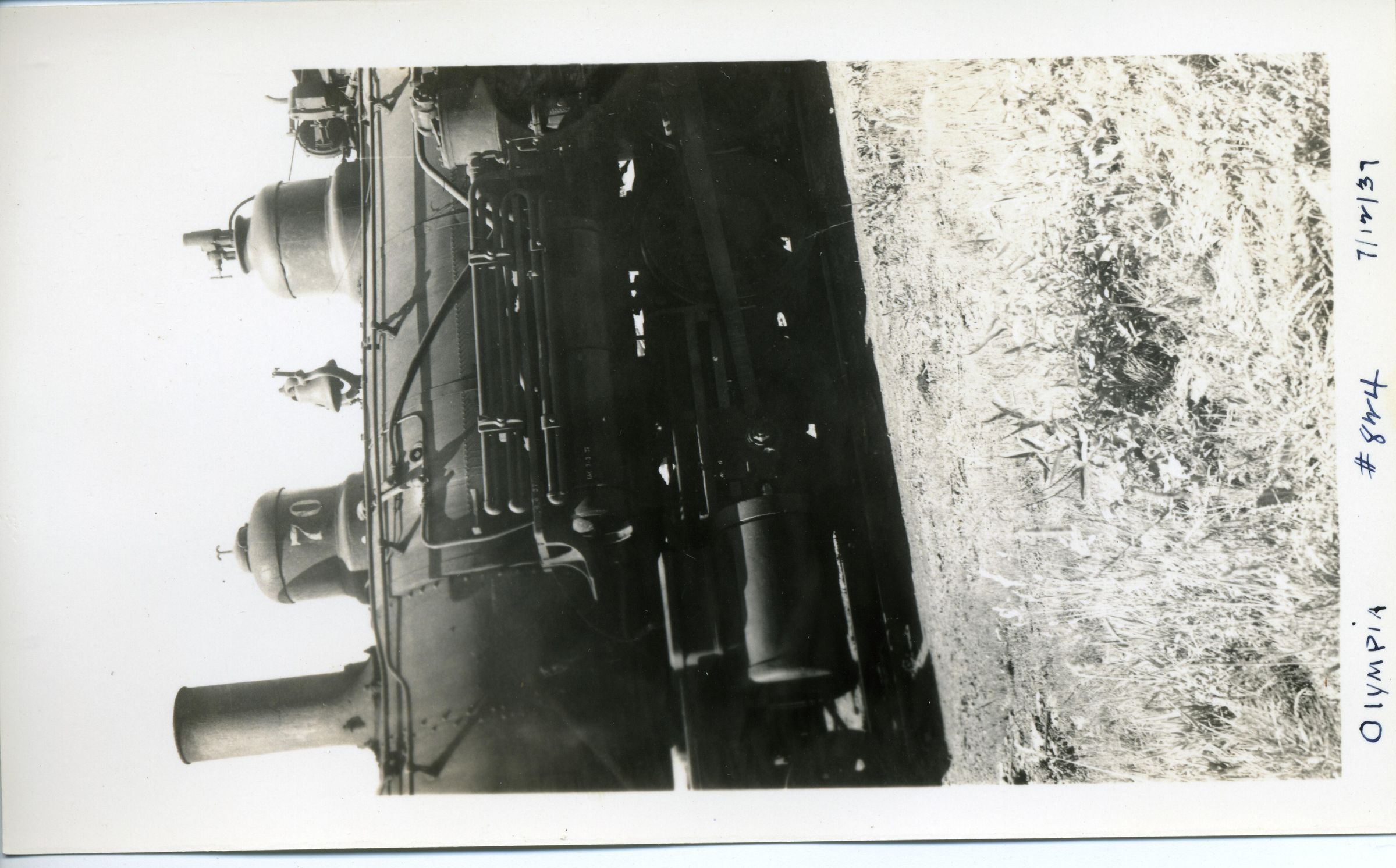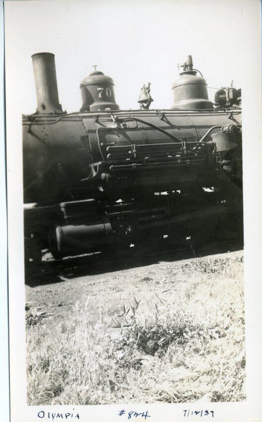 Black and white photo of the side of a locomotive. There is grass in the foreground and in the center is the side of the locomotive. At the top is a smoke stack, two domes, a bell, and another object. On the side of the boiler is piping, part of the compressor, and the cylinder and rods. On one of the domes is the number "70". There is a white border on all sides, and in the bottom border is "Olympia #824 7/12/37". On the back is a seal-shaped stamp with words that are unreadable. Below that is part of a date "L 12 1937". Also stamped is "D 23".