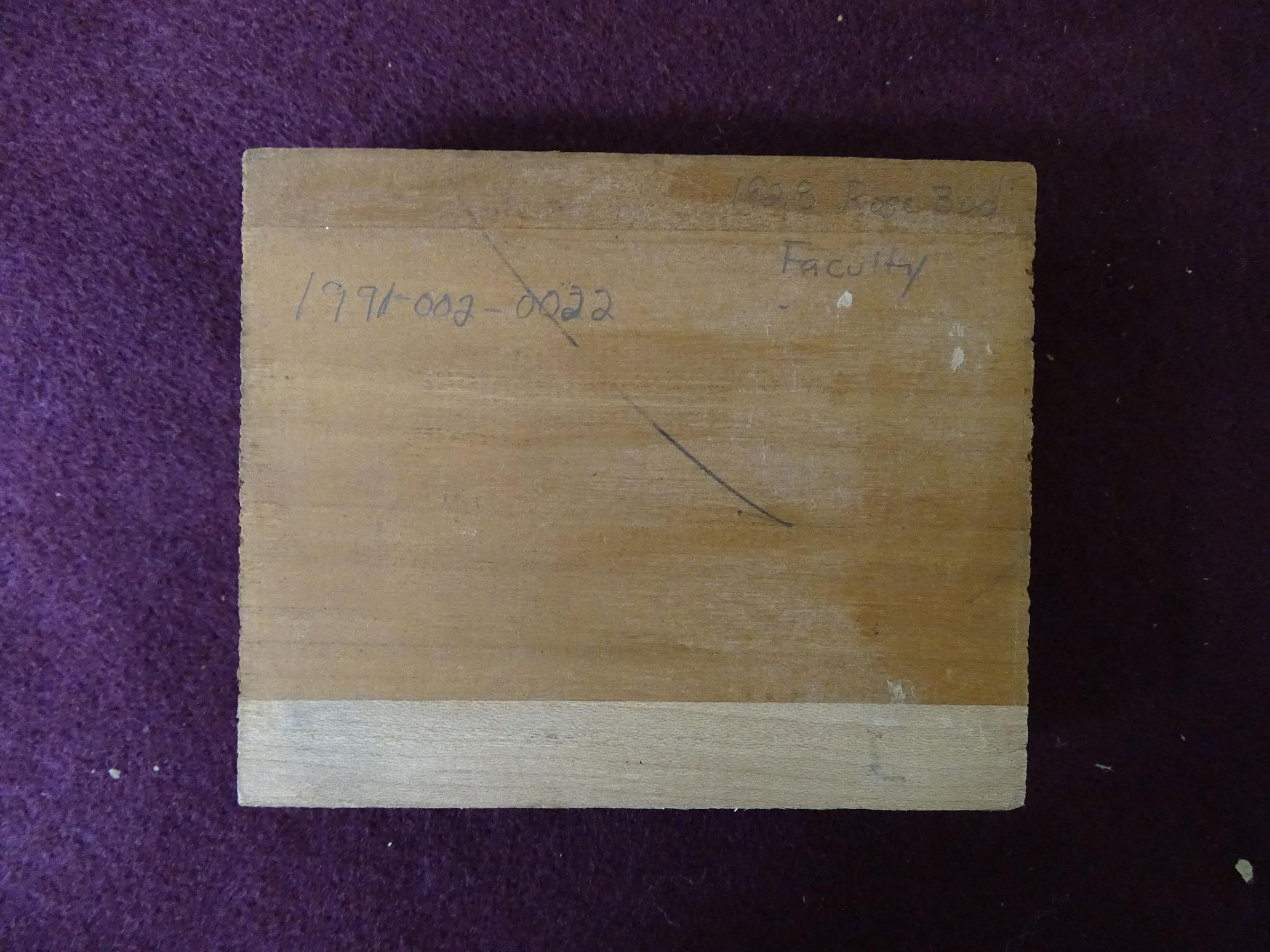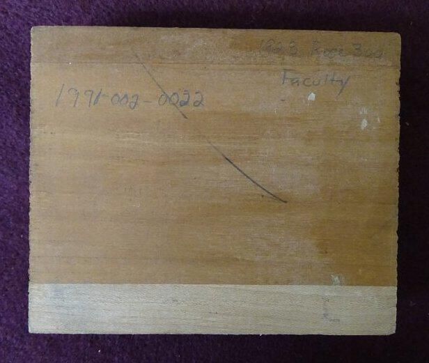 Wood and metal (copper) printer's plate used to transfer an image to paper. The copper plate has been engraved with an image and is intended for use in an offset printing press. The plate is attached to a wooden block with small nails so as to fit in the printing tray of the press.