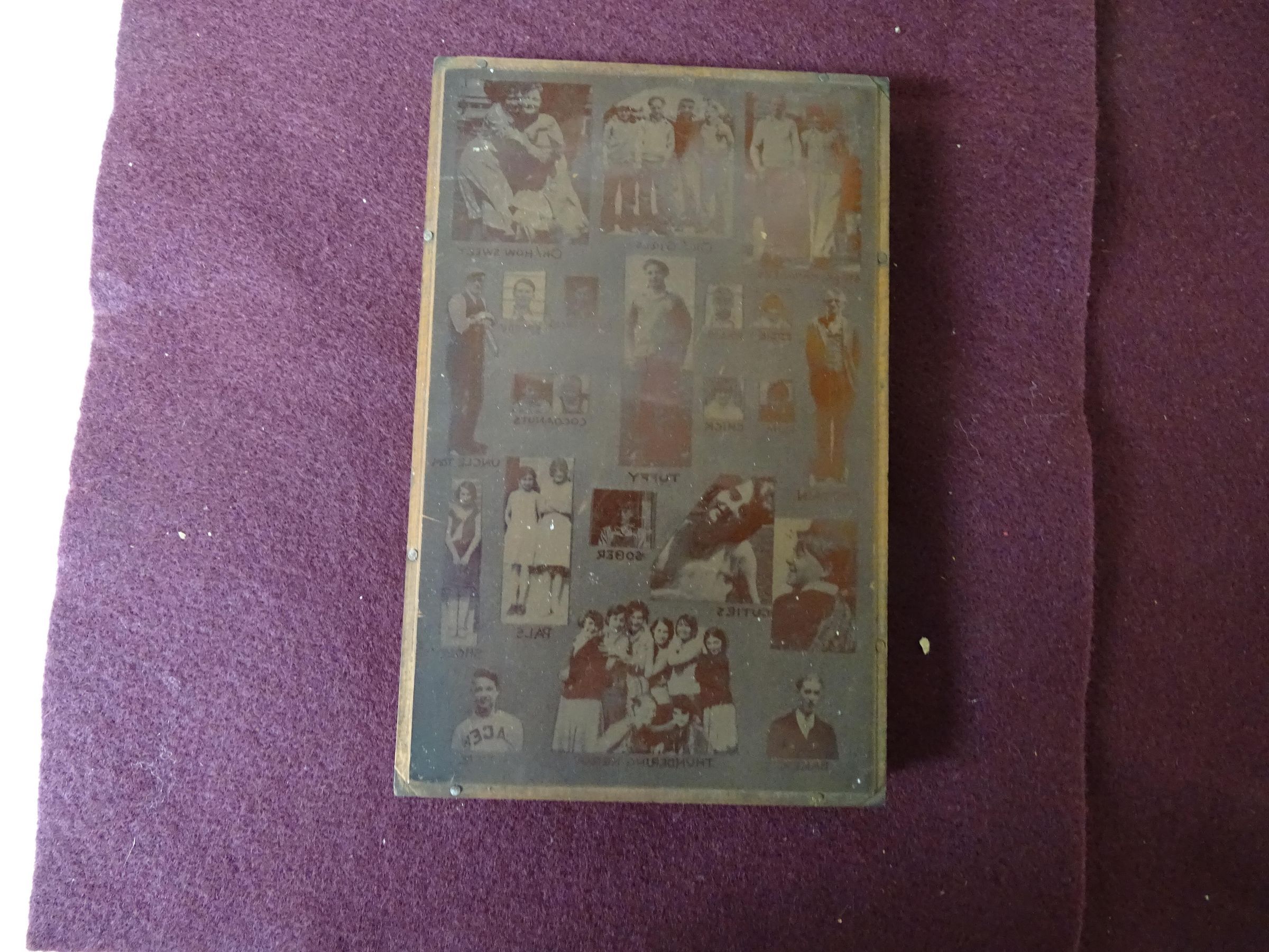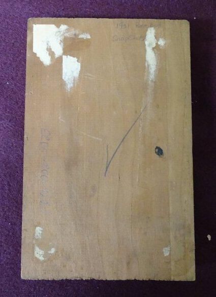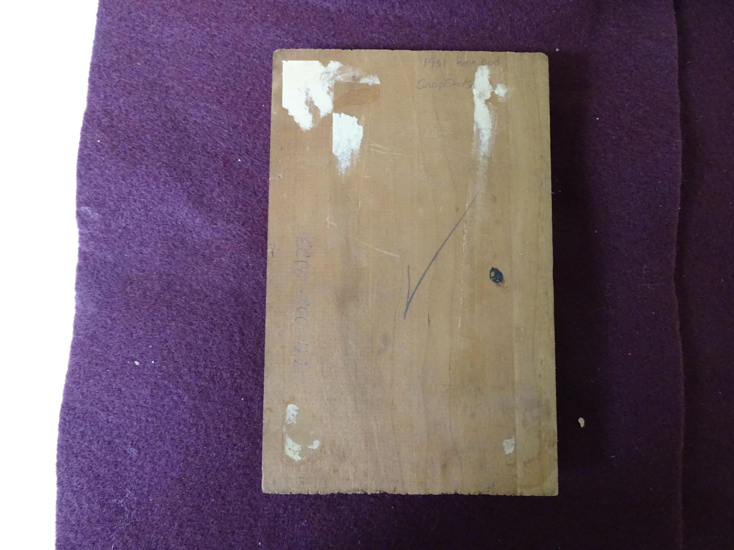 Wood and metal (copper) printer's plate used to transfer an image to paper. The copper plate has been engraved with an image and is intended for use in an offset printing press. The plate is attached to a wooden block with small nails so as to fit in the printing tray of the press.