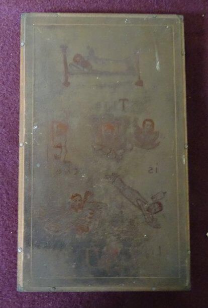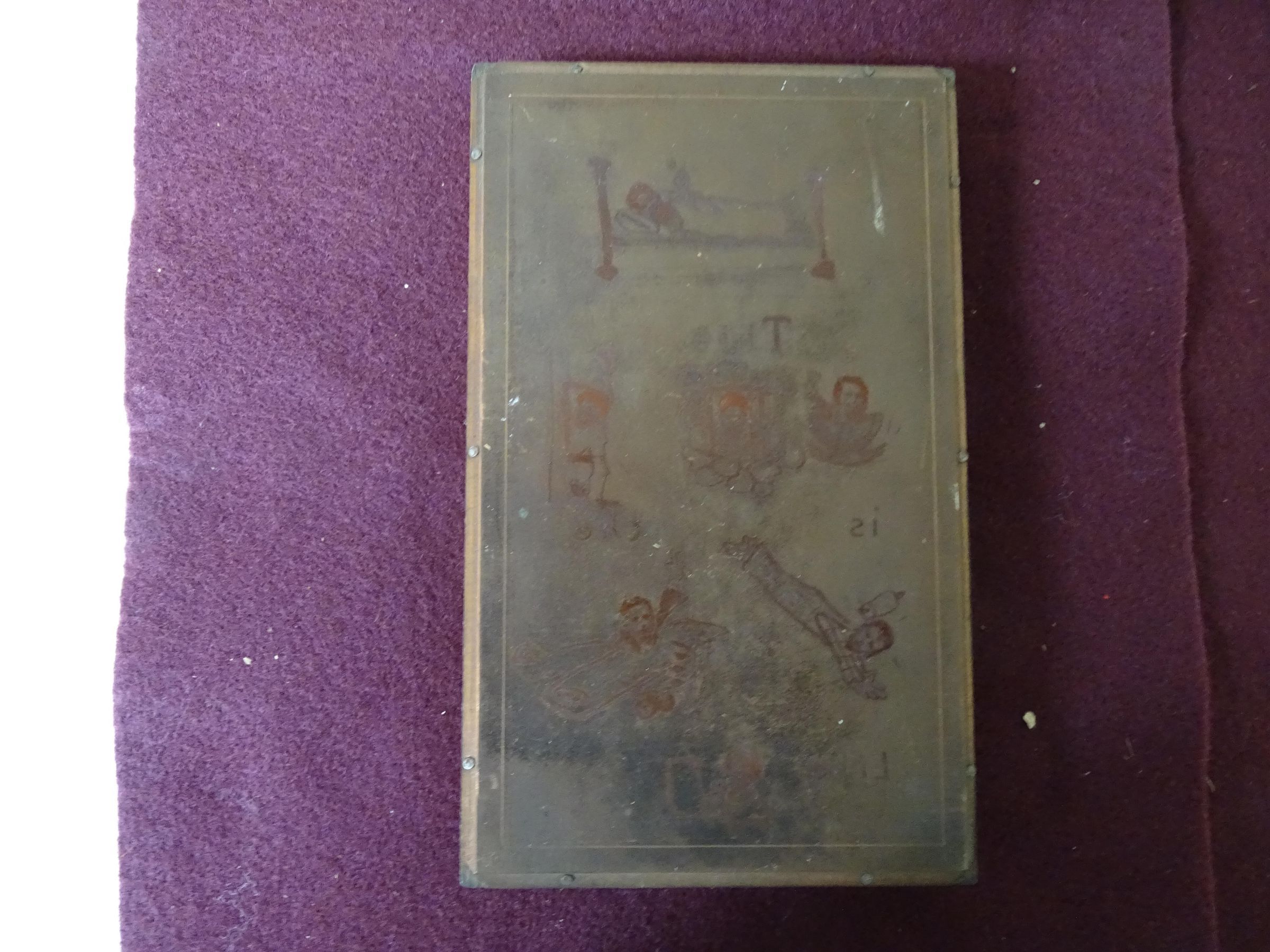 Wood and metal (copper) printer's plate used to transfer an image to paper. The copper plate has been engraved with an image and is intended for use in an offset printing press. The plate is attached to a wooden block with small nails so as to fit in the printing tray of the press.