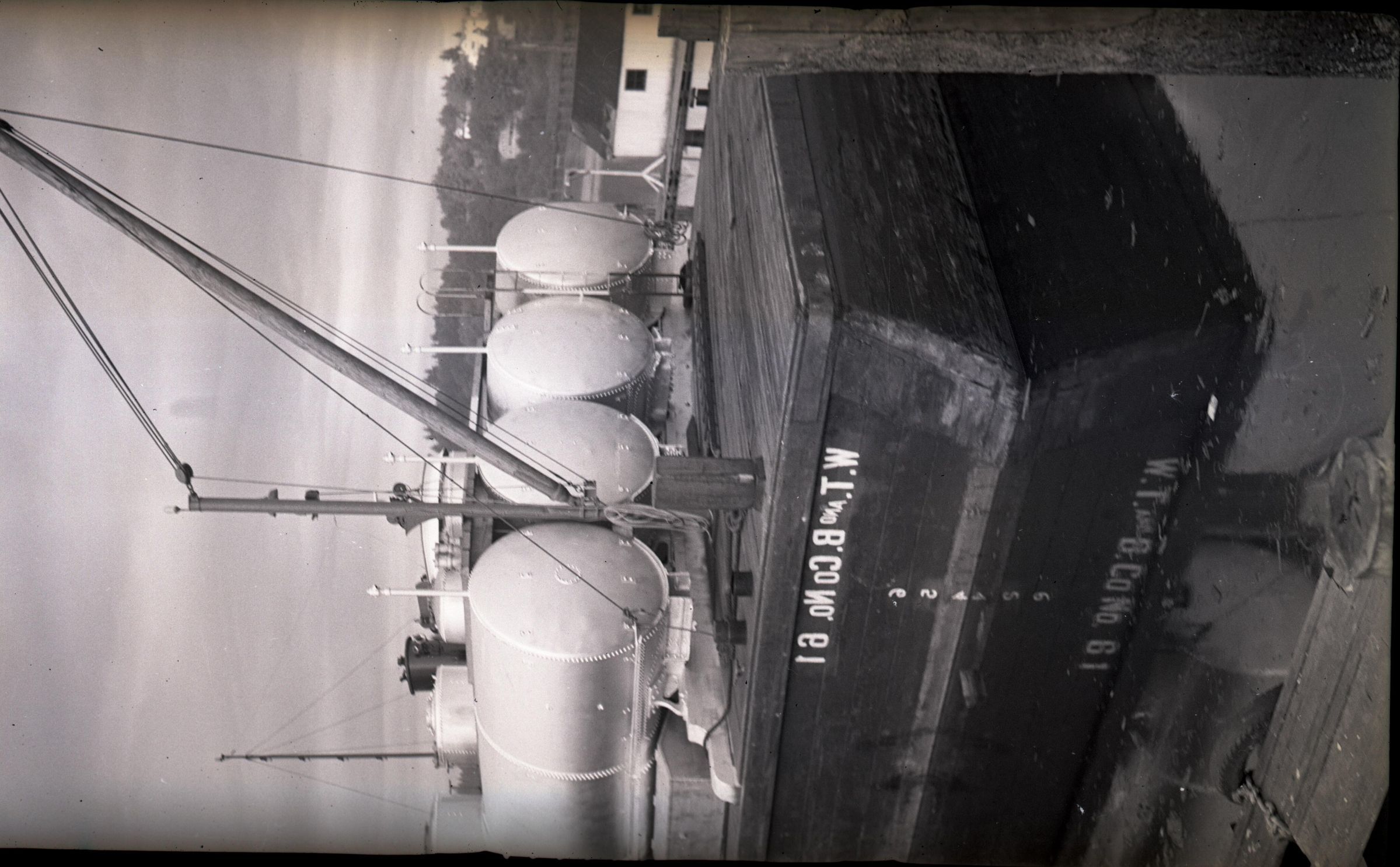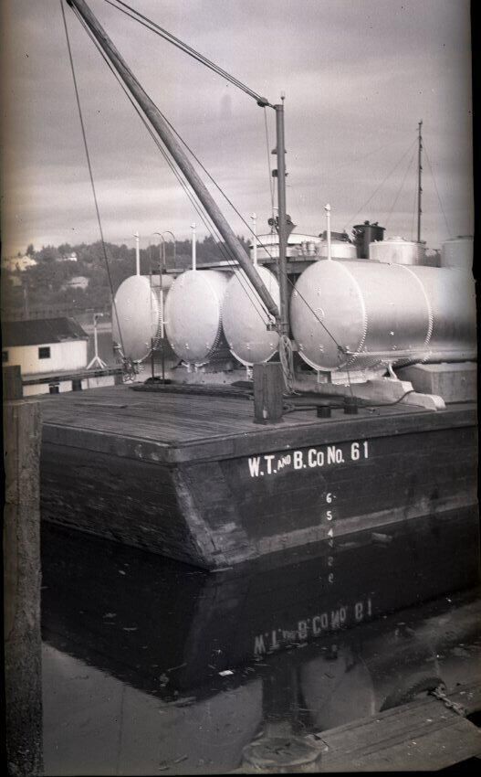 Black and white photo of an oil barge at Percival's Dock. The view of the barge is of one quarter. There is water in the foreground which reflects the barge. The barge has a flat deck on which are white cylindrical tanks and a hoisting boom. On the side of the hull is painted "W.T. and B. Co No. 61". Other ships and the far shore are visible in the background. There is a white border on all sides, and in the bottom border is "Olympia #1115 7/31/39".
