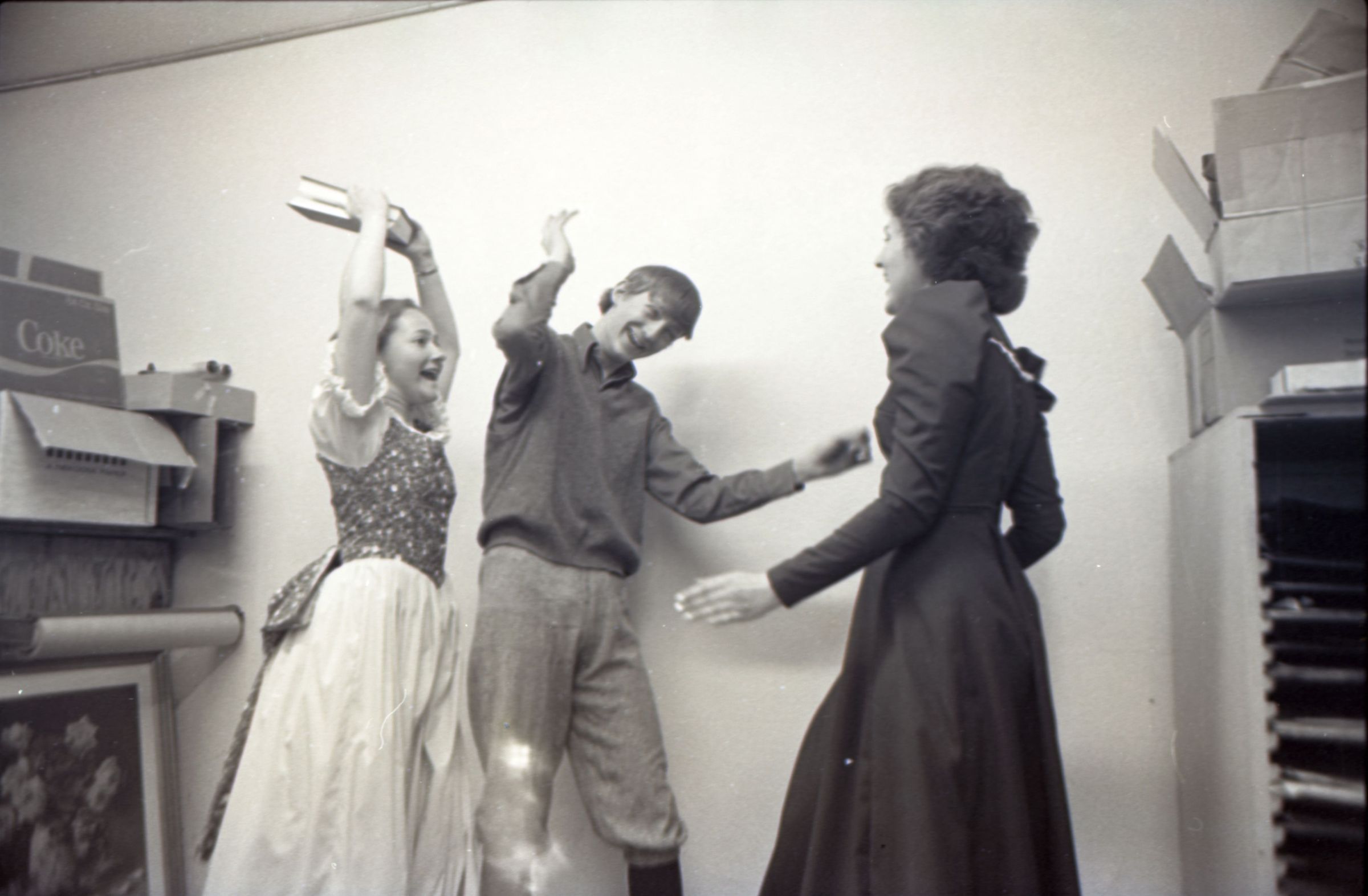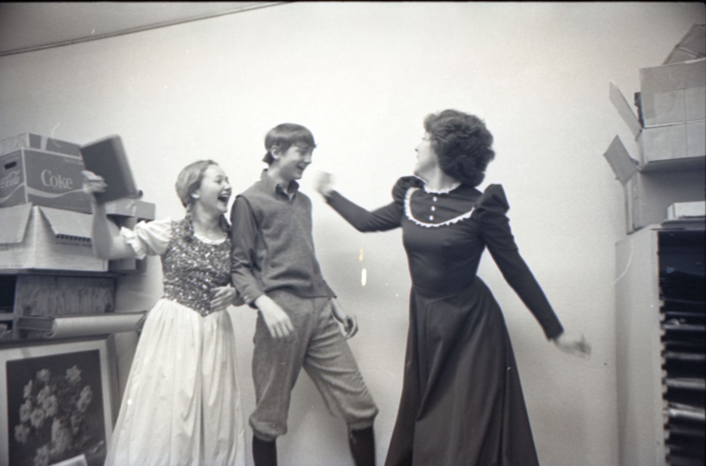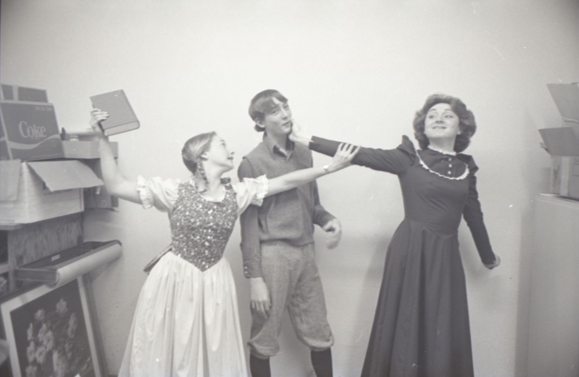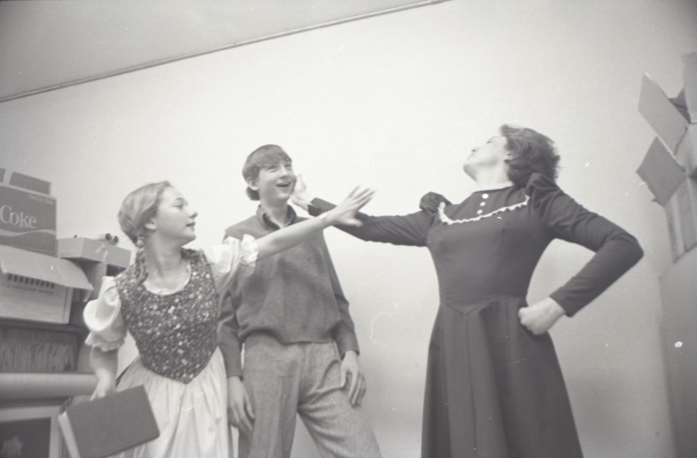 Play Rehearsal, 1976. This single black and white film negative strip was created for the Lacey Leader newspaper. These images show two young women and one young man rehearsing for a play. There is a pile of boxes and framed art partially visible at the left-hand edge of these images.Made/Created