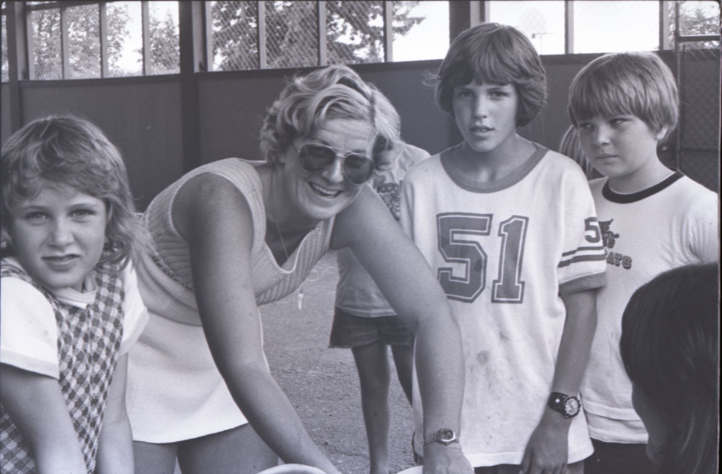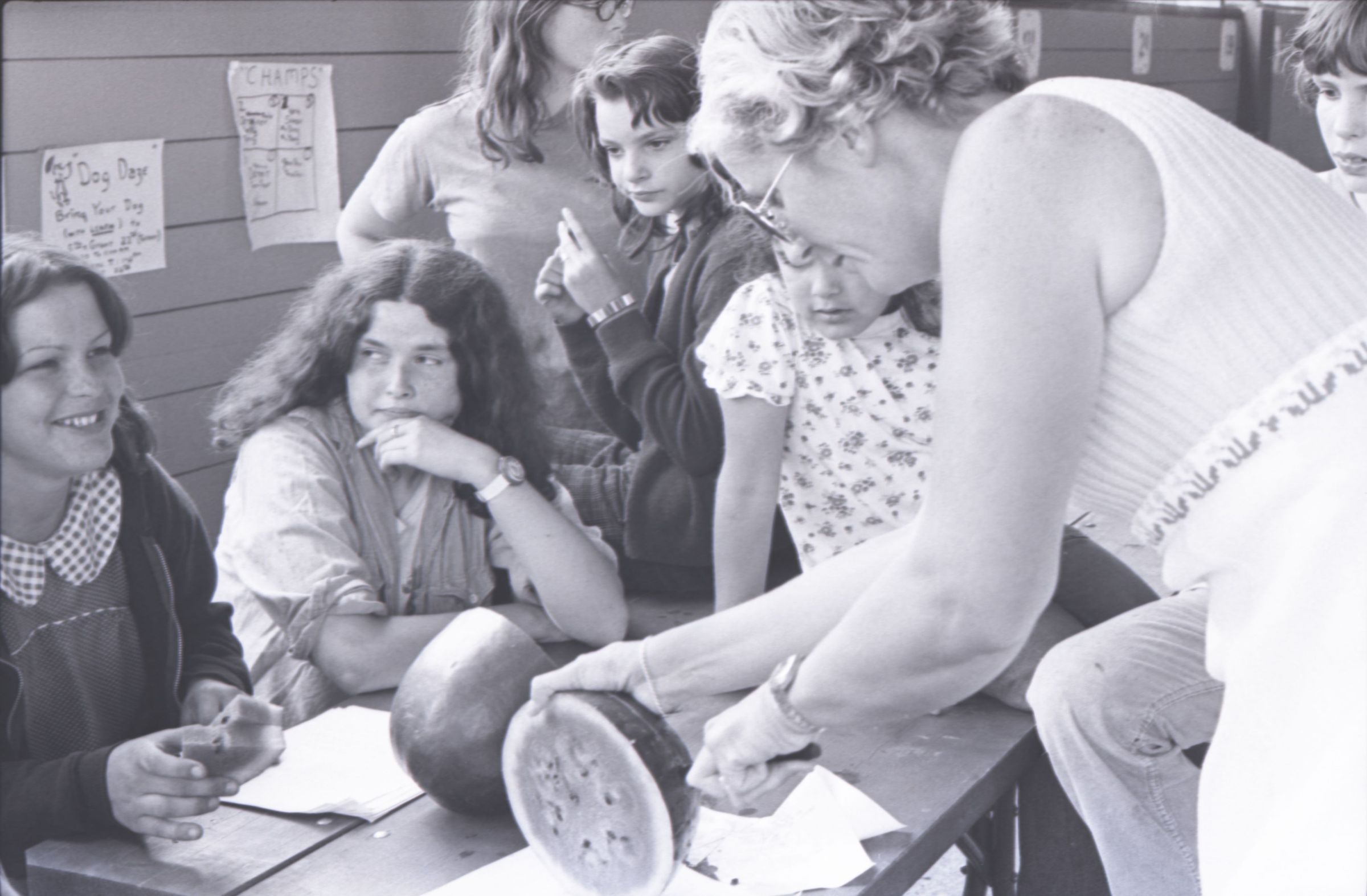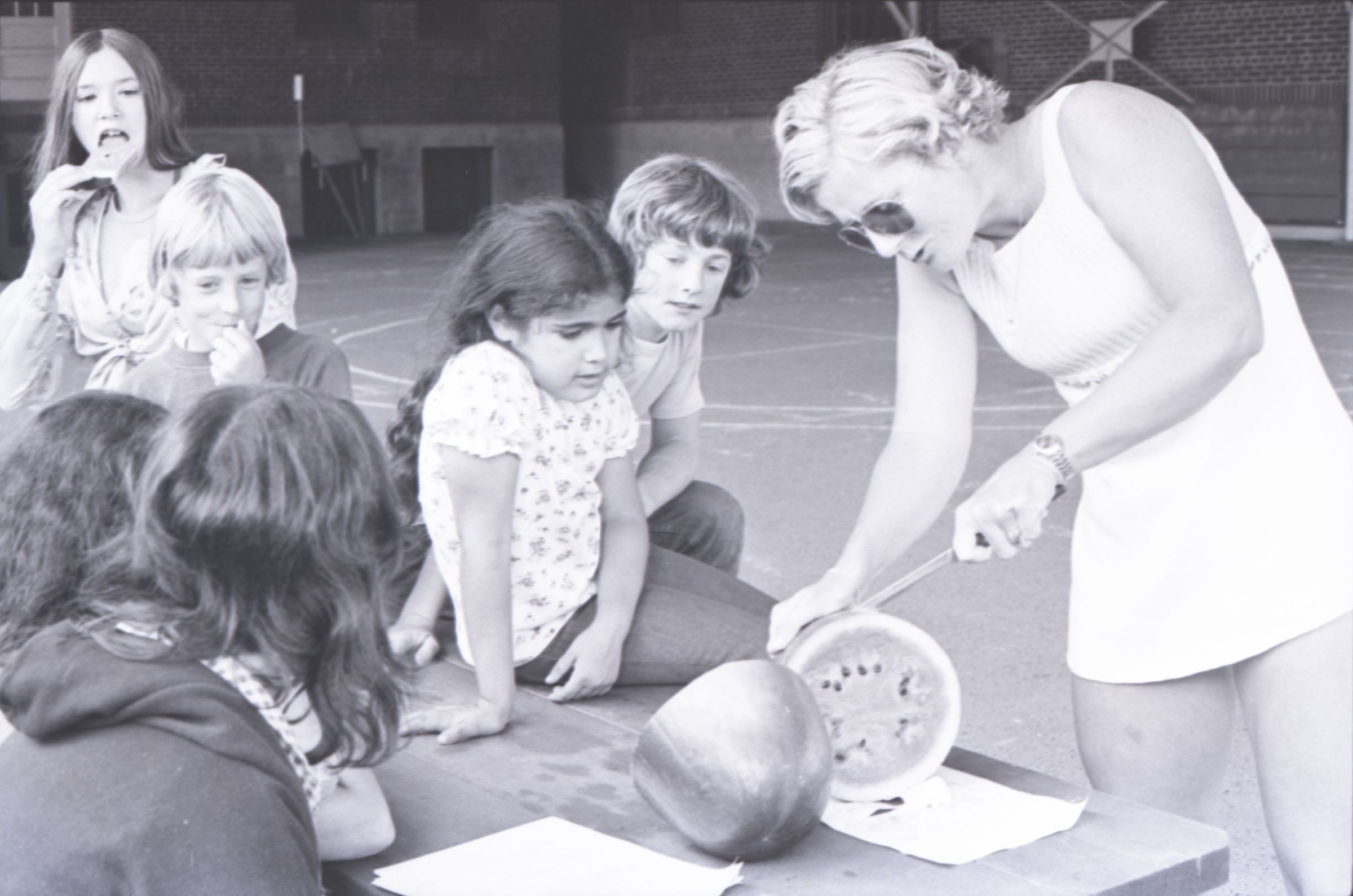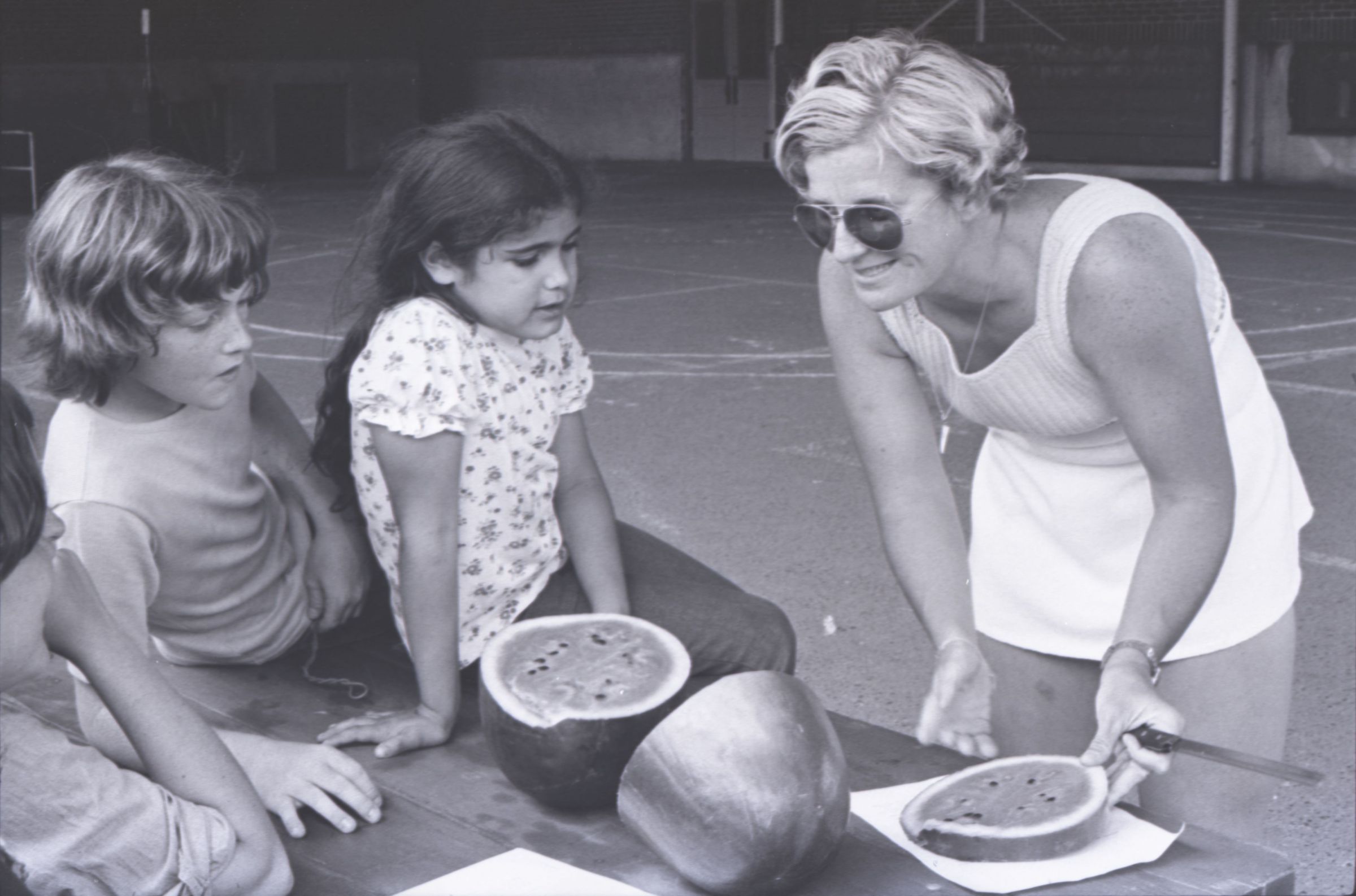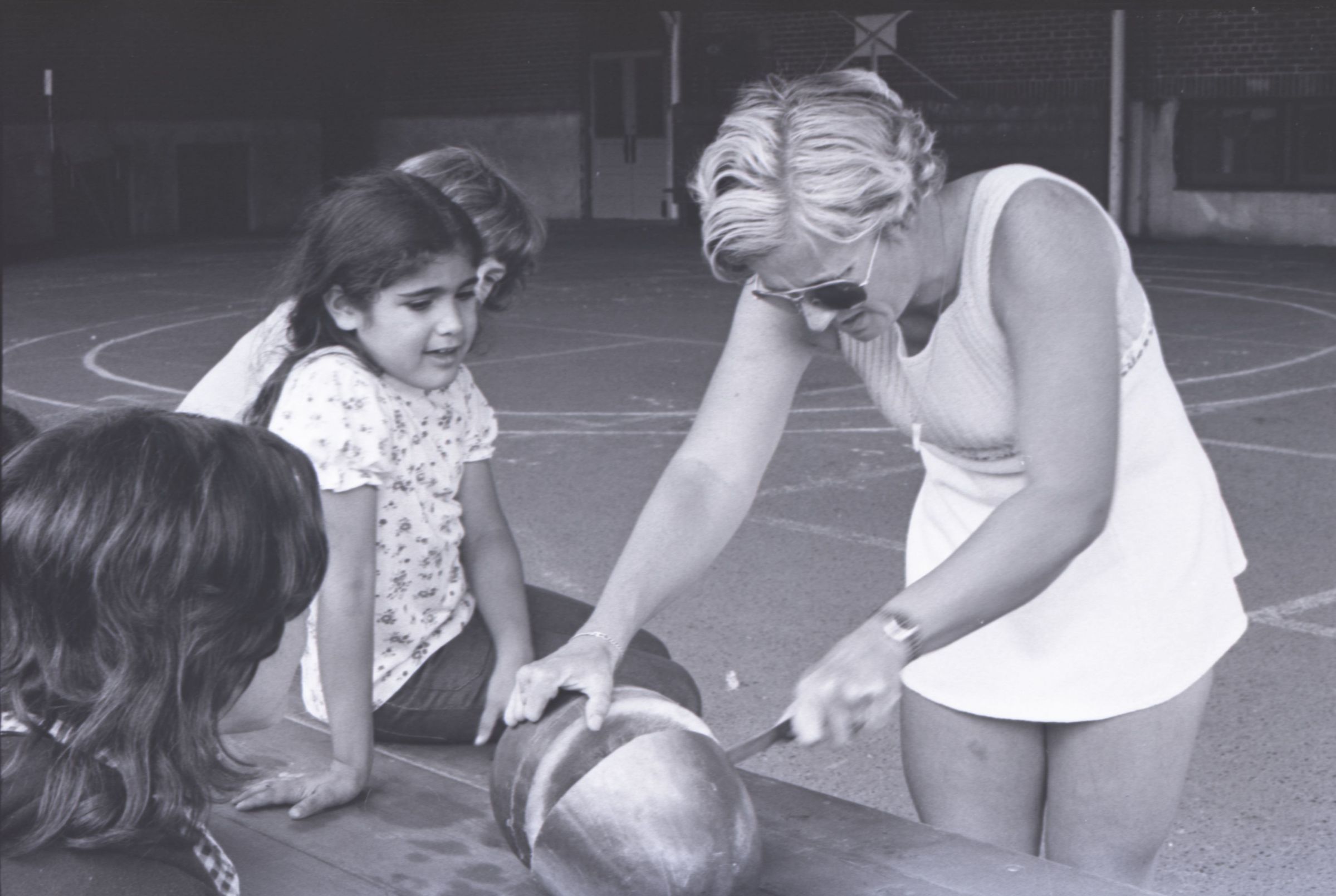 Heather Highmiller, 1975. This single black and white film negative strip was created for the Lacey Leader newspaper. These images show a woman (Heather Highmiller) cutting a watermelon on a table next to an indoor basketball court. A handful of children are watching. Ms. Highmiller has medium-length, wavy air and is wearing glasses and a sleeveless sweater with a mid-thigh length skirt.Made/Created