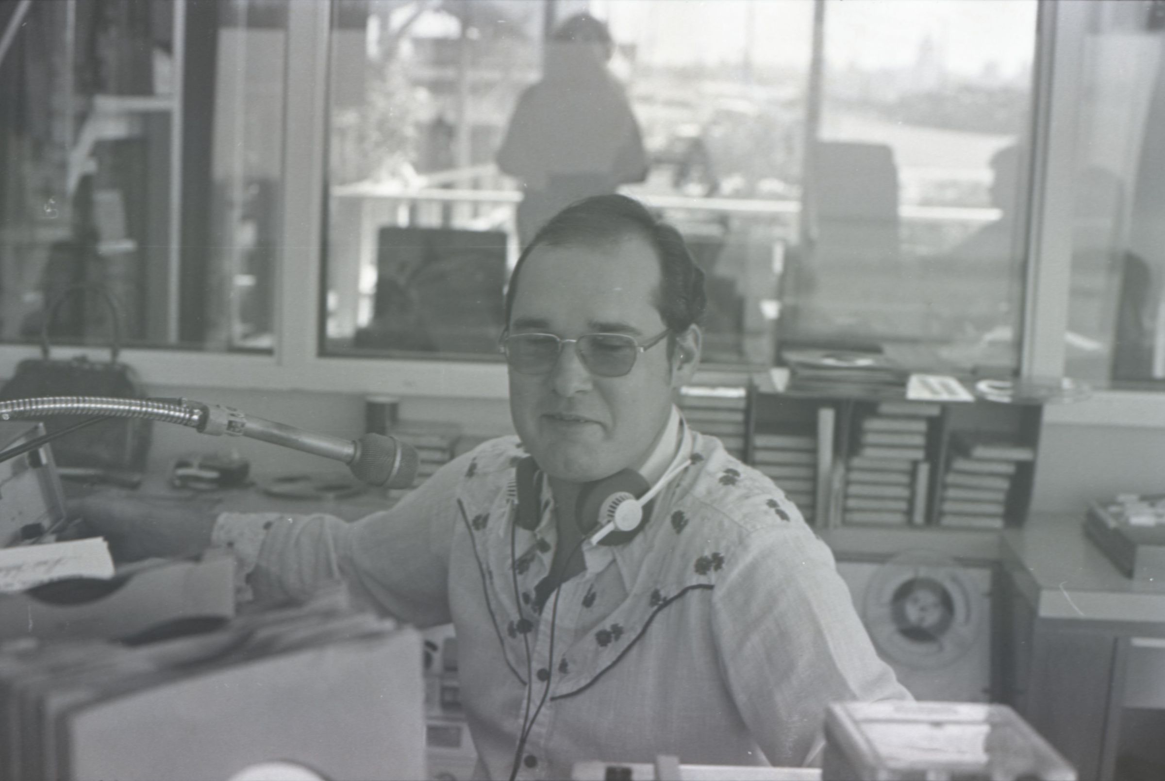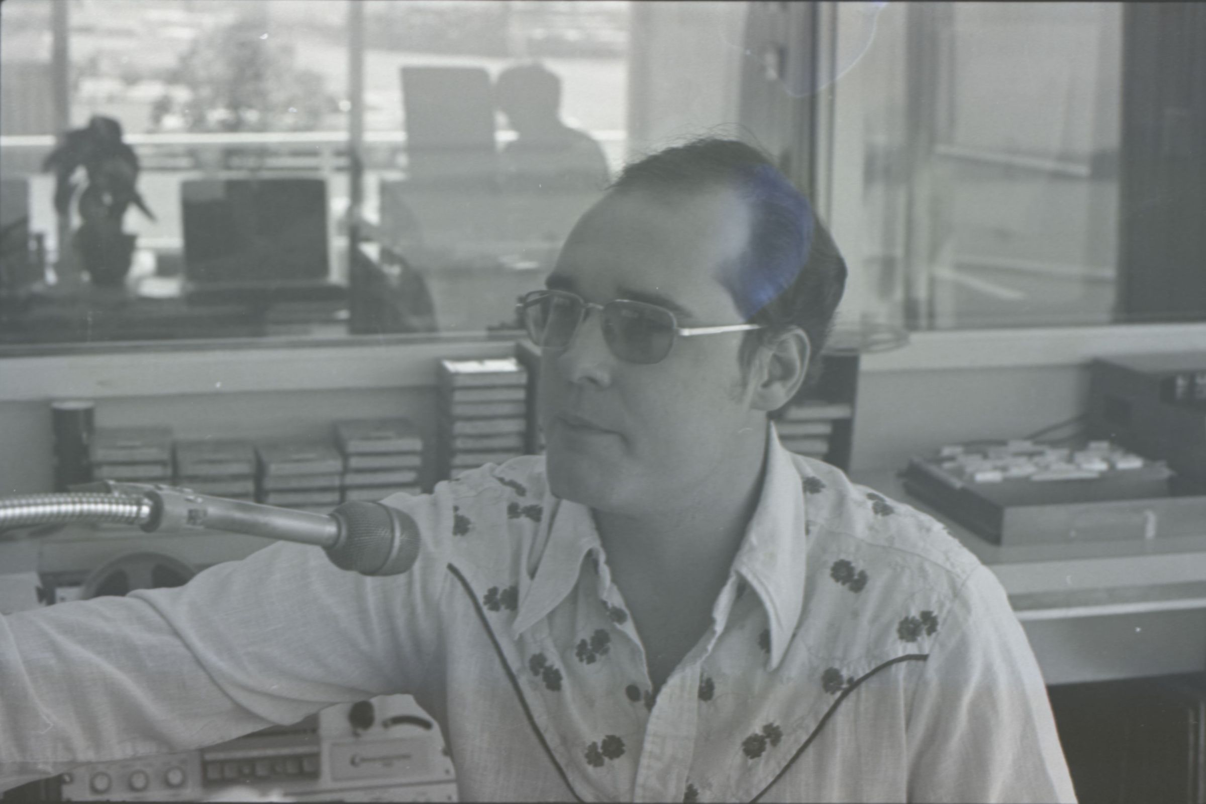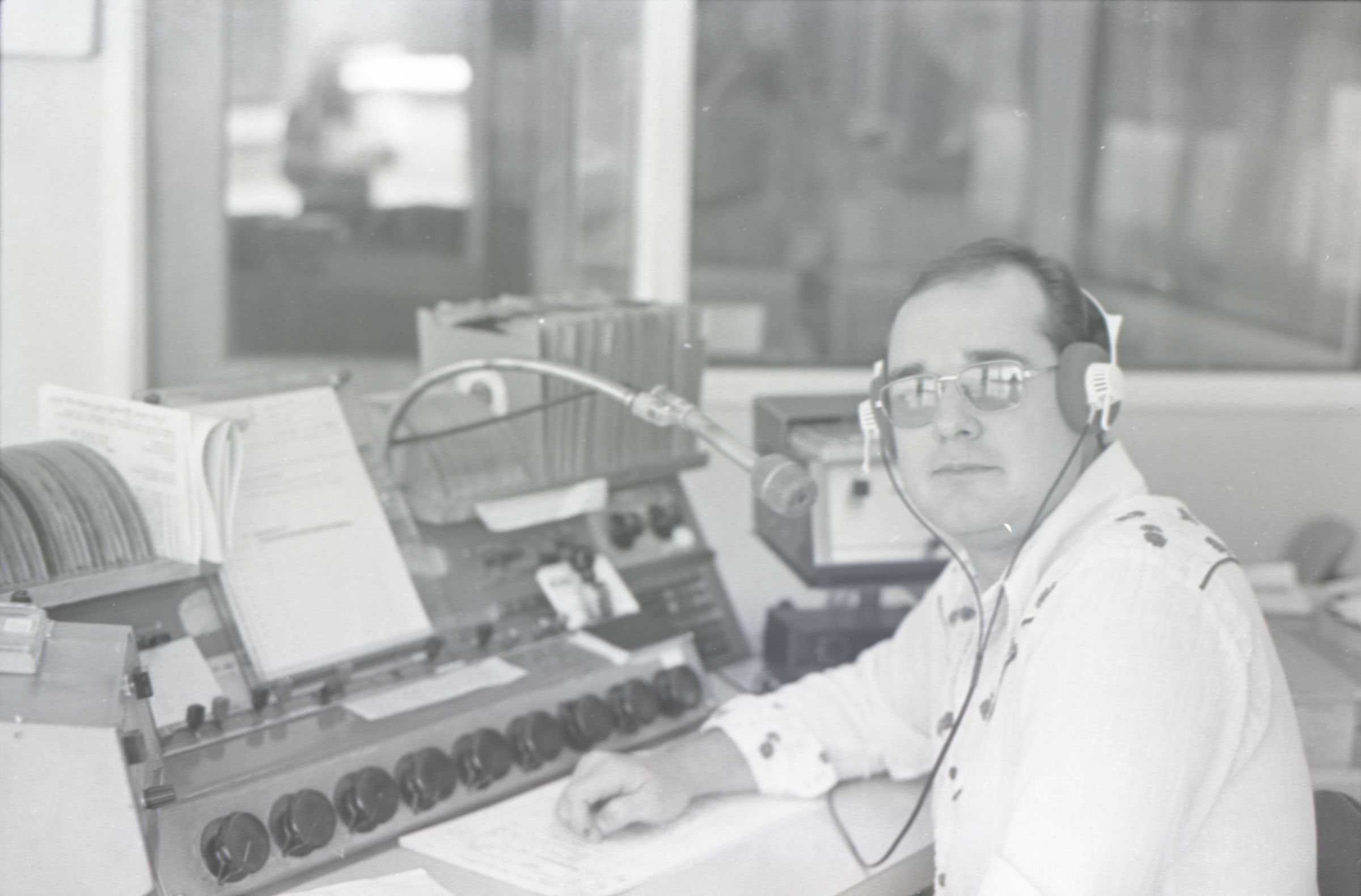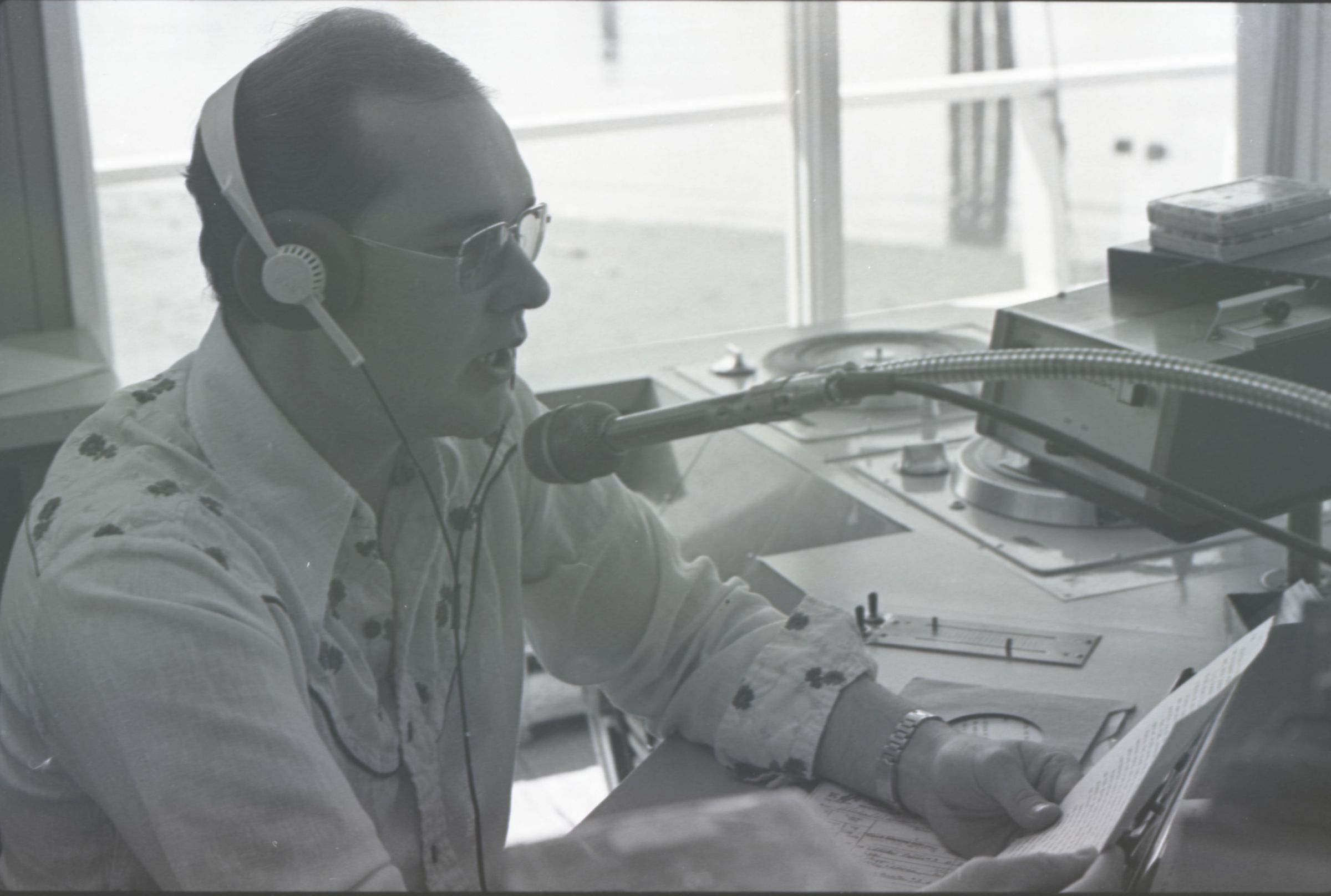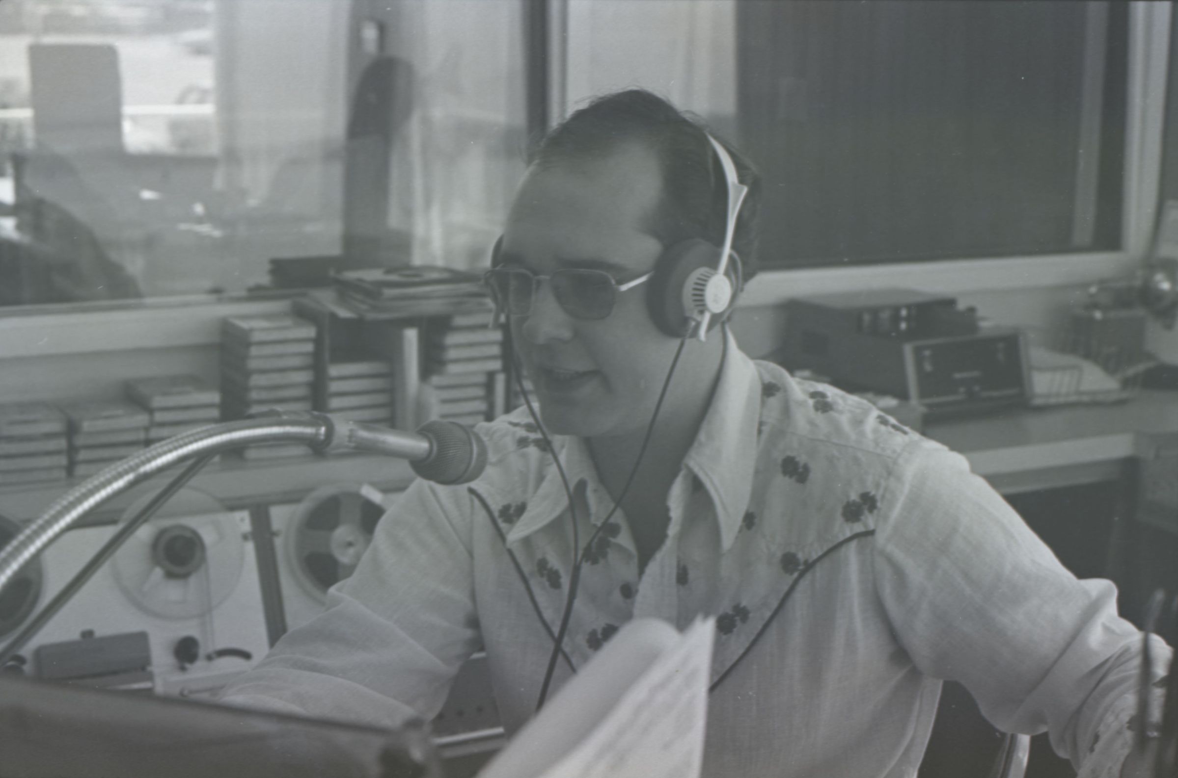 Mike Hudson, 1976. This single black and white film negative strip was created for the Lacey Leader newspaper. These images show a man (Mike Hudson) seated at a disc jockey station in a radio studio.Made/Created