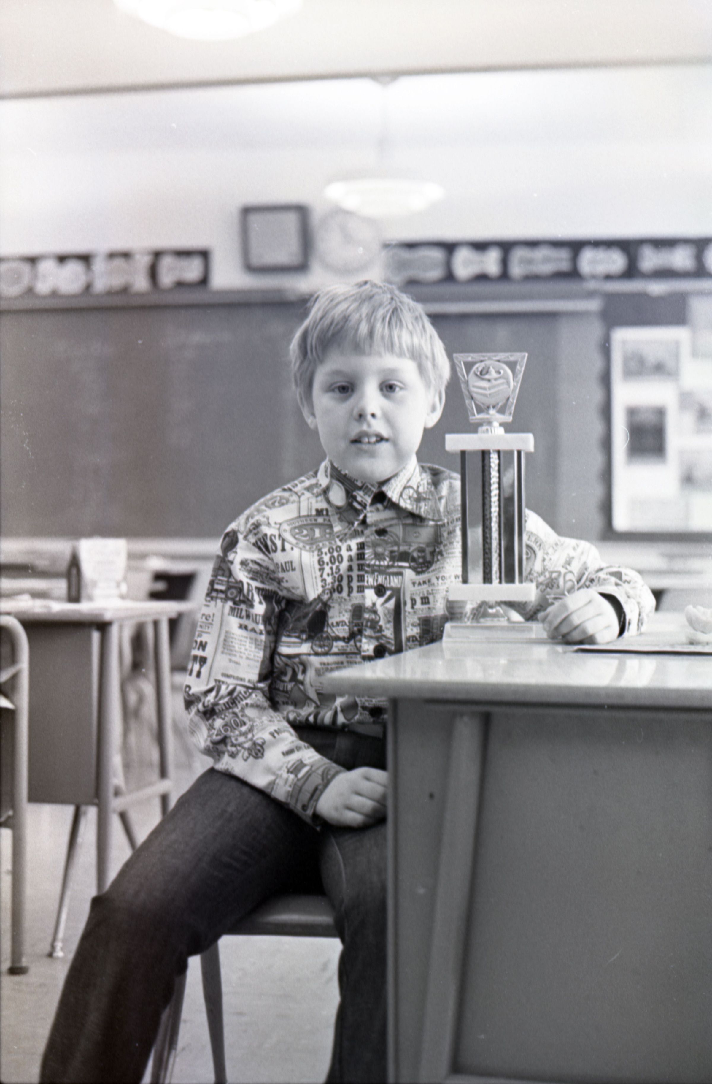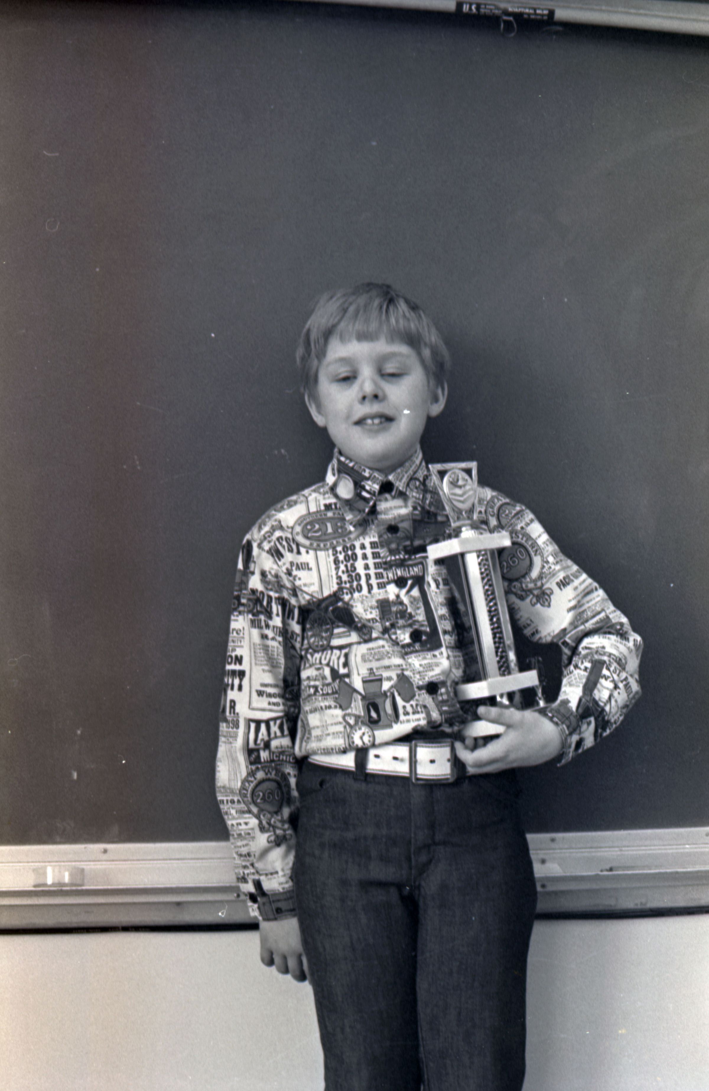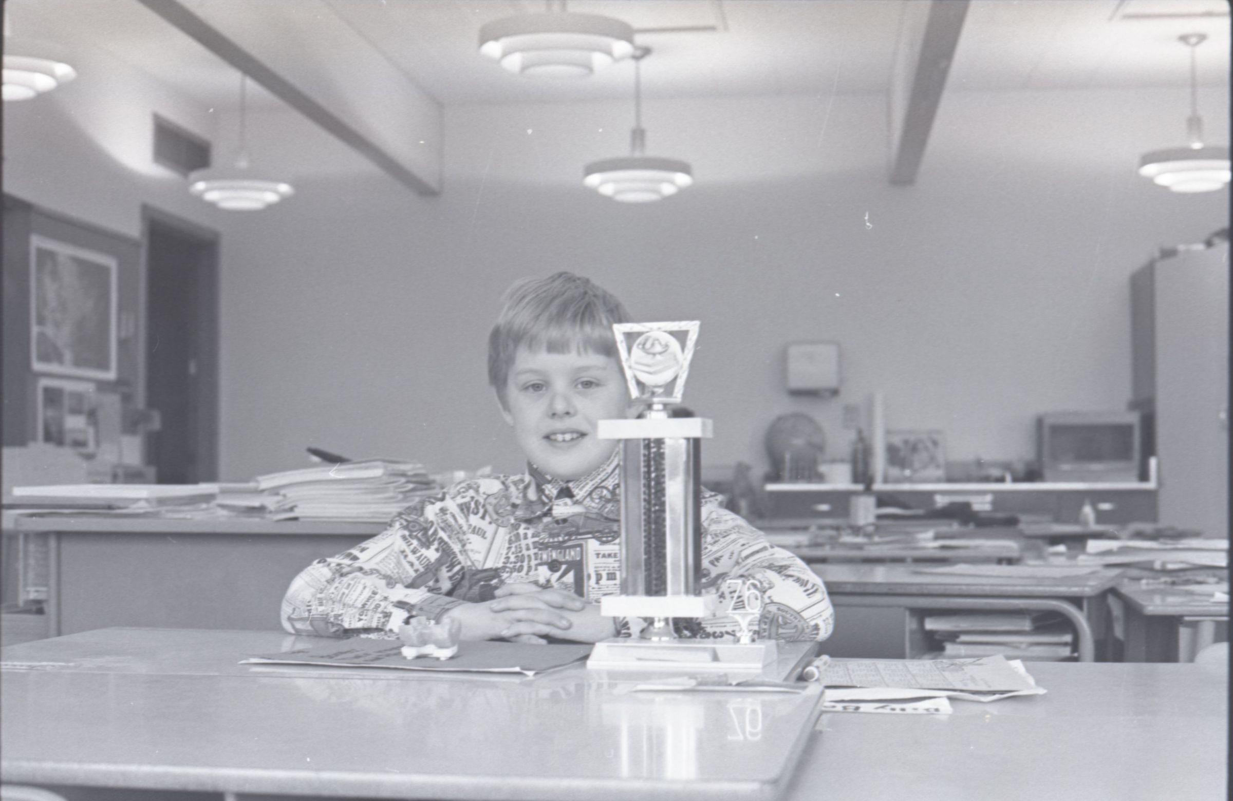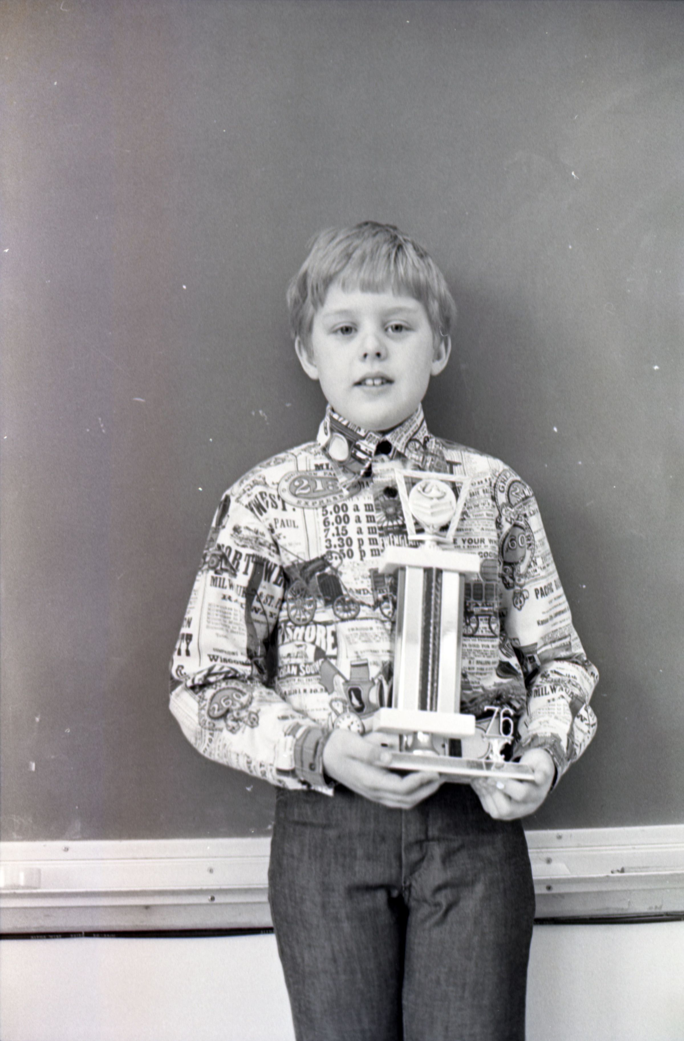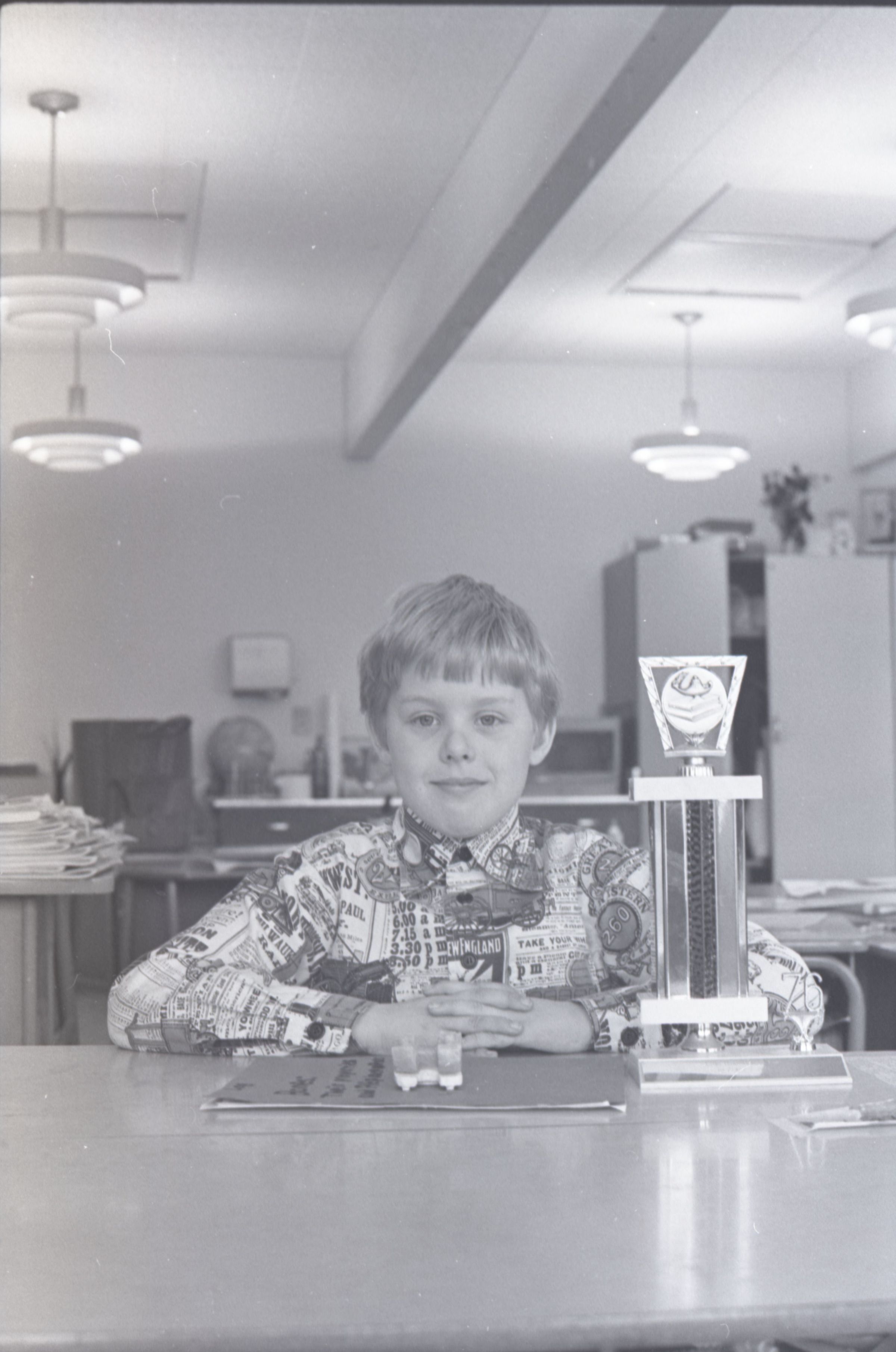 Trophy Winner, 1976. This single black and white film negative strip was created for the Lacey Leader newspaper. These images show a little boy posing for photos with a trophy. The boy is wearing a button-up shirt with a very busy pattern on it, and slacks.Made/Created