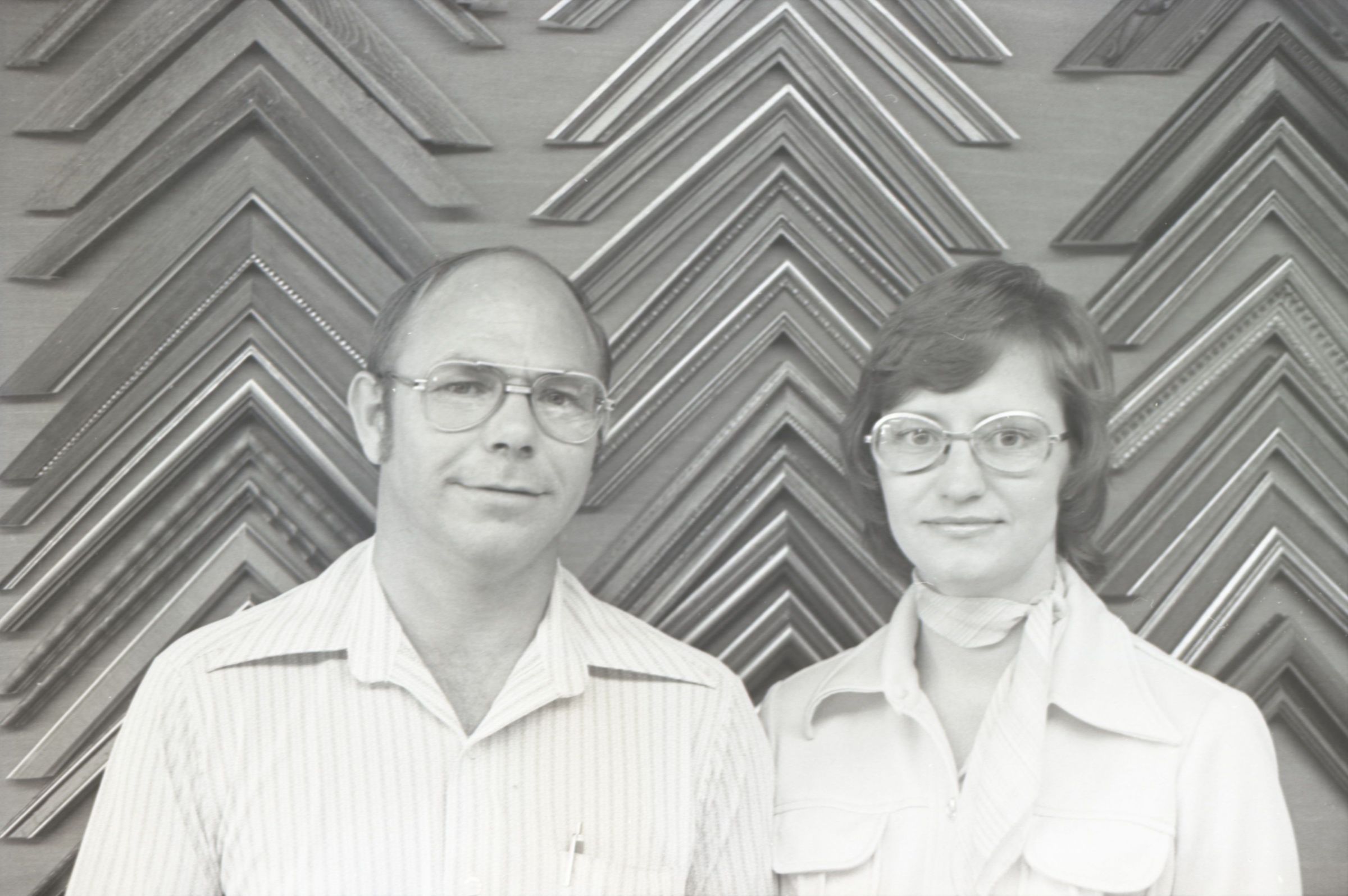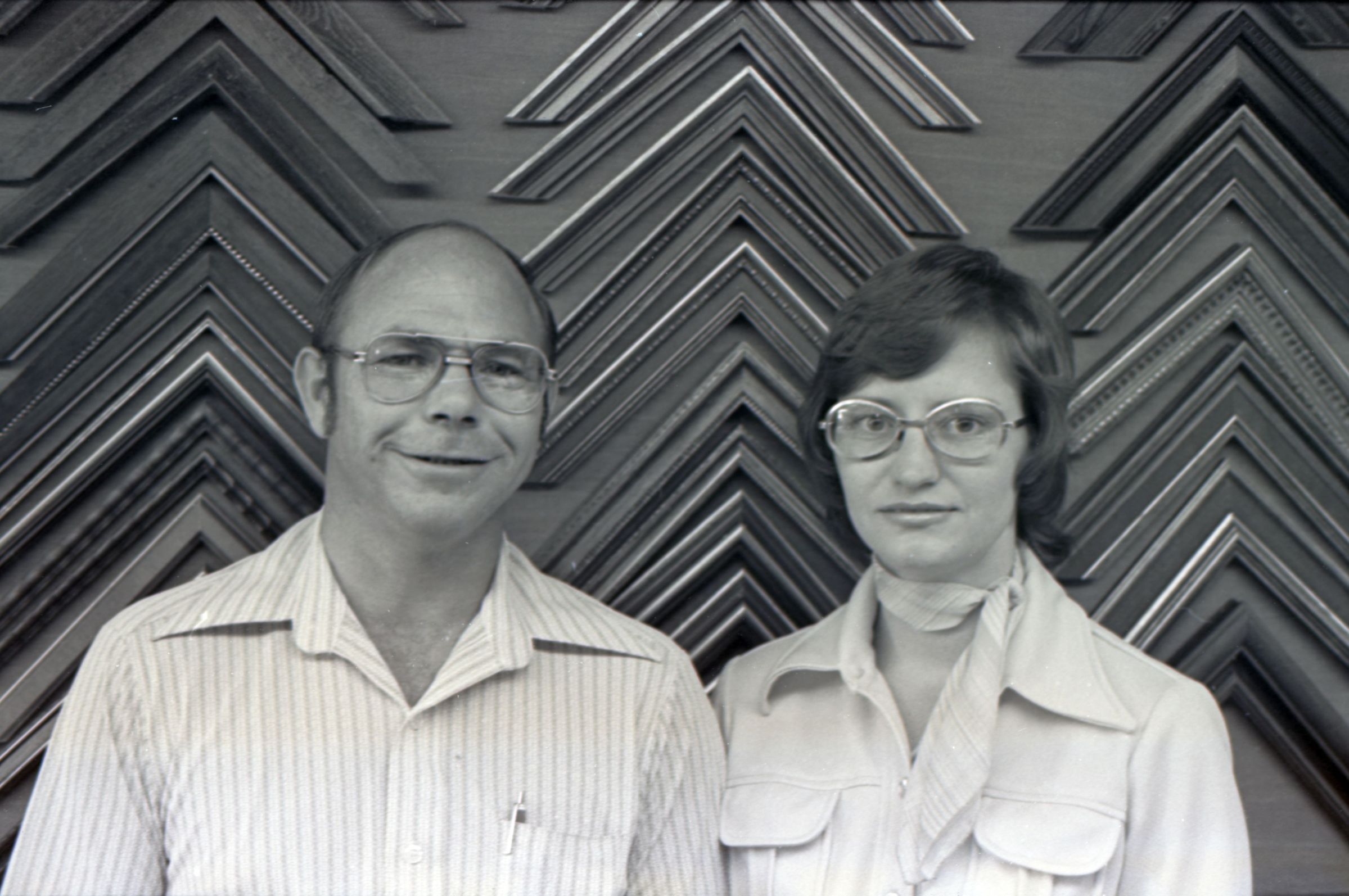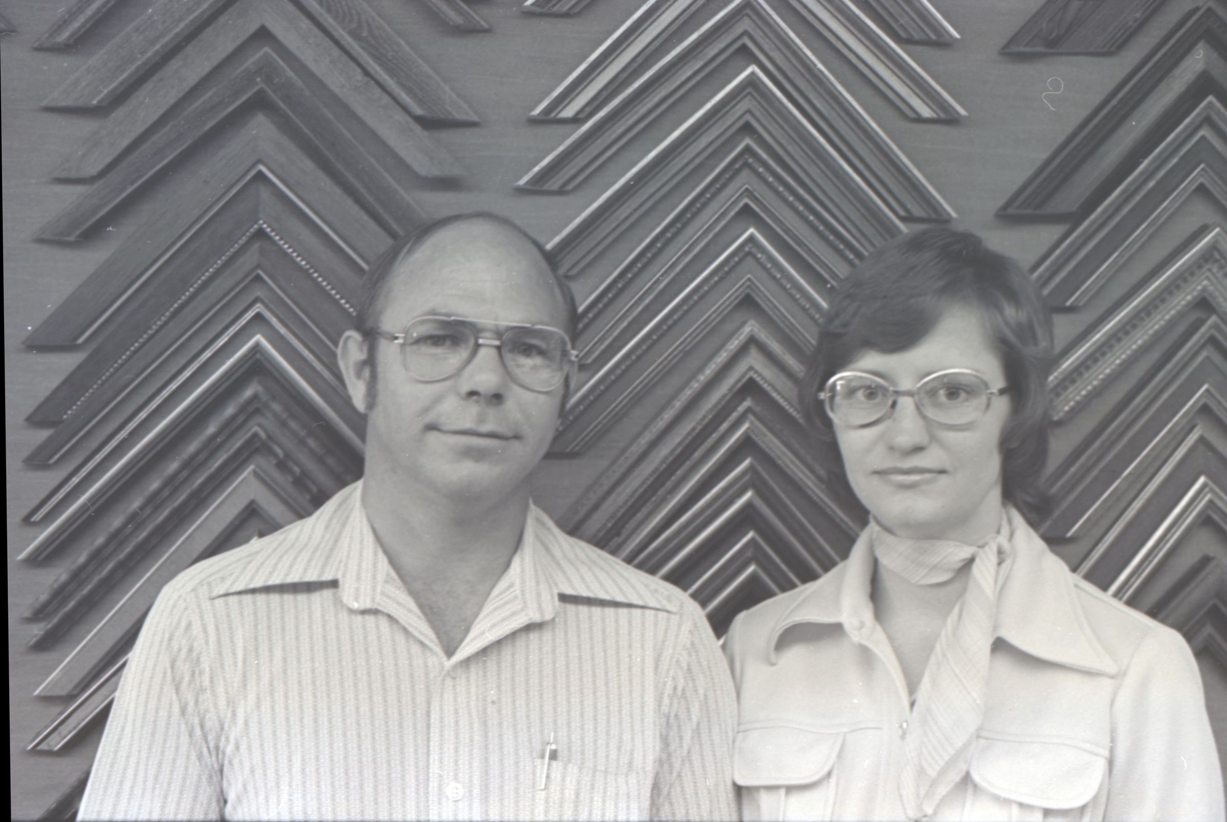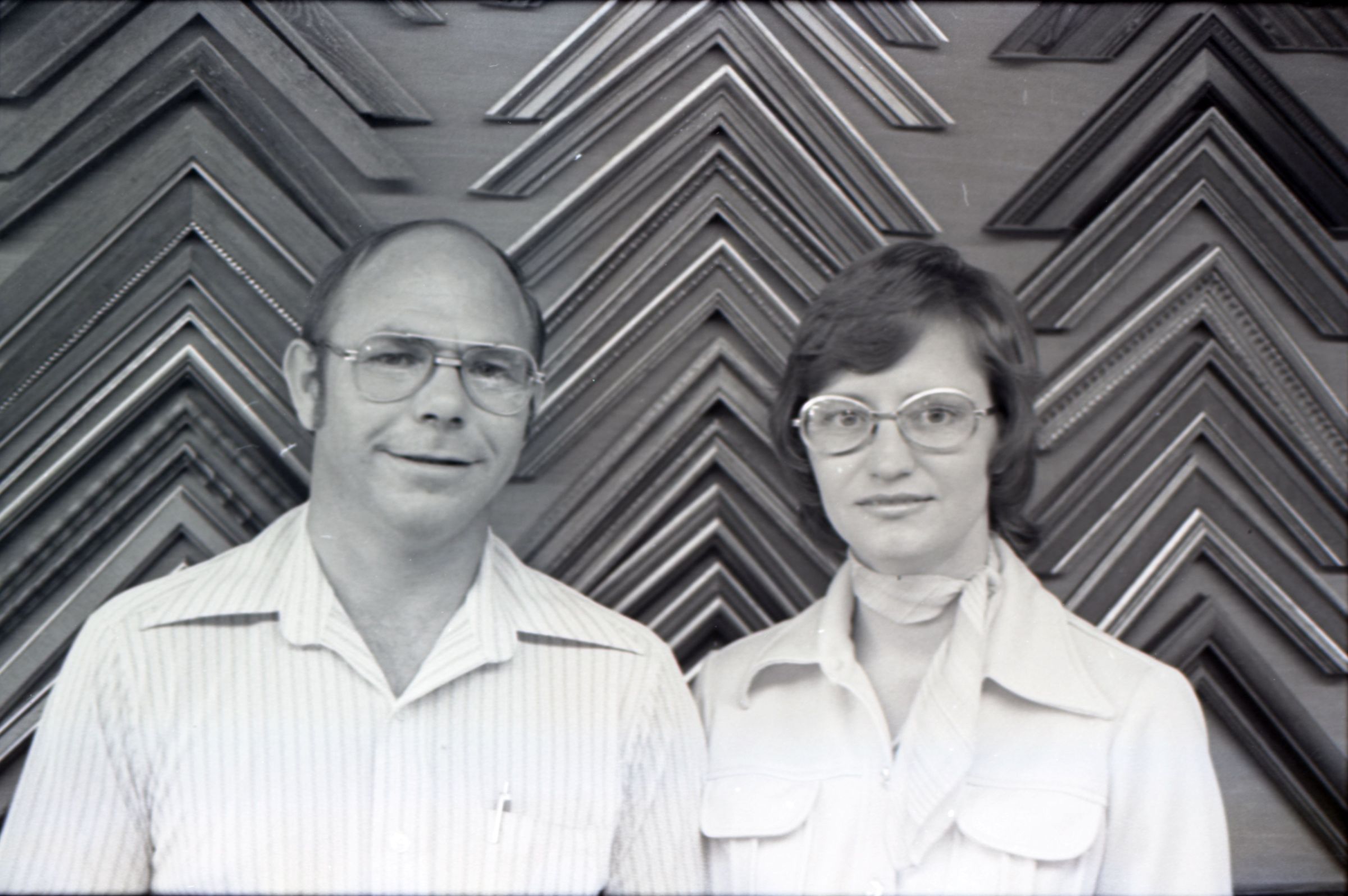 Frame Shop, 1976. These two black and white film negative strips were created for the Lacey Leader newspaper. These images show a man and a woman posing together for photos. The man is on the left in all of these images. He is balding and is wearing glasses and a pinstriped button-up shirt. The woman is on the right in all of these images. She has shoulder-length, wavy hair and is wearing glasses and a western-style shirt. They are both looking toward the camera in all of these images.Made/Created