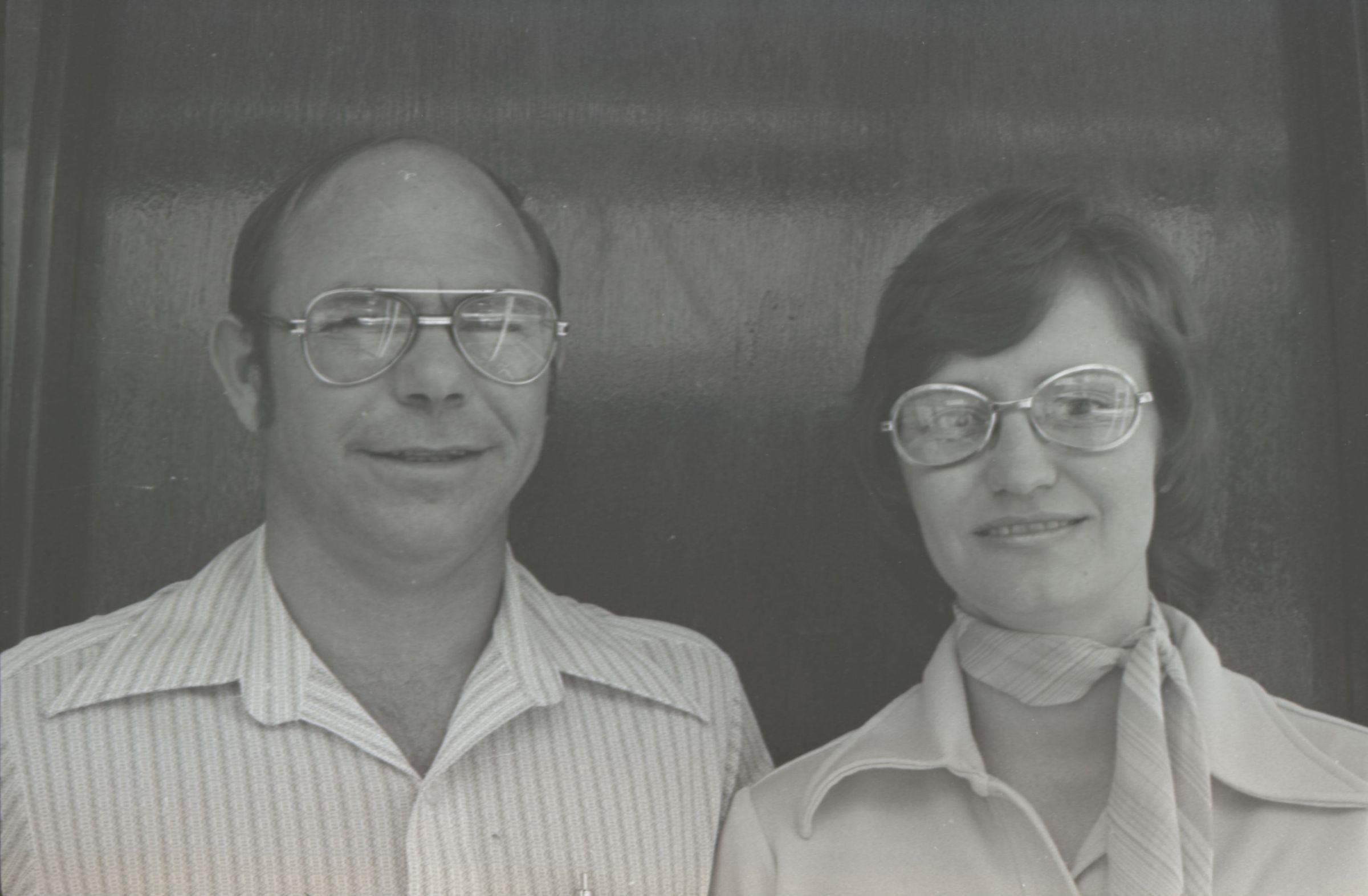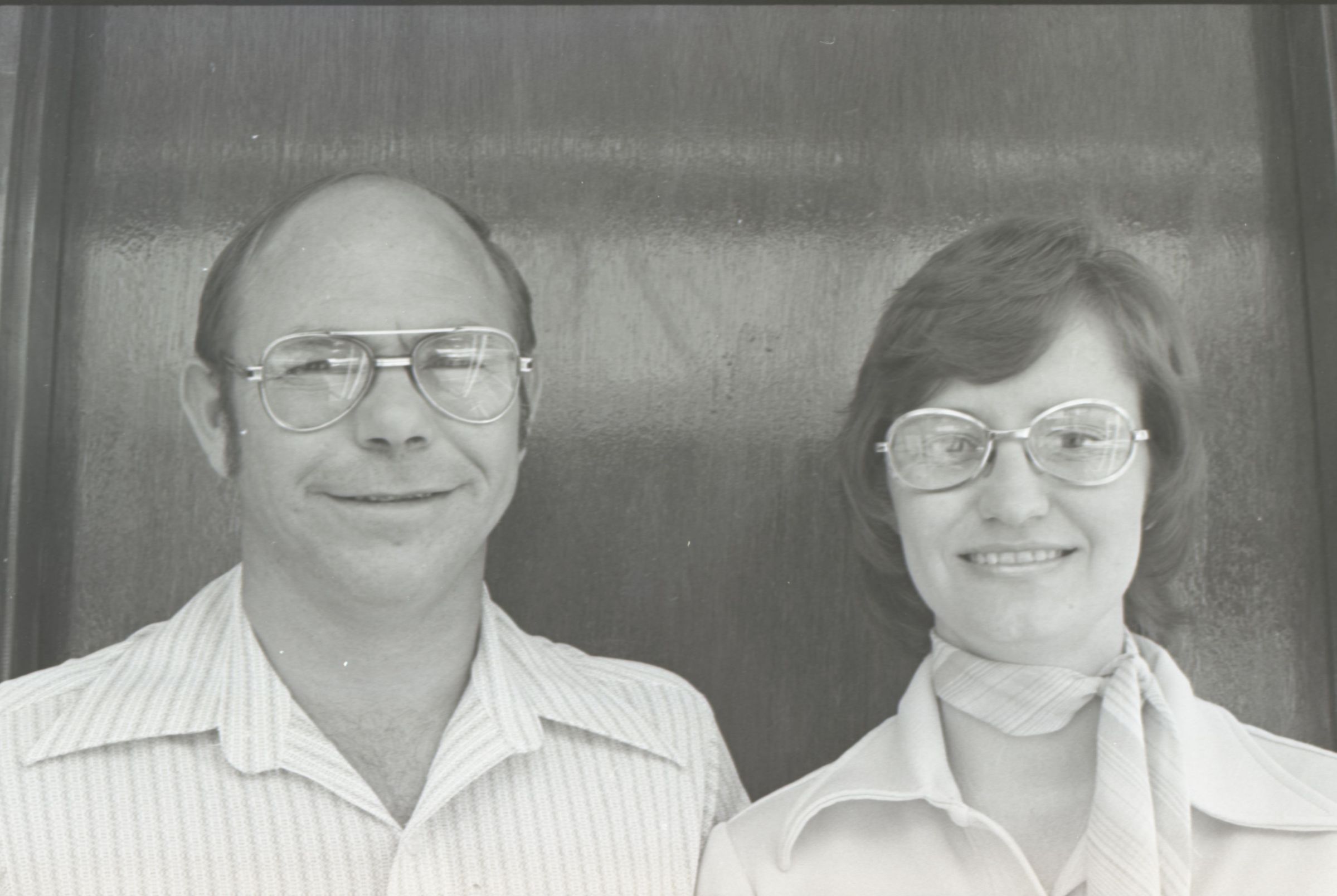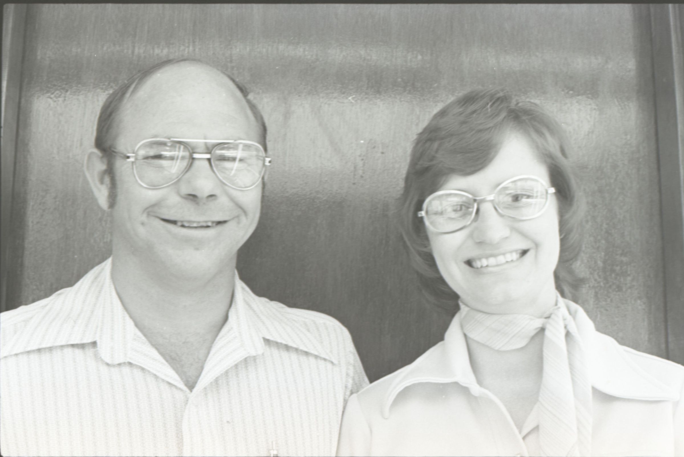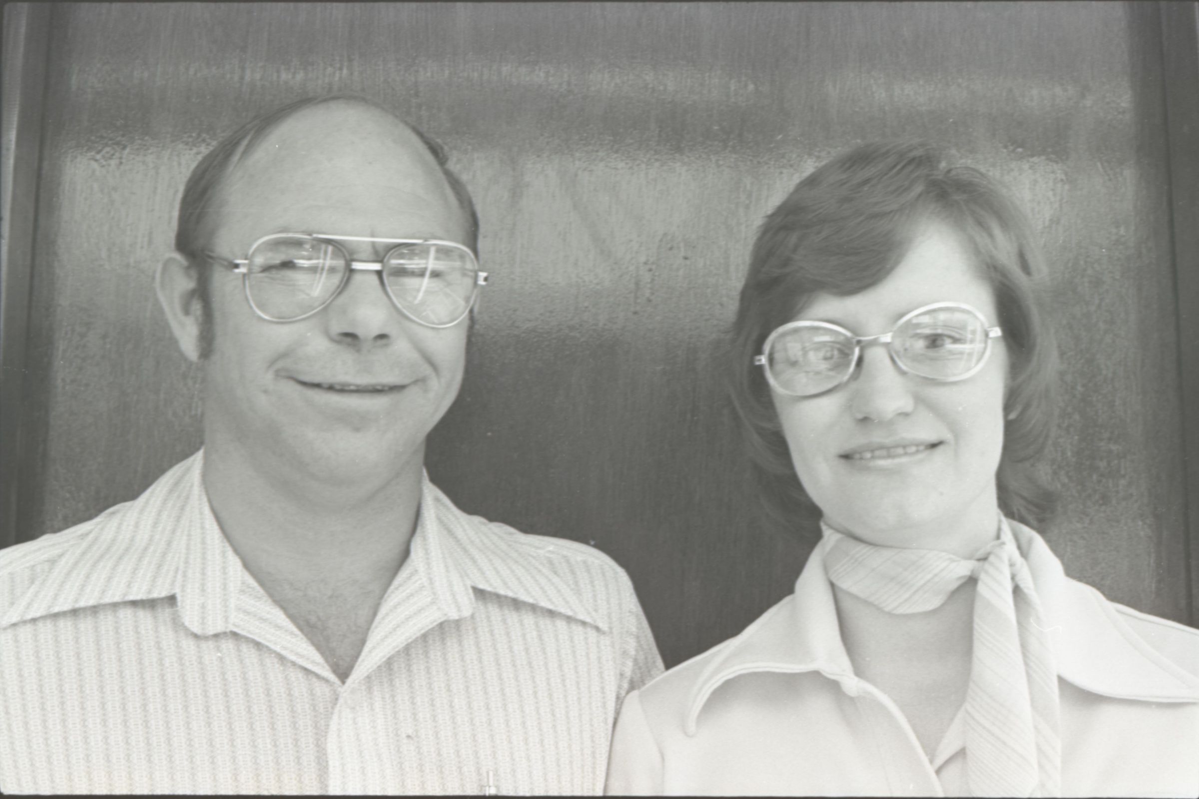 Frame Shop, 1976. These two black and white film negative strips were created for the Lacey Leader newspaper. These images show a man and a woman posing together for photos. The man is on the left in all of these images. He is balding and is wearing glasses and a pinstriped button-up shirt. The woman is on the right in all of these images. She has shoulder-length, wavy hair and is wearing glasses and a western-style shirt. They are both looking toward the camera in all of these images.Made/Created