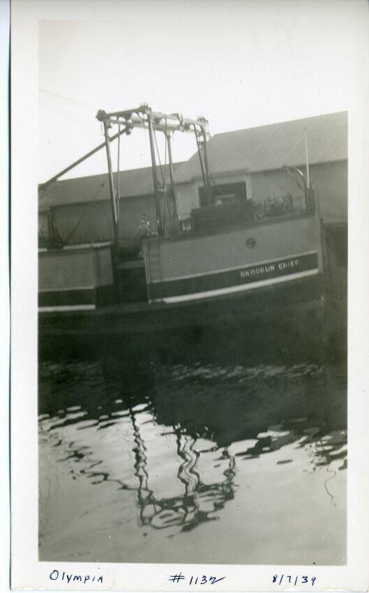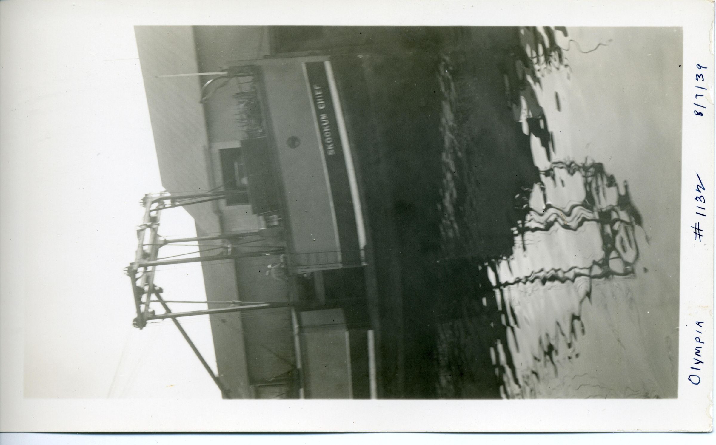 Black and white photo of a boat at Percival's Dock. There is water in the foreground and the boat has a black hull with gray deck railing. On the hull is painted "Skookum Chief".There is a metal superstructure on the deck that is called the elevator. Buildings are visible behind the boat, and wires can be seen in the sky above the boat. There is a white border on all sides, and in the bottom border is "Olympia #1132 8/7/39". On the back is an oval stamp that says "certainteed guaranteed Aug 11 1939 process". A stamp says "80".