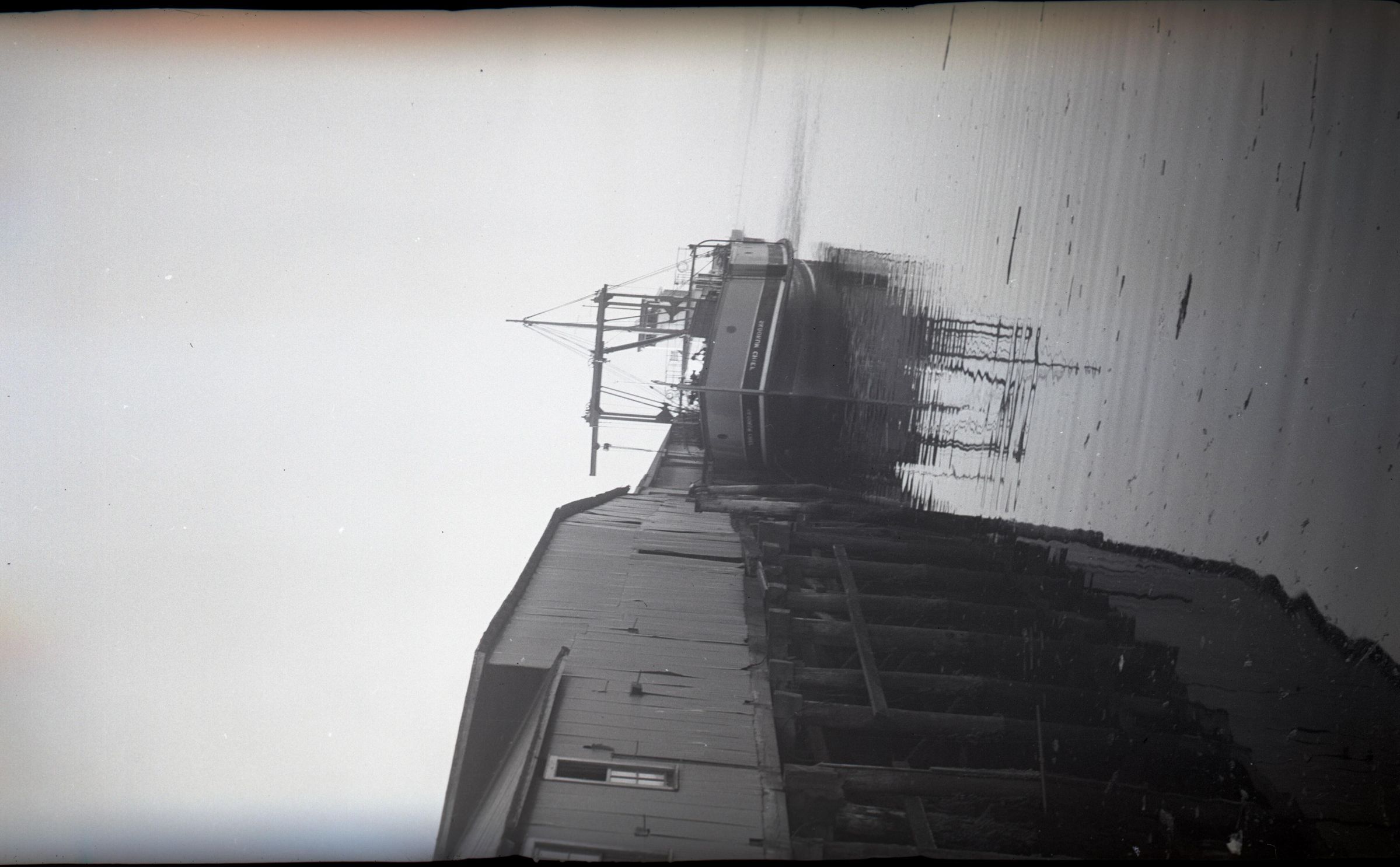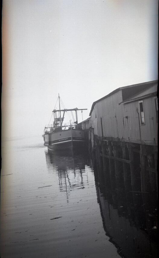 Black and white negative of a boat at Percival's Dock. There is water in the foreground and to the left of the image. The boat is in the center of the image and is bow-on to the camera. To the right is the dock with pilings below and an enclosed building above. There is a white border on all sides, and in the bottom border is "Olympia #1133 8/7/39".