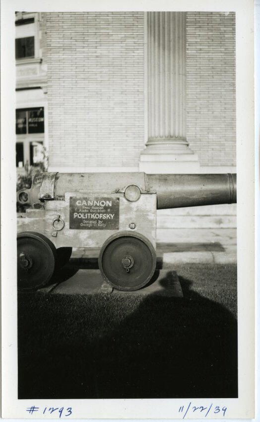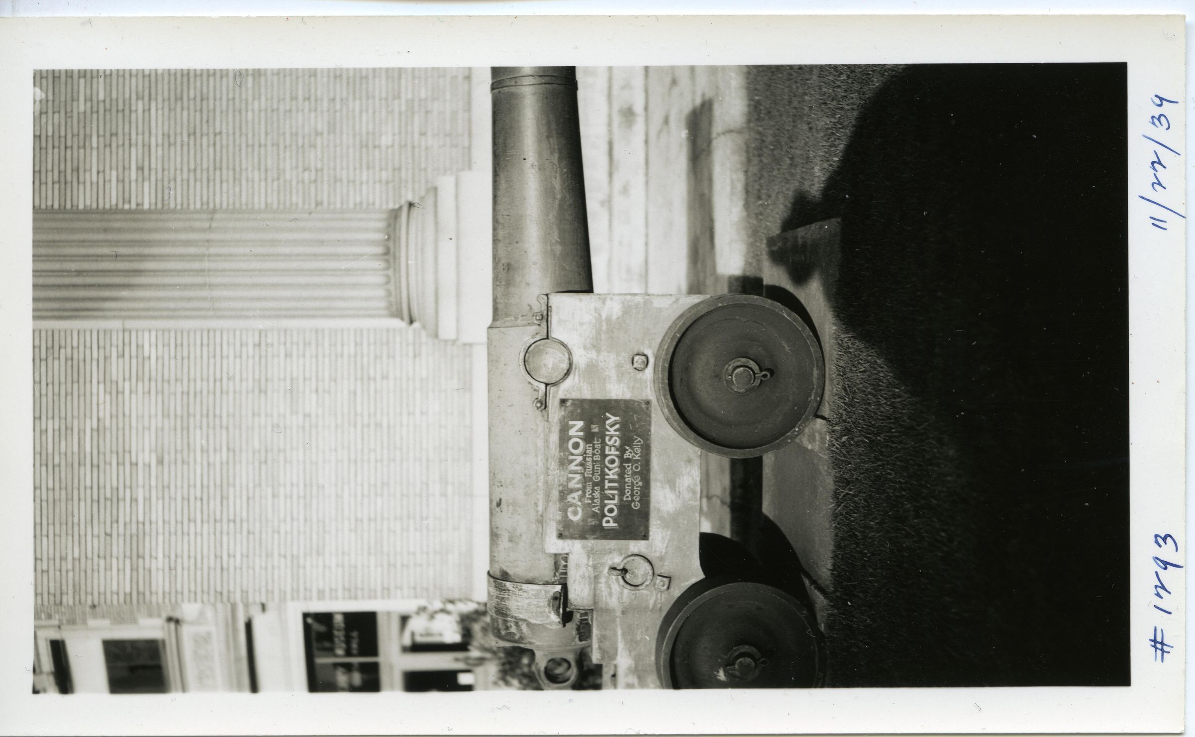 Black and white photo of a cannon at the Historical Society Building in Tacoma. In the foreground is a shadow of a person, probably the photographer. The cannon is in the center of the image, and has two large wheels visible. Above that is the carriage which has a plaque on the side with writing, that which is readable says "cannon politkofsky". There is a key ring hanging on the side. Above the carriage is the barrel of the cannon, with a pivot rod on the carriage. Behind the cannon is a building with a column and a brick wall. At the left is windows of a building. There is a white border on all sides, and in the bottom border is "#1293 11/22/39". On the back is stamped "413".