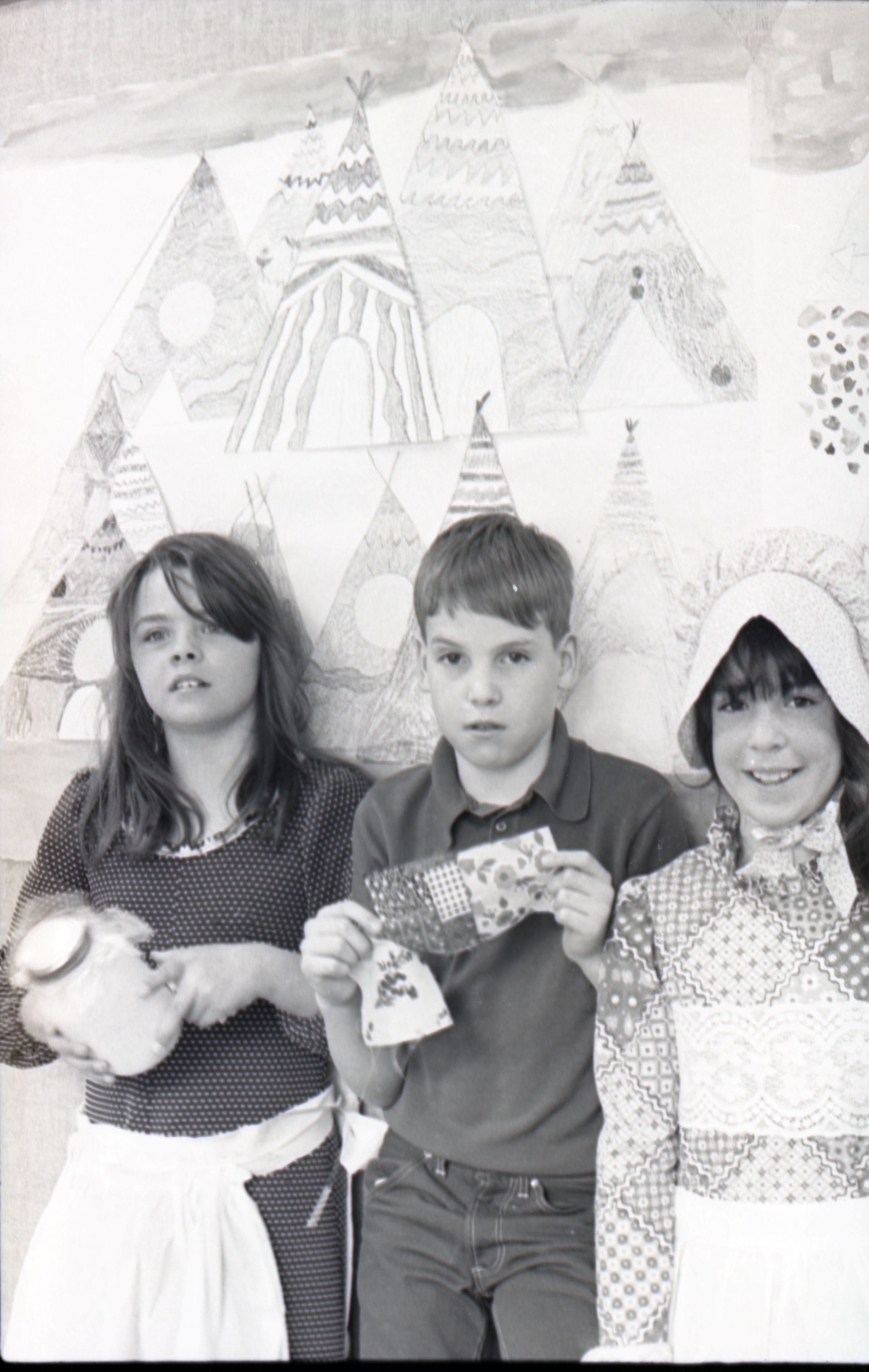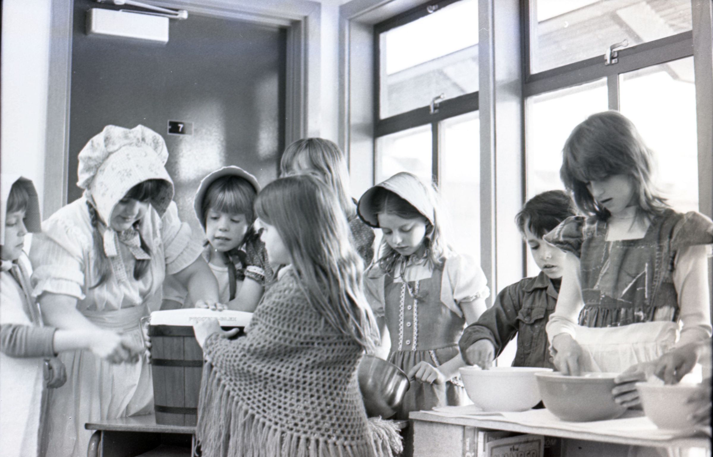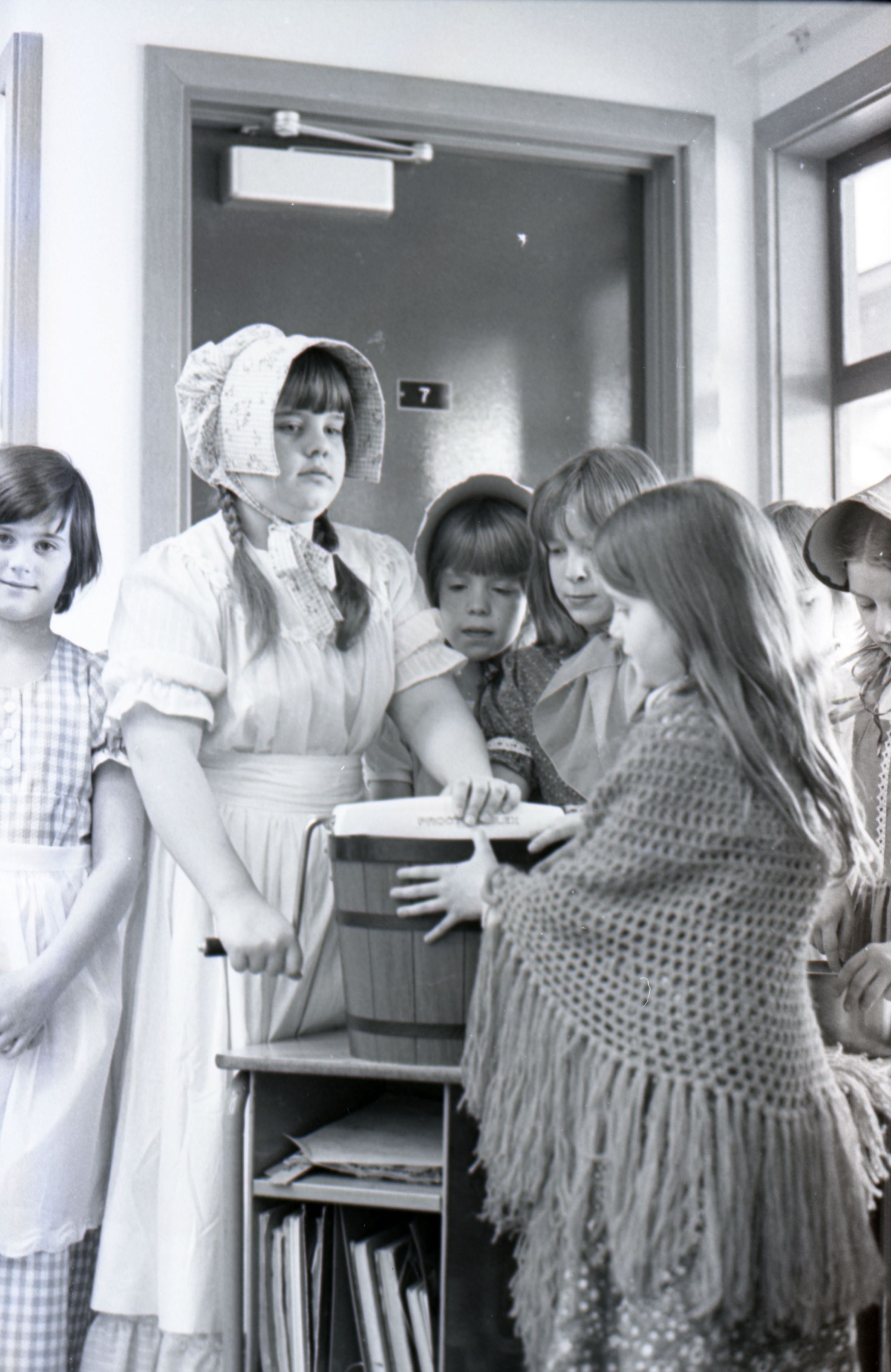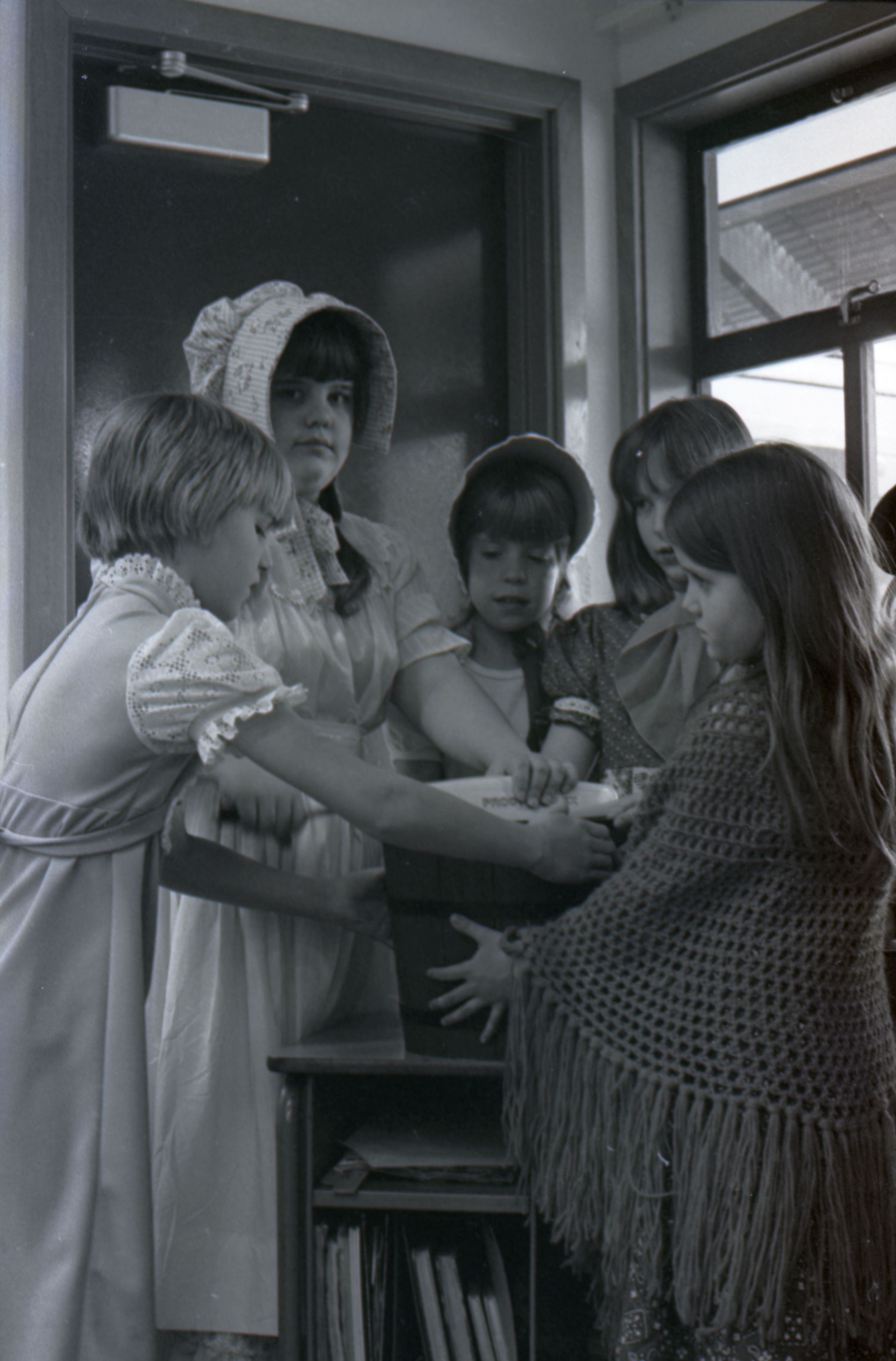 The images in group "c" show a group of children and several adults engaged in what appears to be a "Pioneer Days"-type set of educational activities.