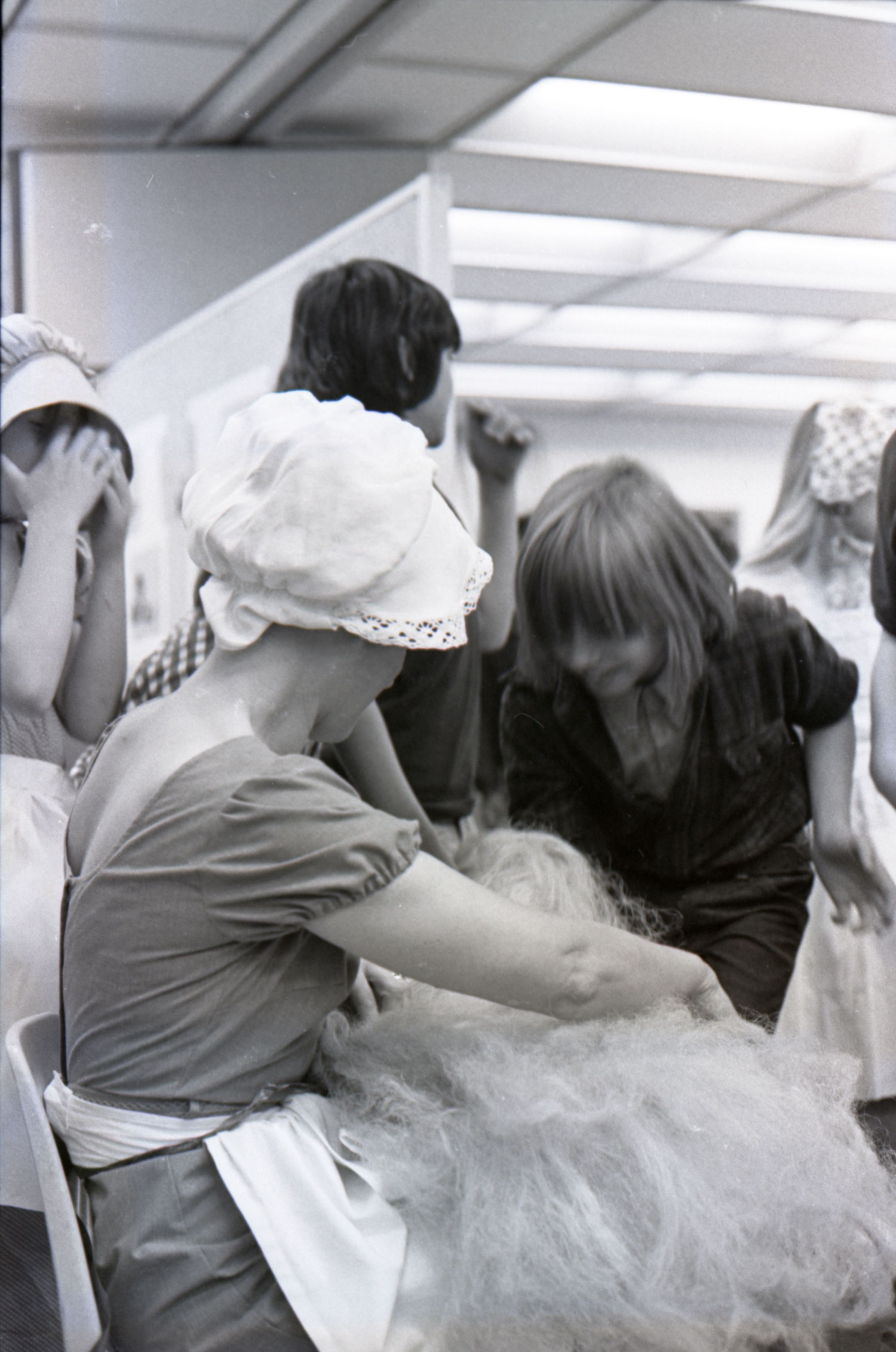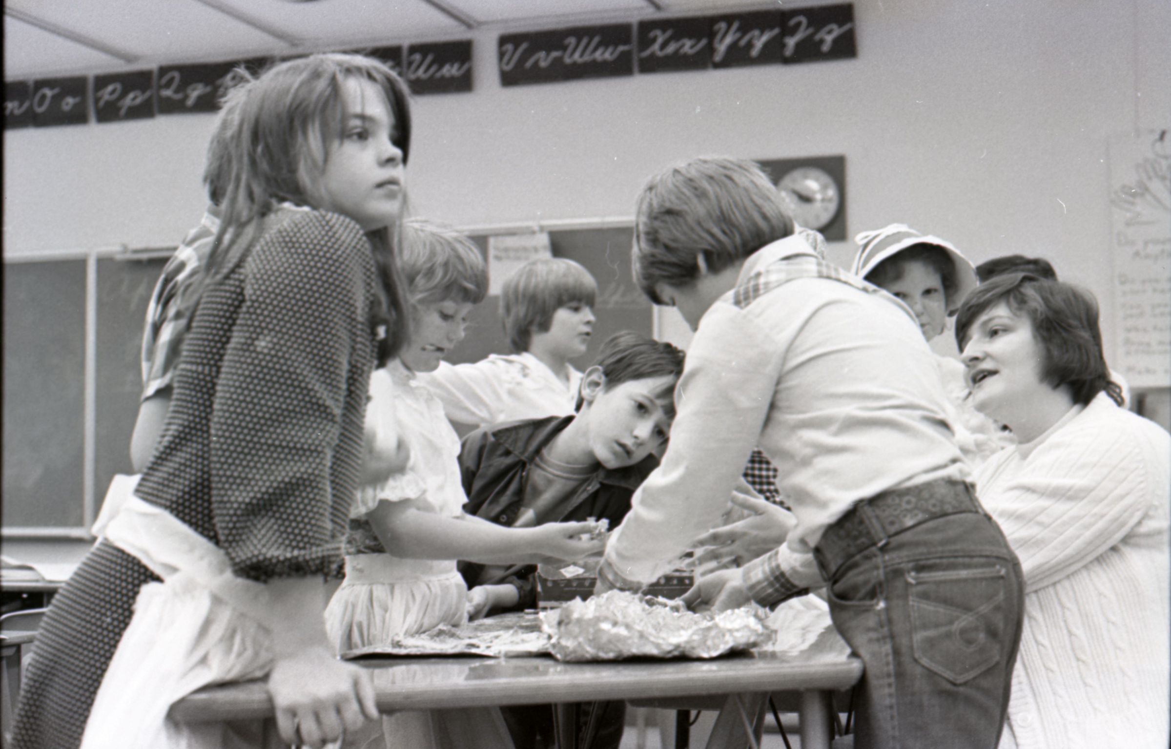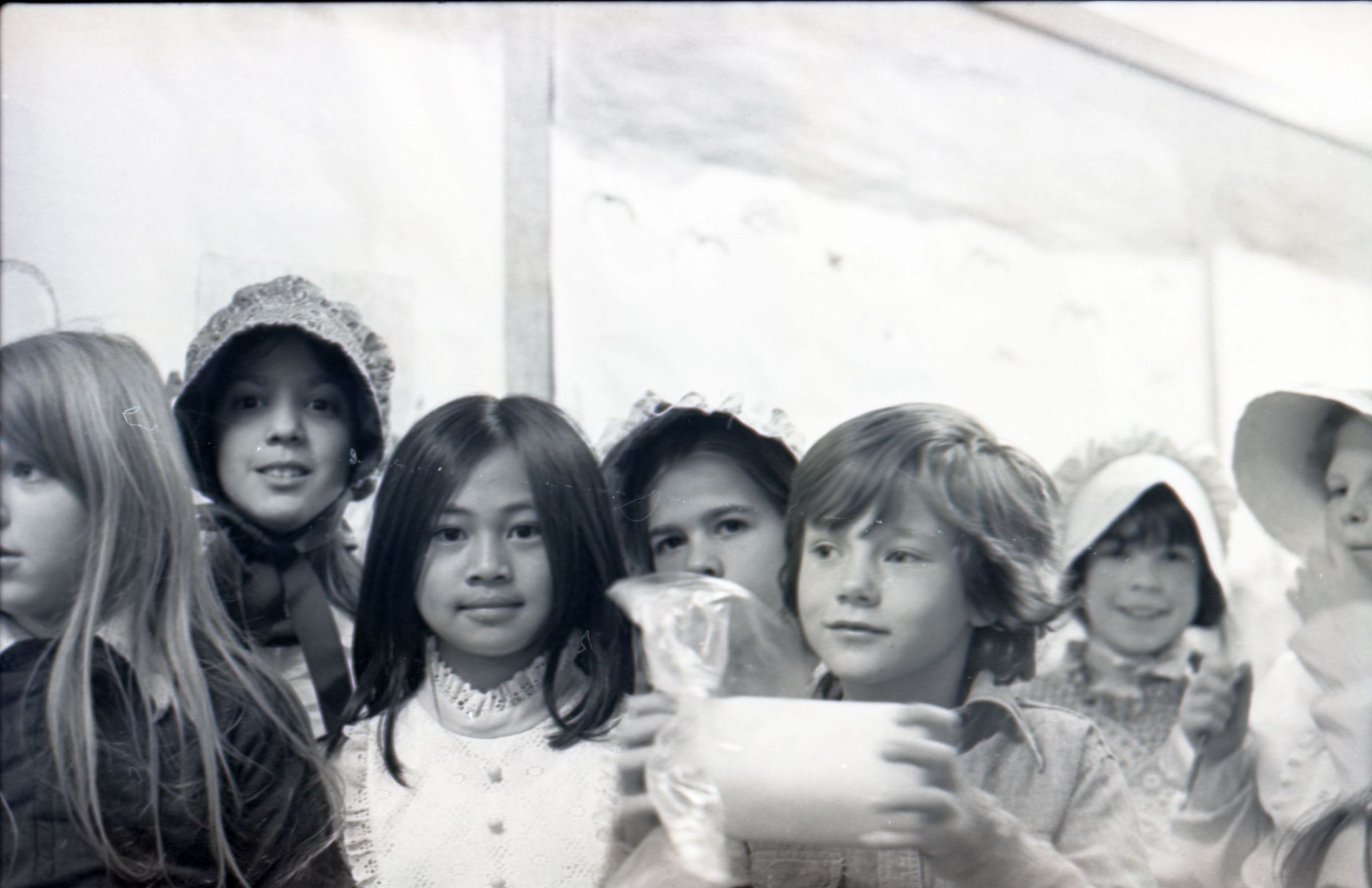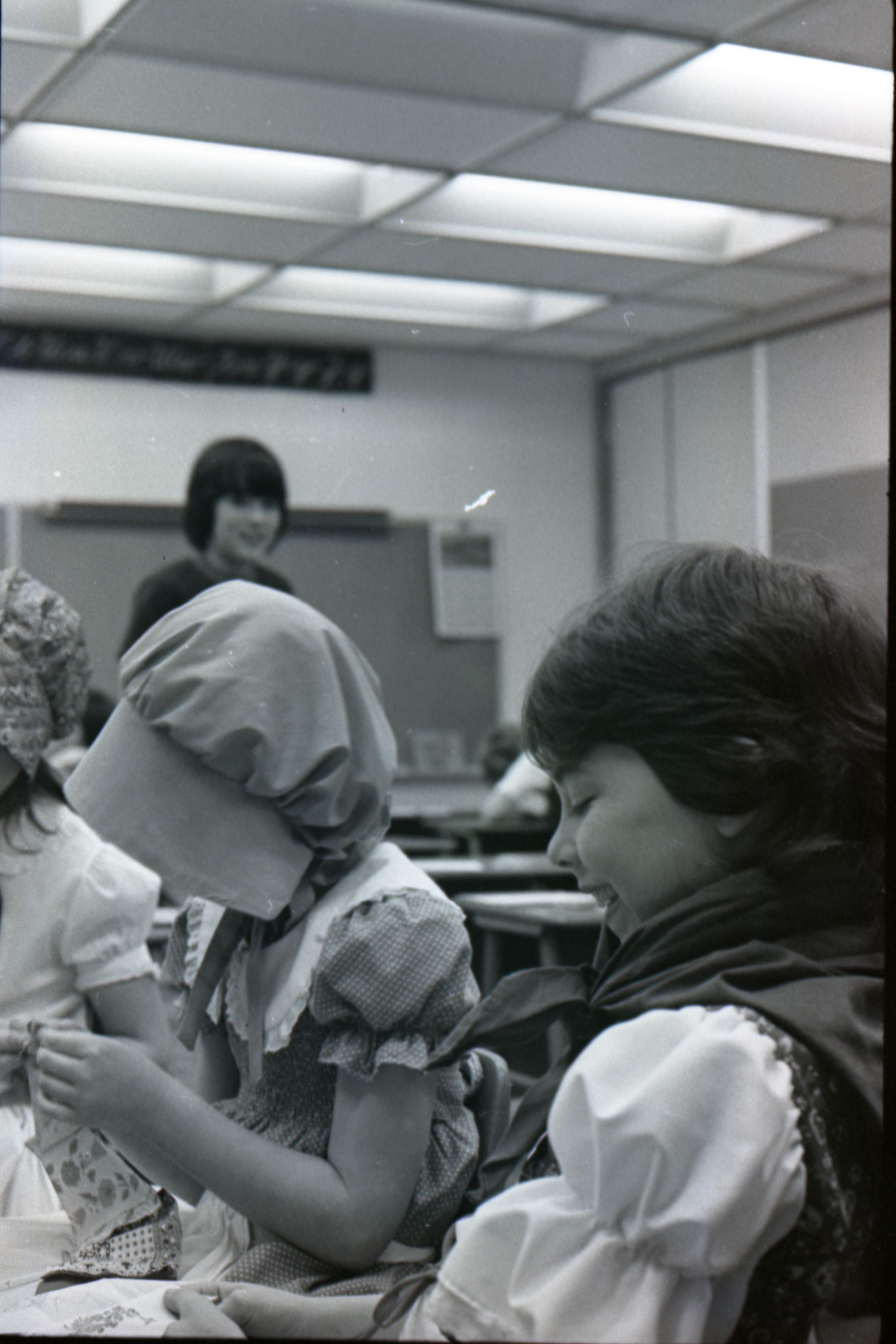 The images in group "c" show a group of children and several adults engaged in what appears to be a "Pioneer Days"-type set of educational activities.