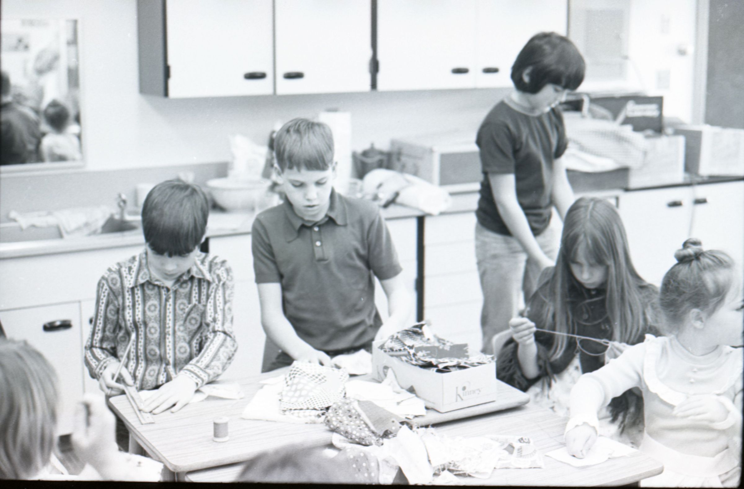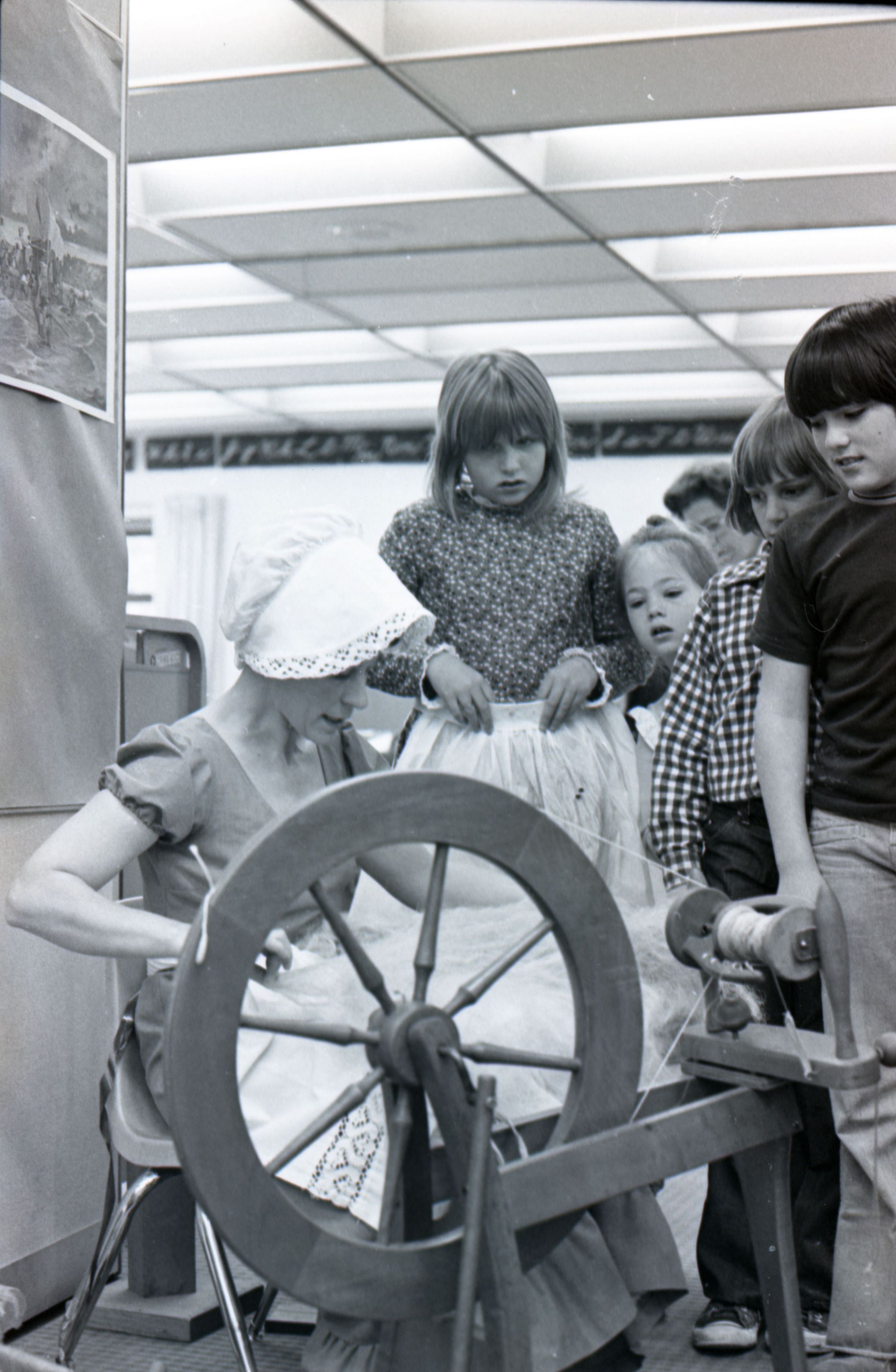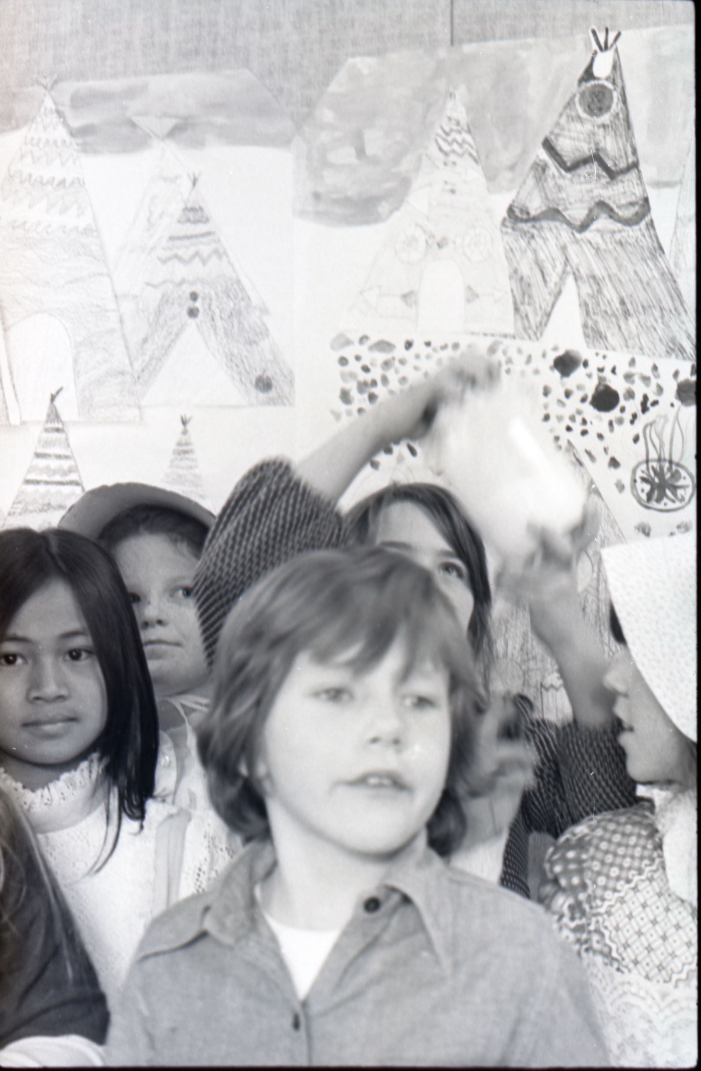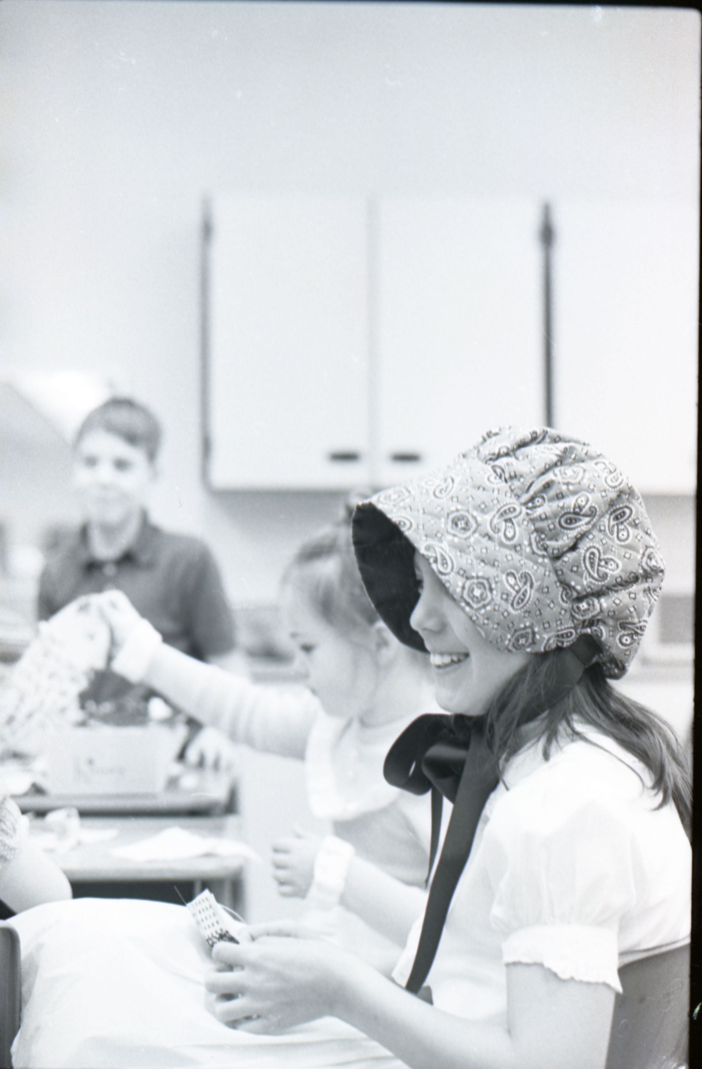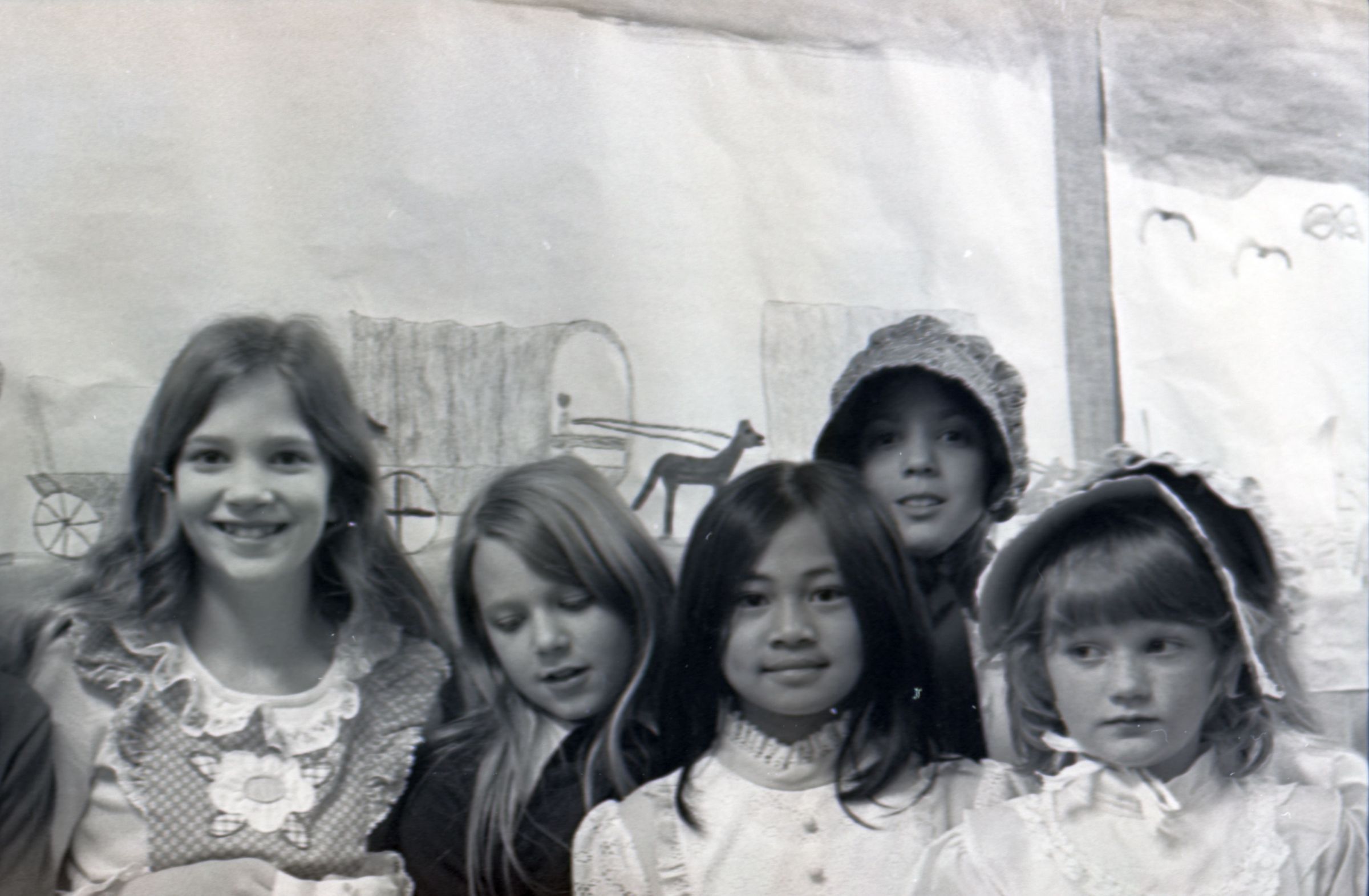 The images in group "c" show a group of children and several adults engaged in what appears to be a "Pioneer Days"-type set of educational activities.