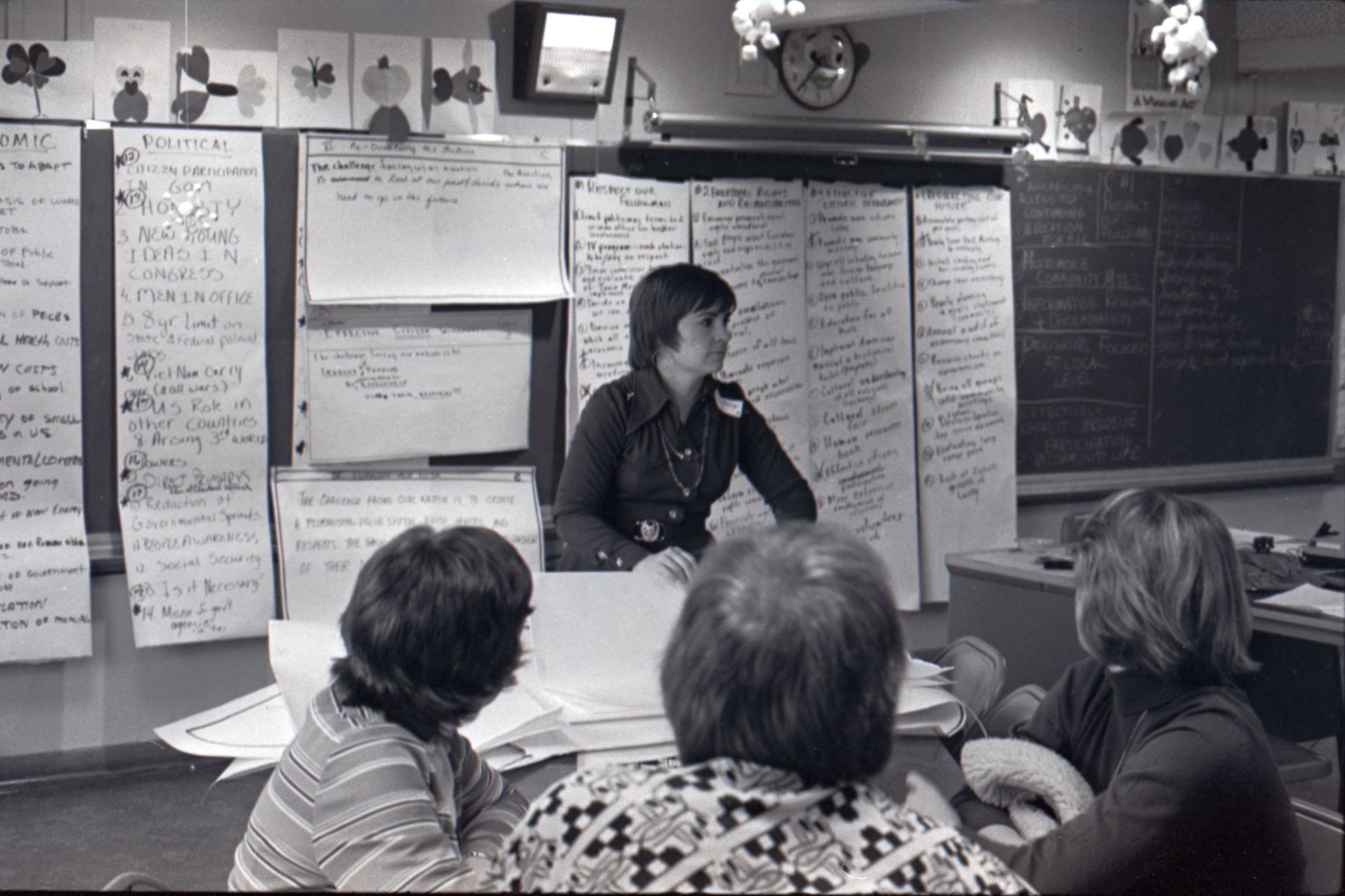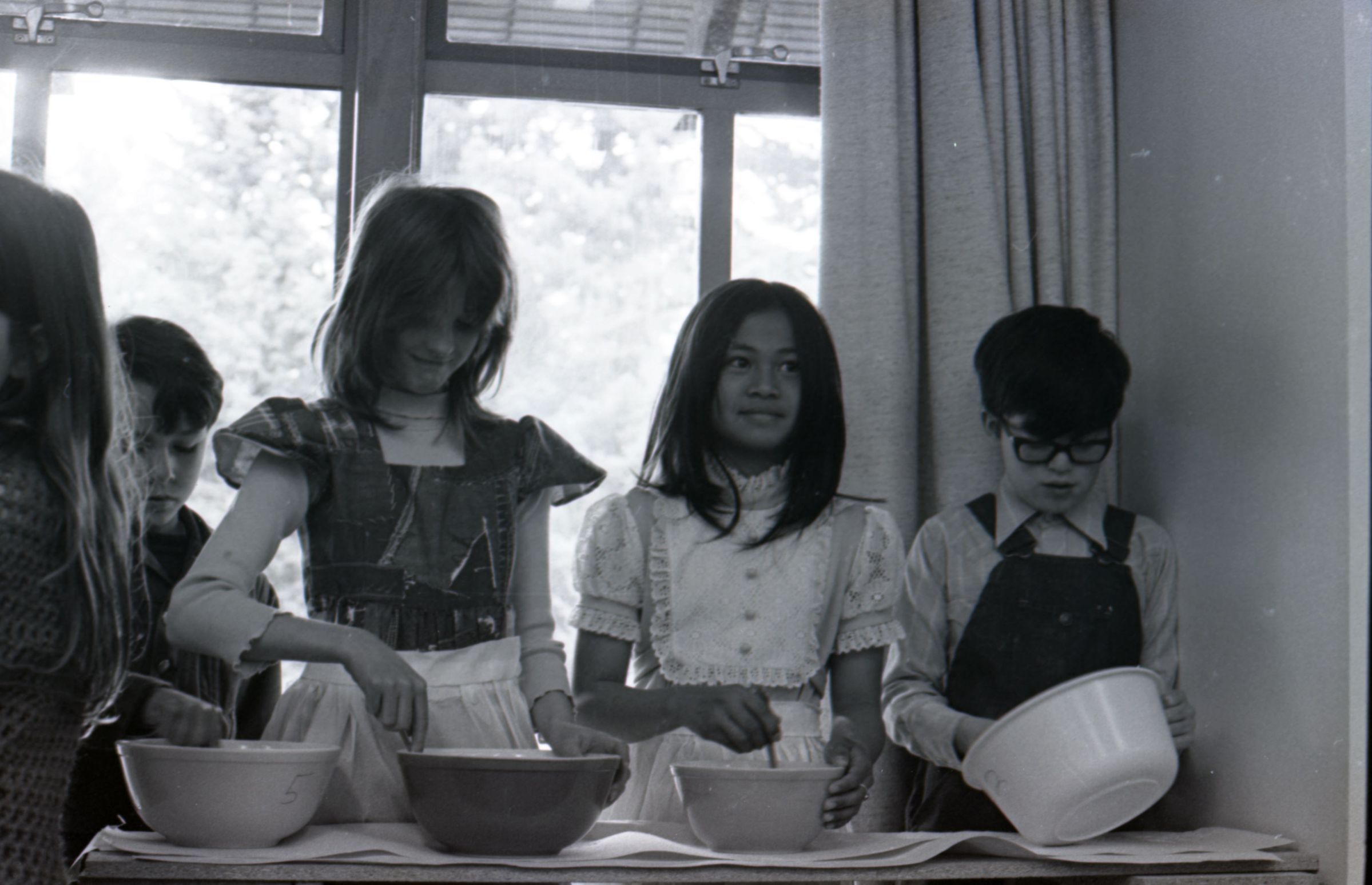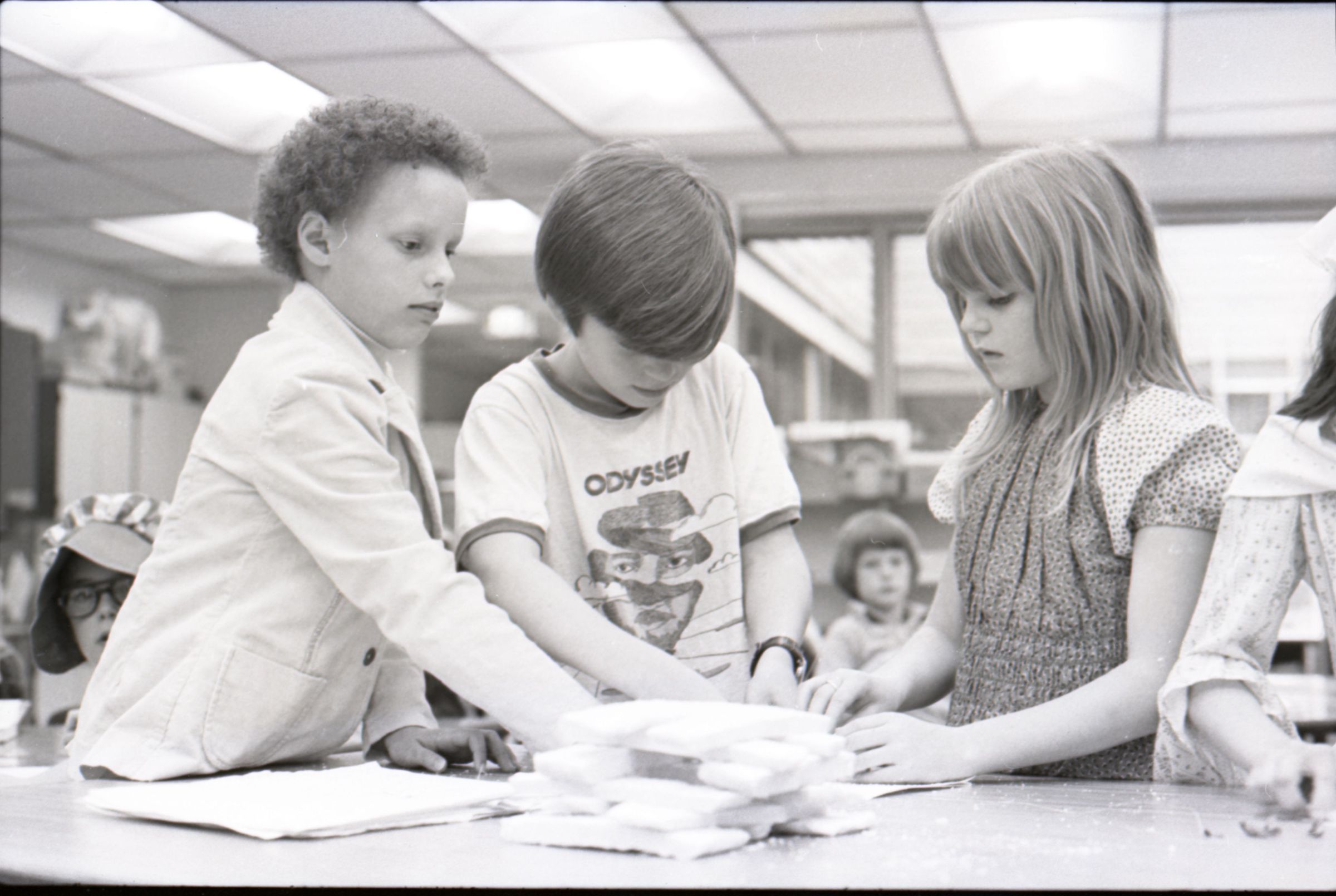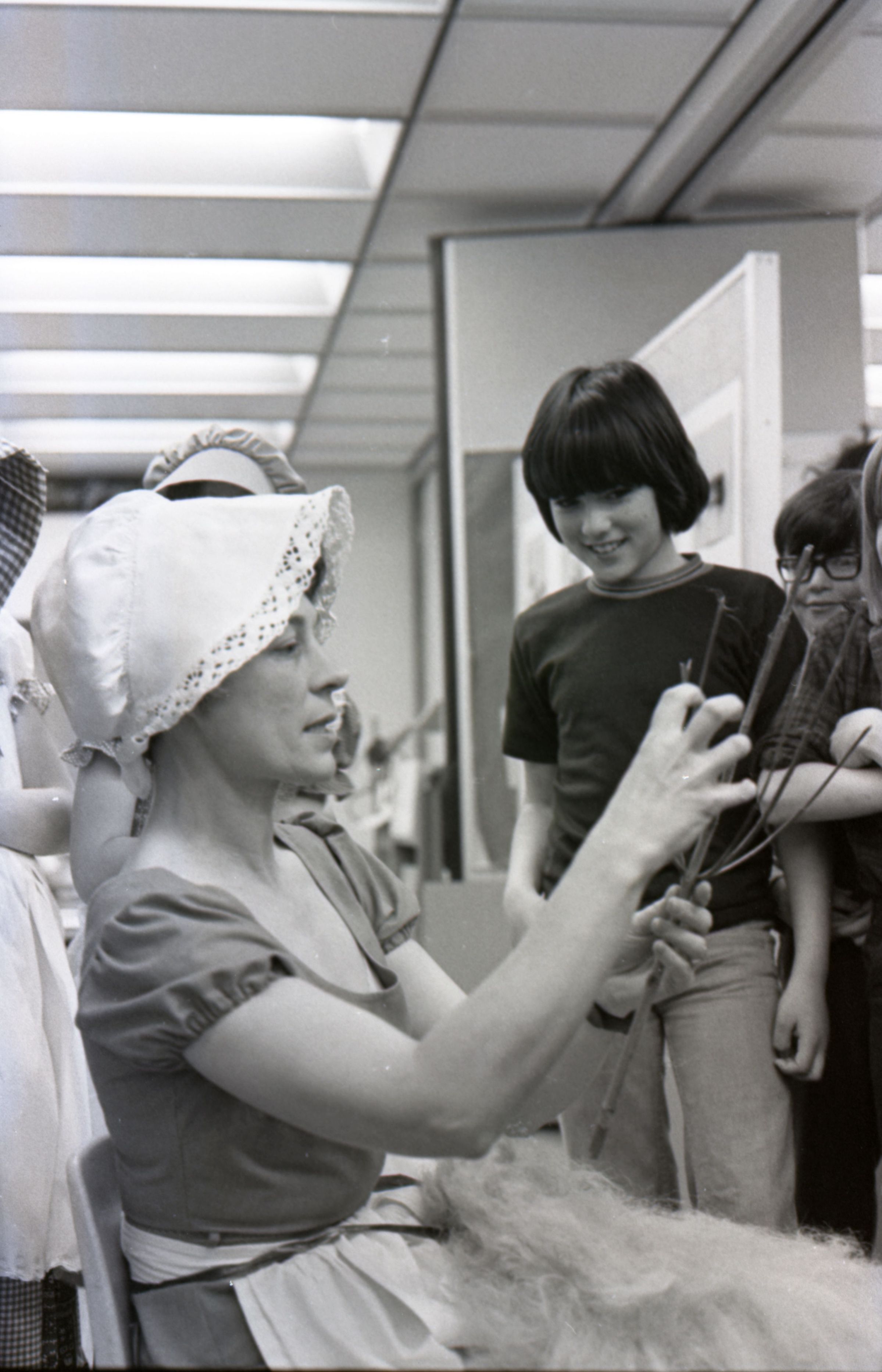 The images in group "c" show a group of children and several adults engaged in what appears to be a "Pioneer Days"-type set of educational activities.