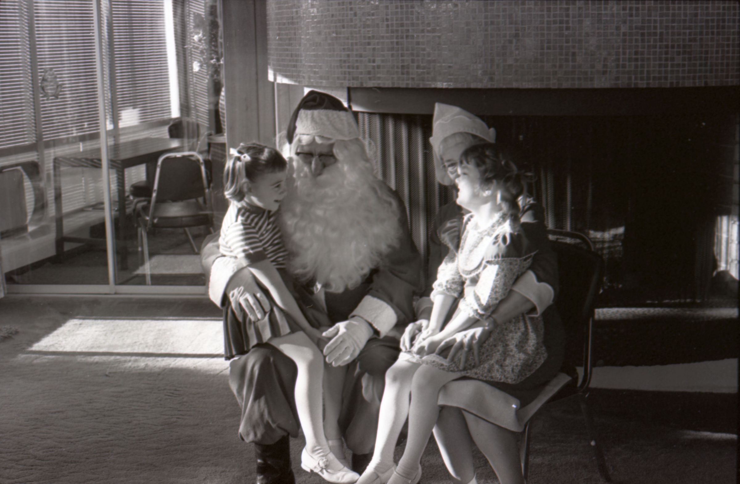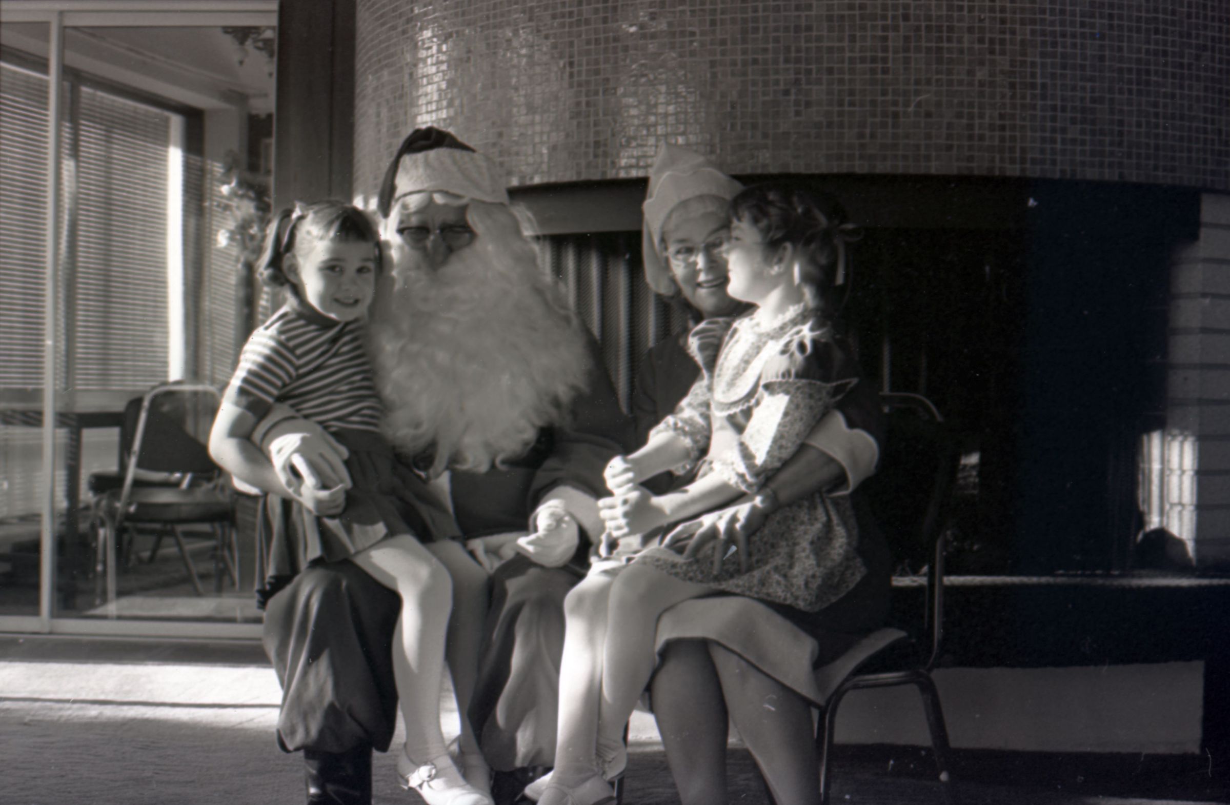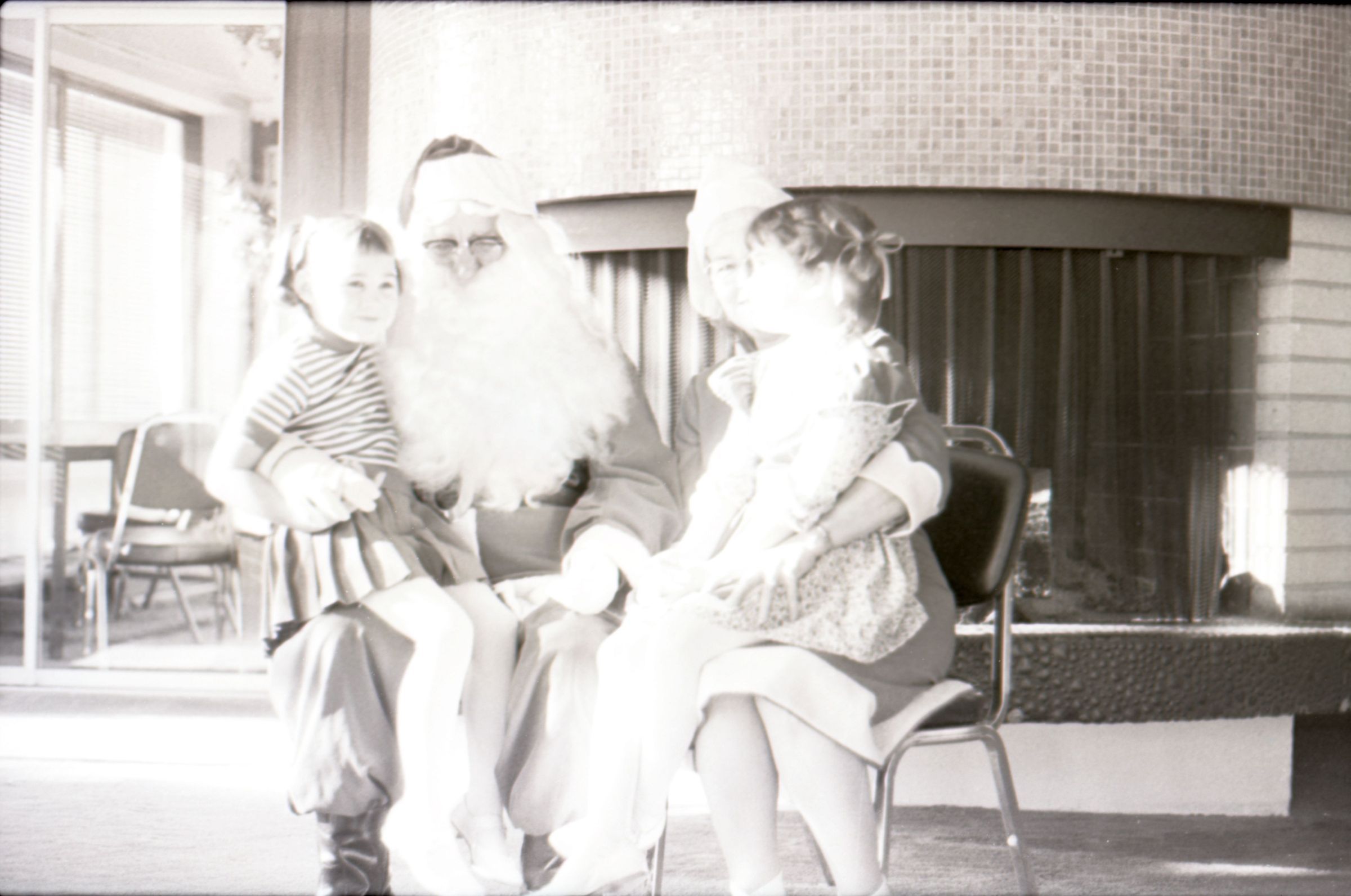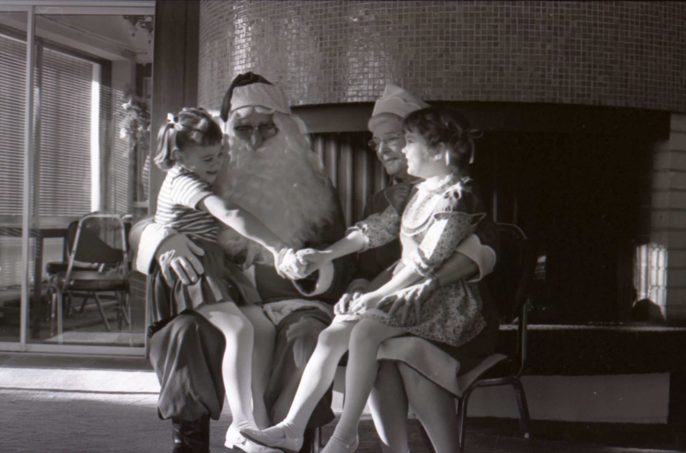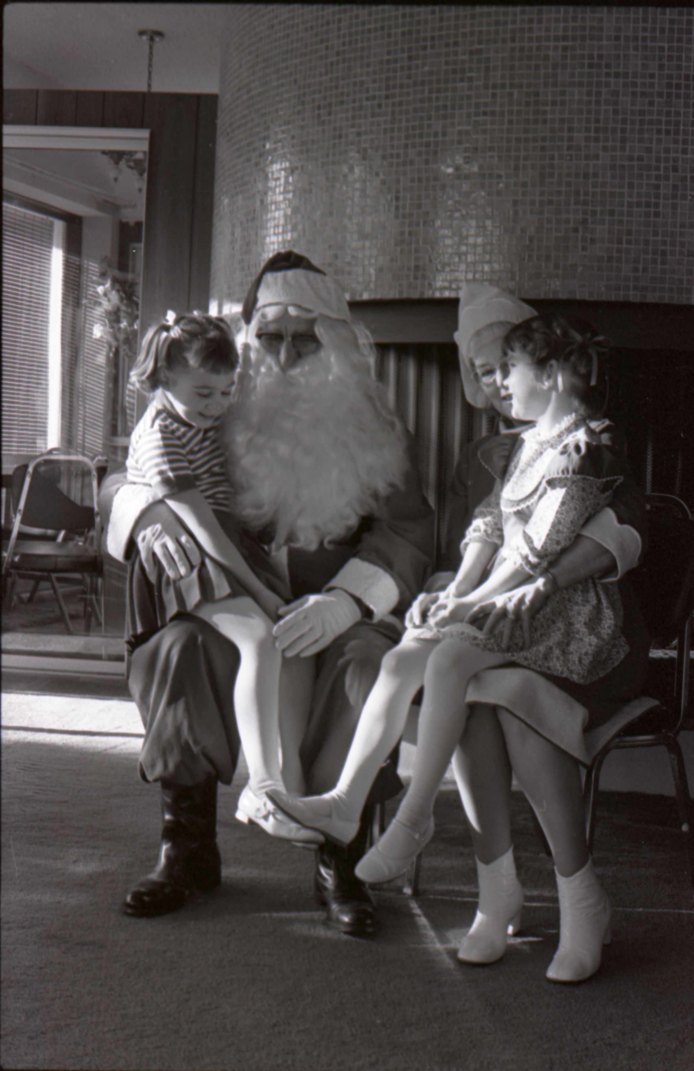 The images in group "f" show children sitting on Santa Claus and Mrs. Claus's laps, a storefront, and a man cutting a birthday cake and opening presents.